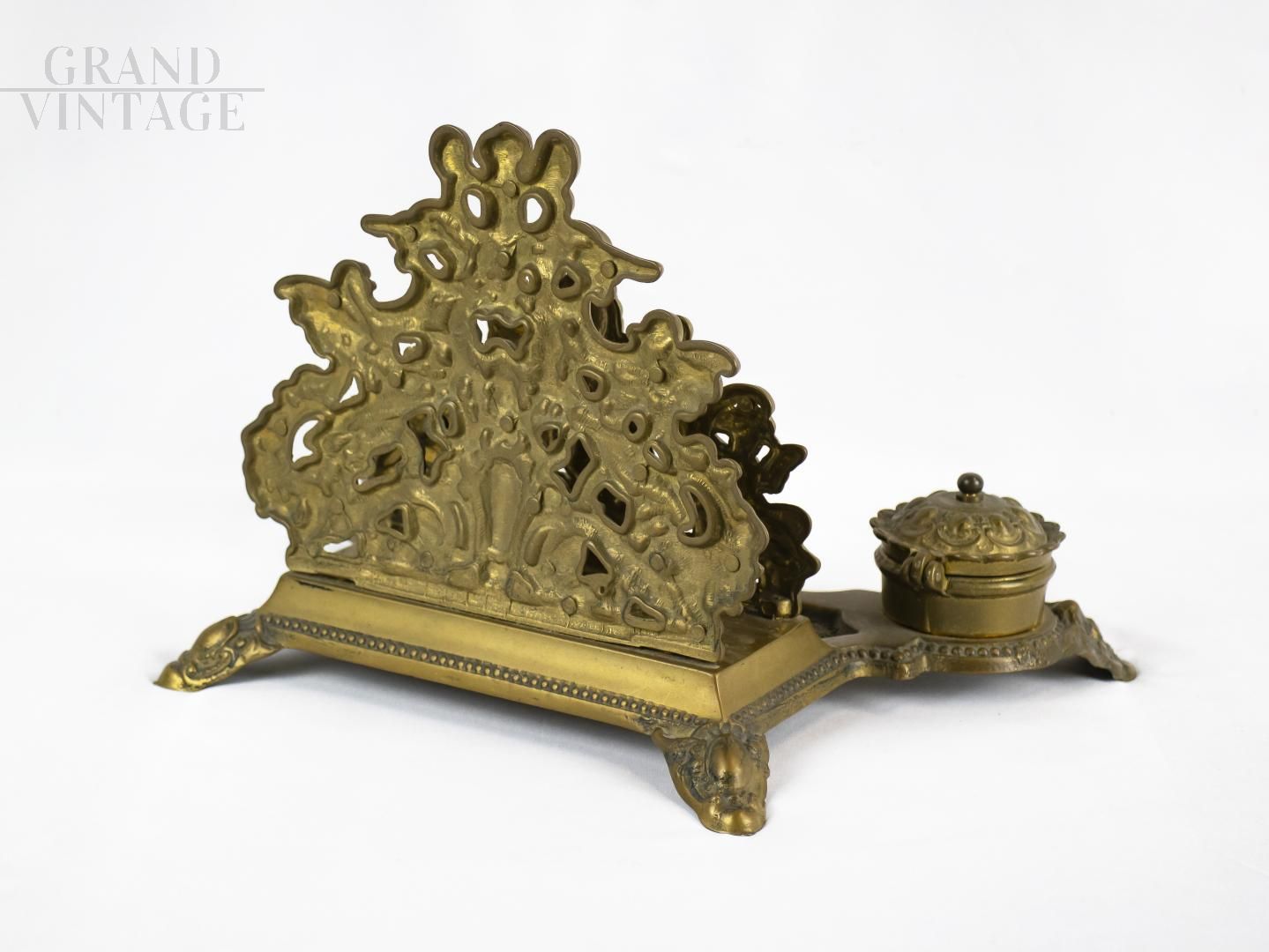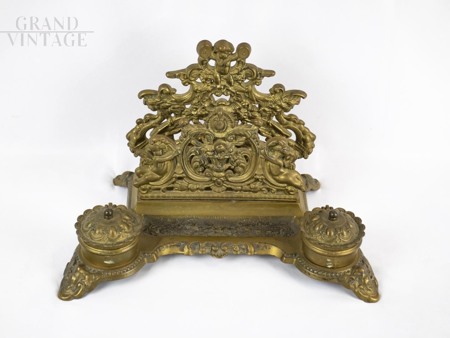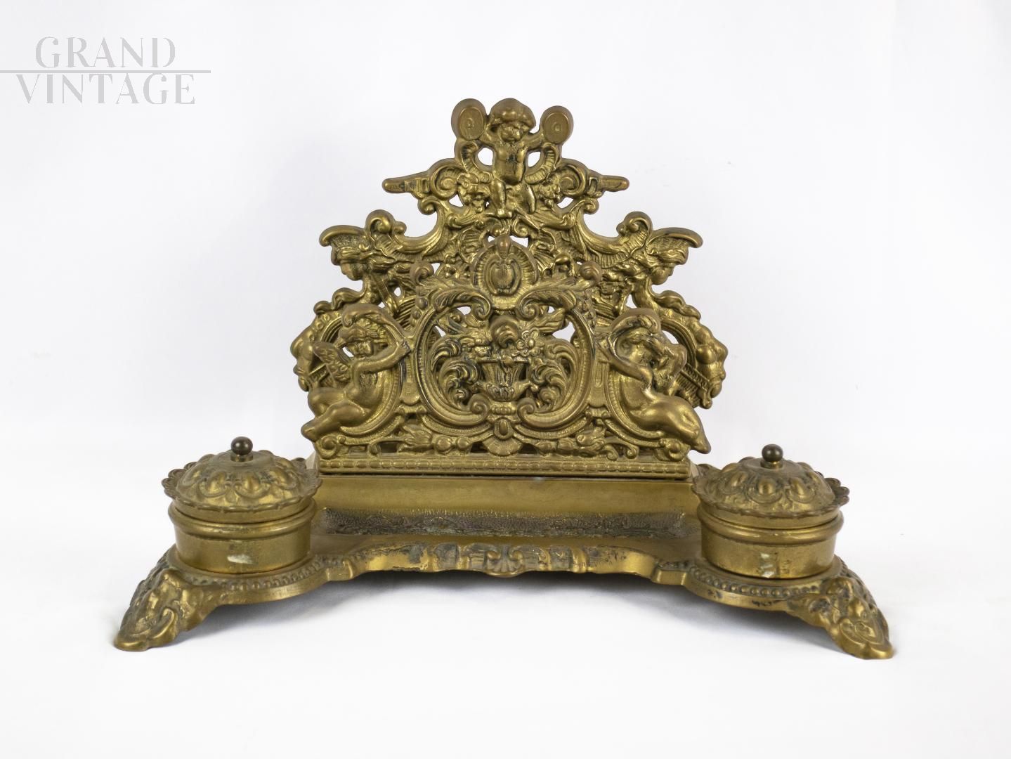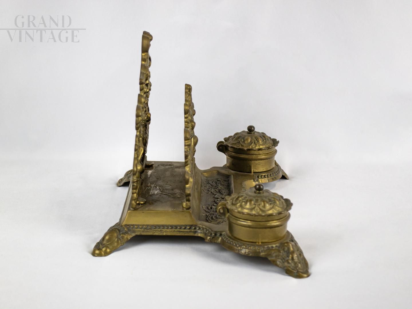 Double inkwell with desk letter holder in solid brass, 19th century. The two small vases are missing (easily replaceable).