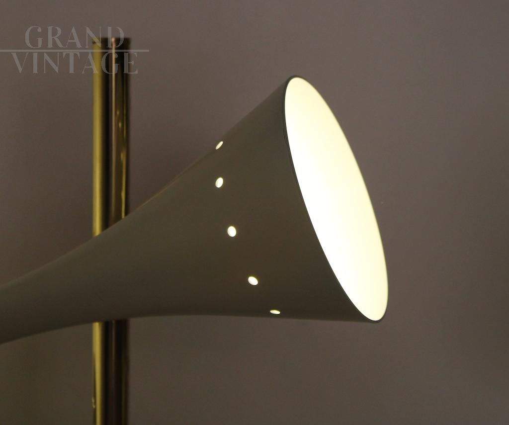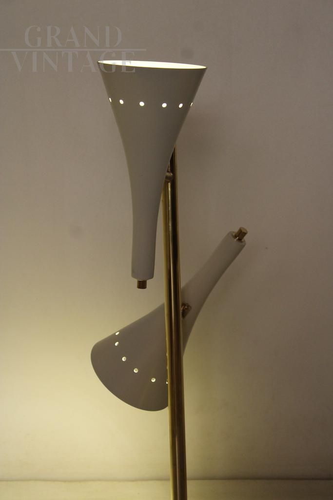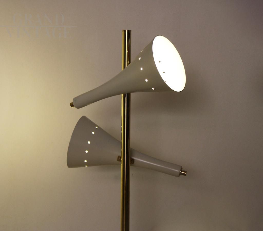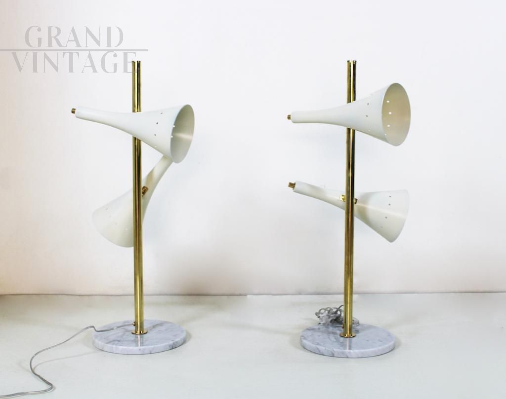 Particular vintage Stilnovo style double cone table lamps in white lacquered metal, with brass stem and marble base, Italy 1970s.