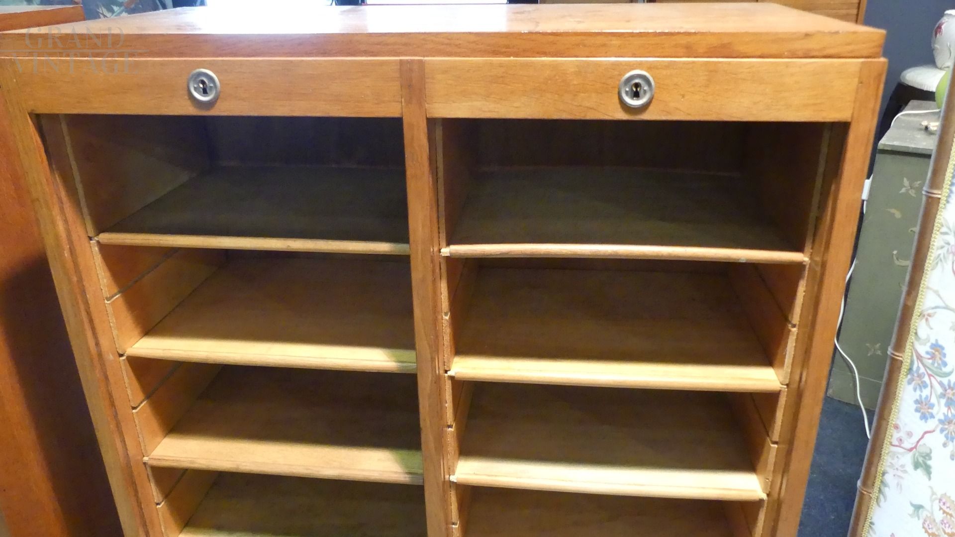 Vintage double shutter filing cabinet in oak wood, complete with keys, with working locks.