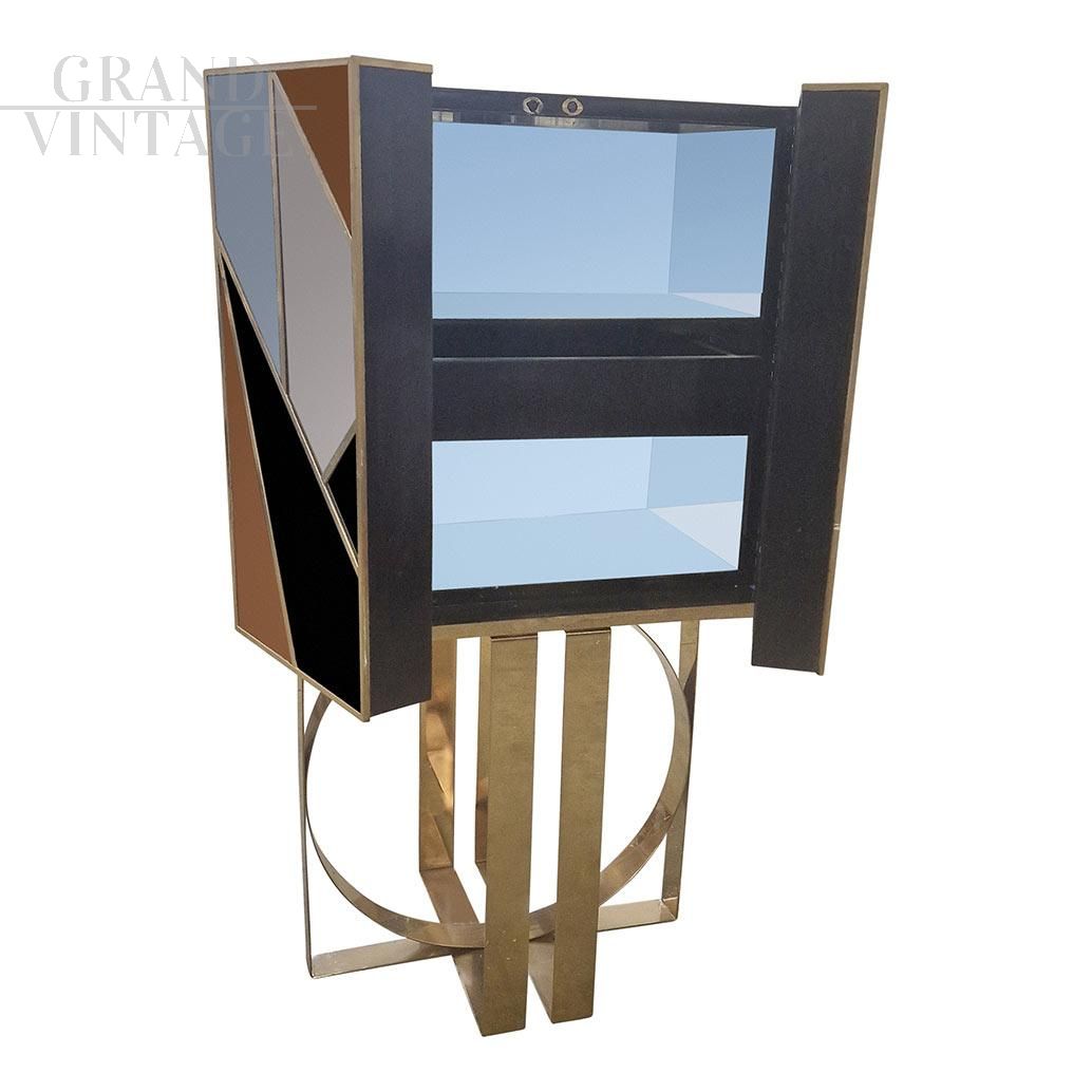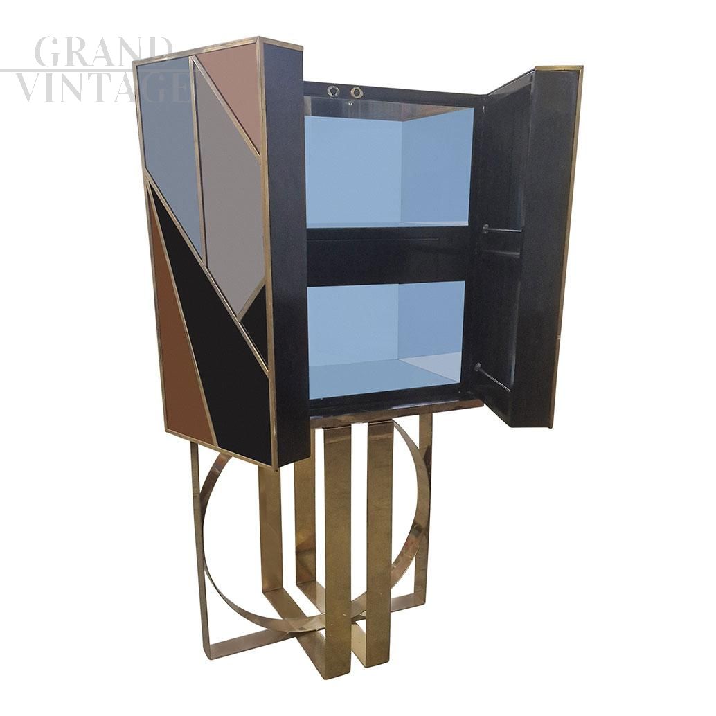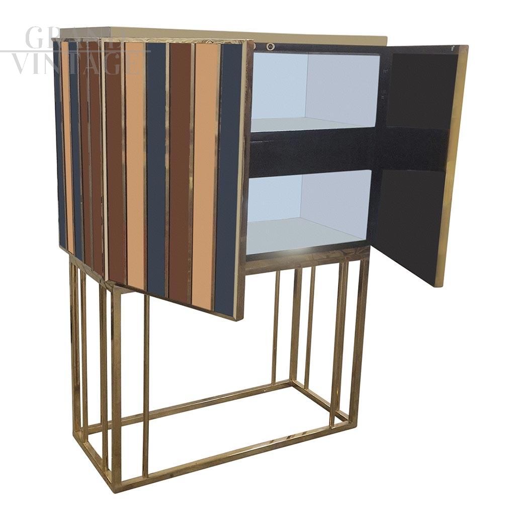 Design double-sided bar cabinet in colored mirrored glass, perfect to be placed in the center of the room, with two doors on two sides, mirrored interior with central wooden drawer. Lower structure with golden tubular geometries.
