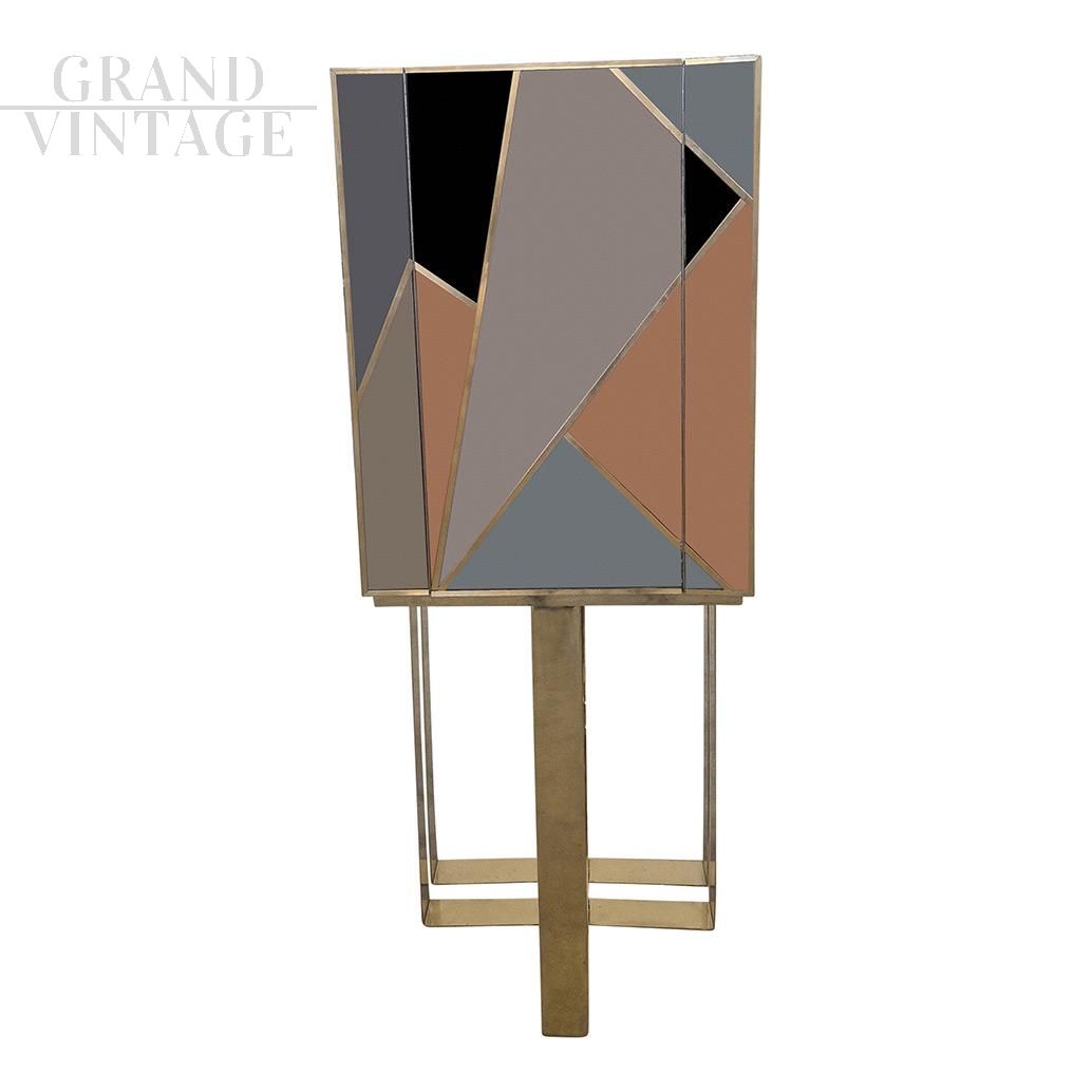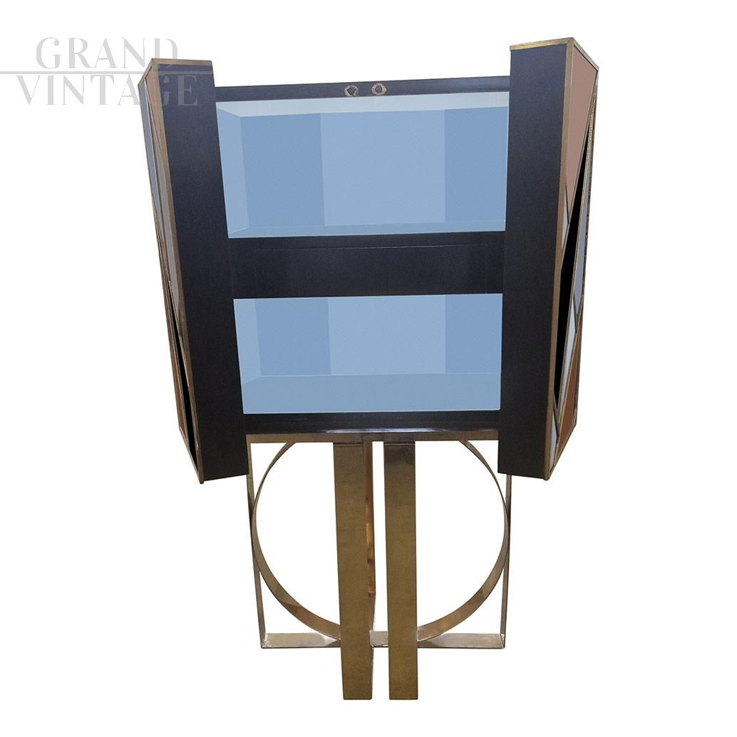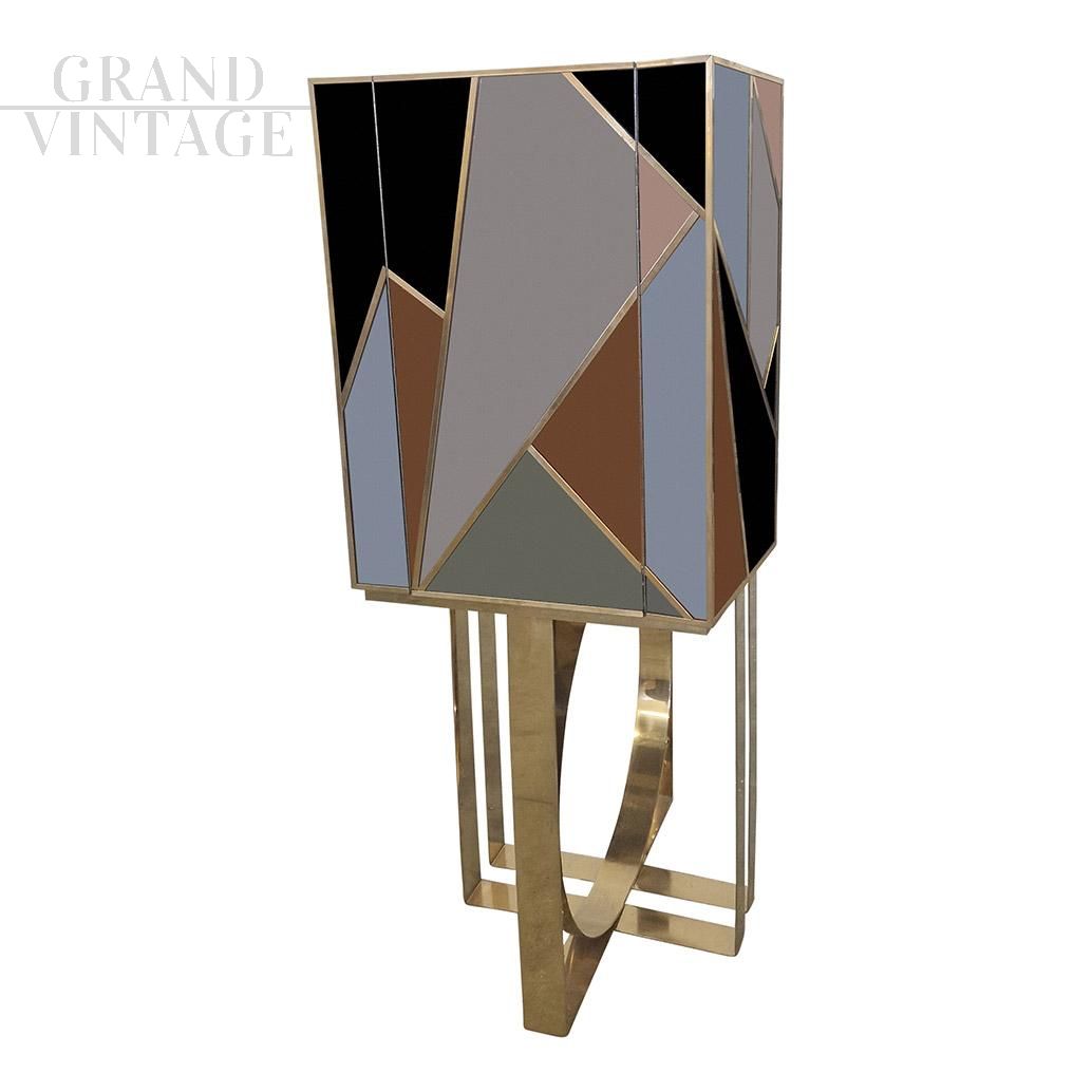 Design double-sided bar cabinet in colored mirrored glass, perfect to be placed in the center of the room, with two doors on two sides, mirrored interior with central wooden drawer. Lower structure with golden tubular geometries.