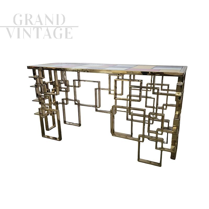 Double-sided console, entirely handmade, with a base worked with geometric elements in rectangular section tubular and chrome-gold surface finish, top covered with Murano glass elements of different colors. Dimensions (LxDxH): 150 x 45 x 81 cm