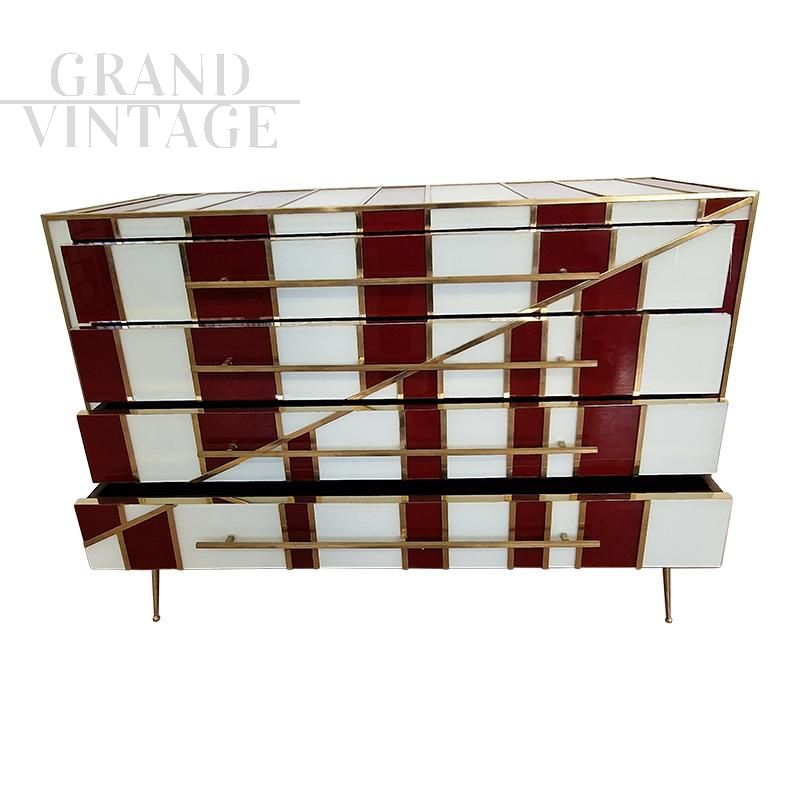 Asymmetrical design dresser with 4 drawers, entirely handmade, with wooden structure covered in white and burgundy glass; profiles and feet in golden brass, interior in black cloth.
