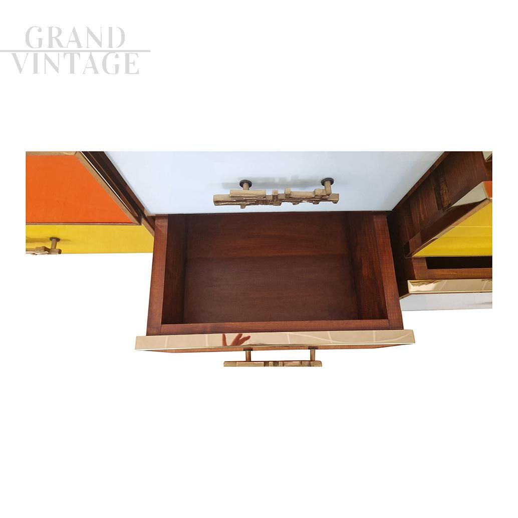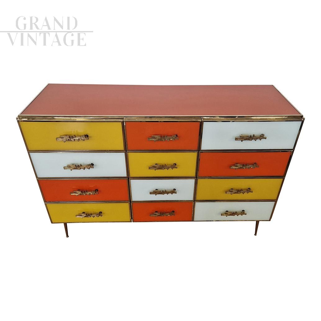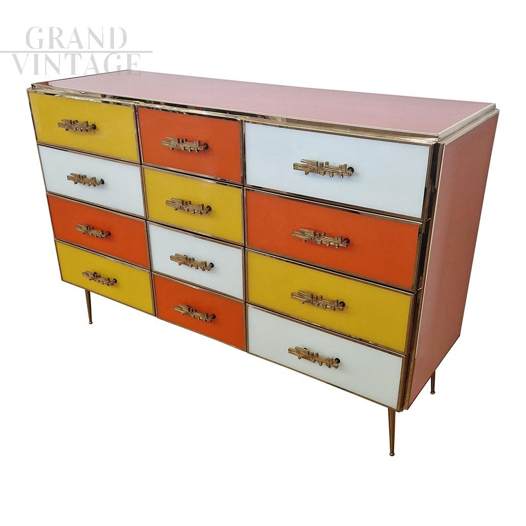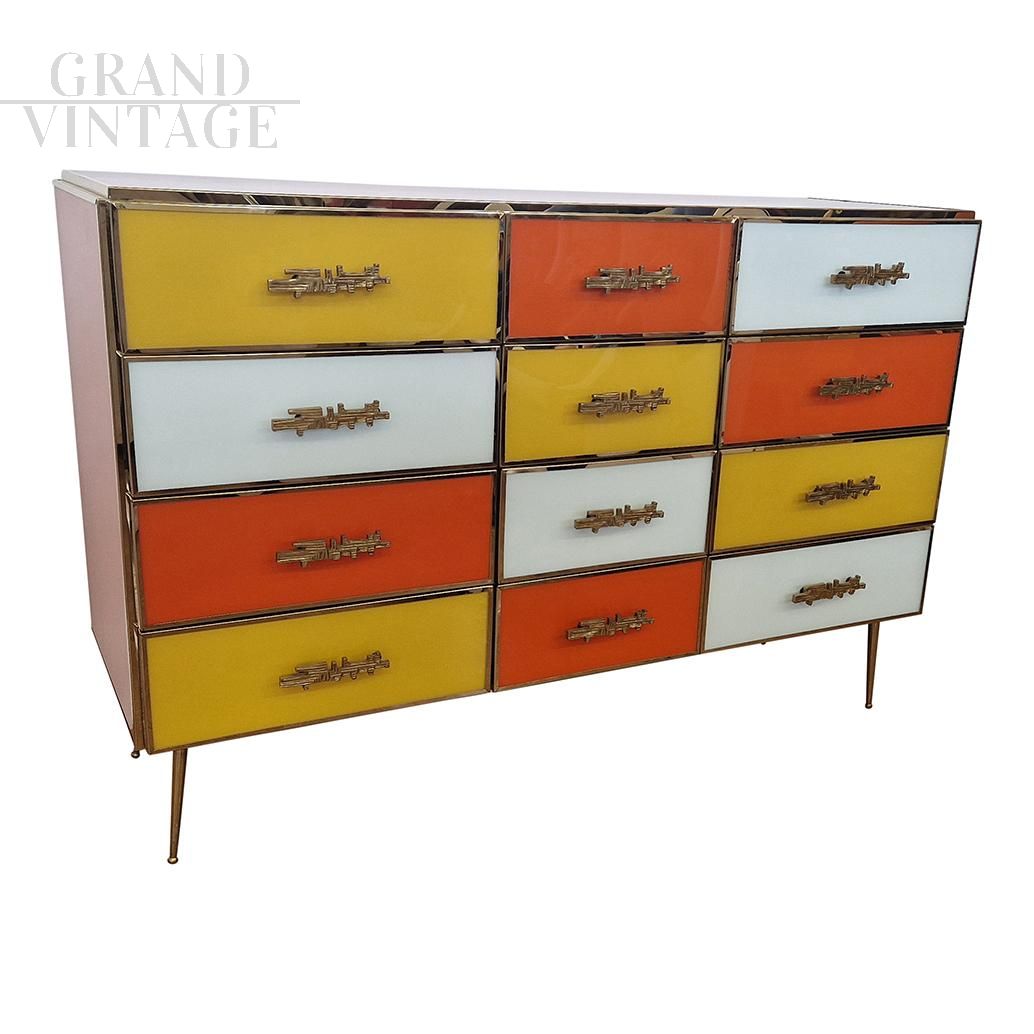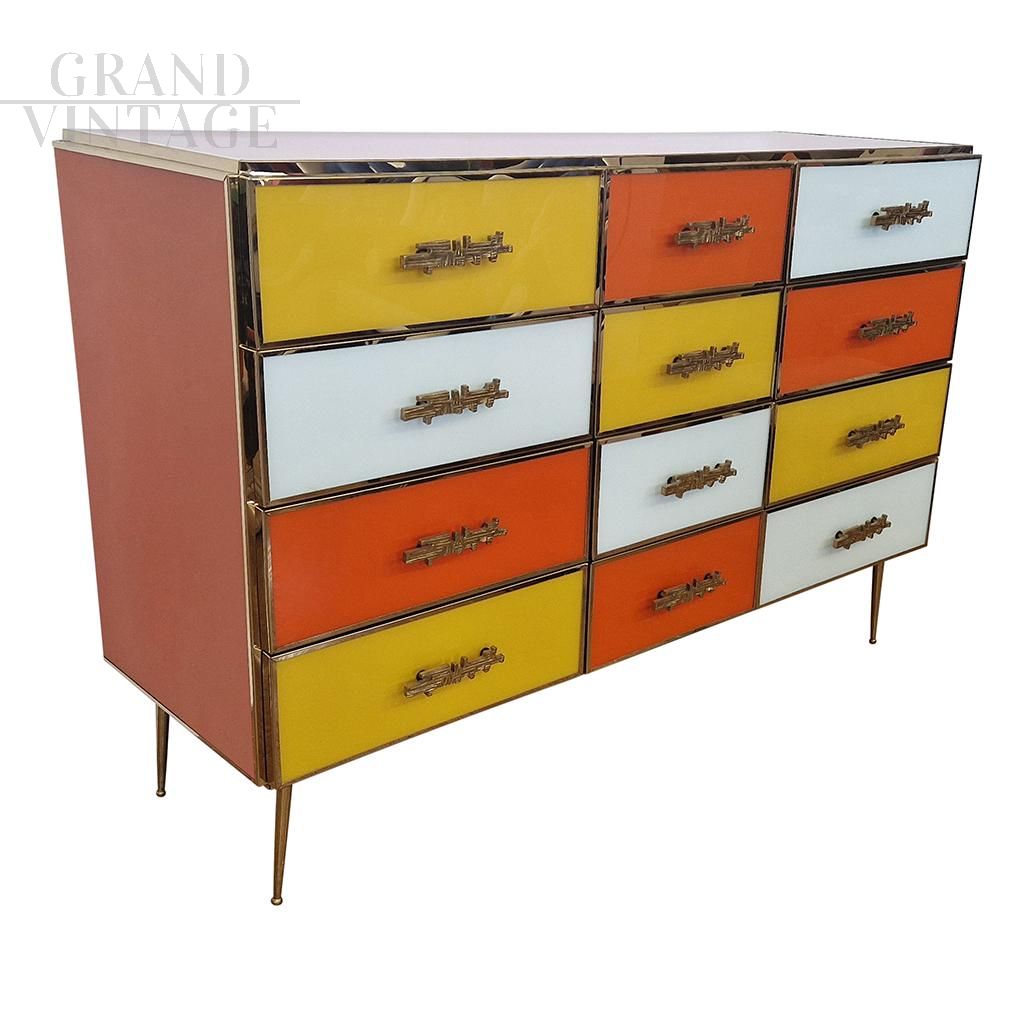 Dresser with 12 drawers entirely handmade, with wooden structure covered in yellow, orange and white glass. Profiles, handles and feet in golden brass.