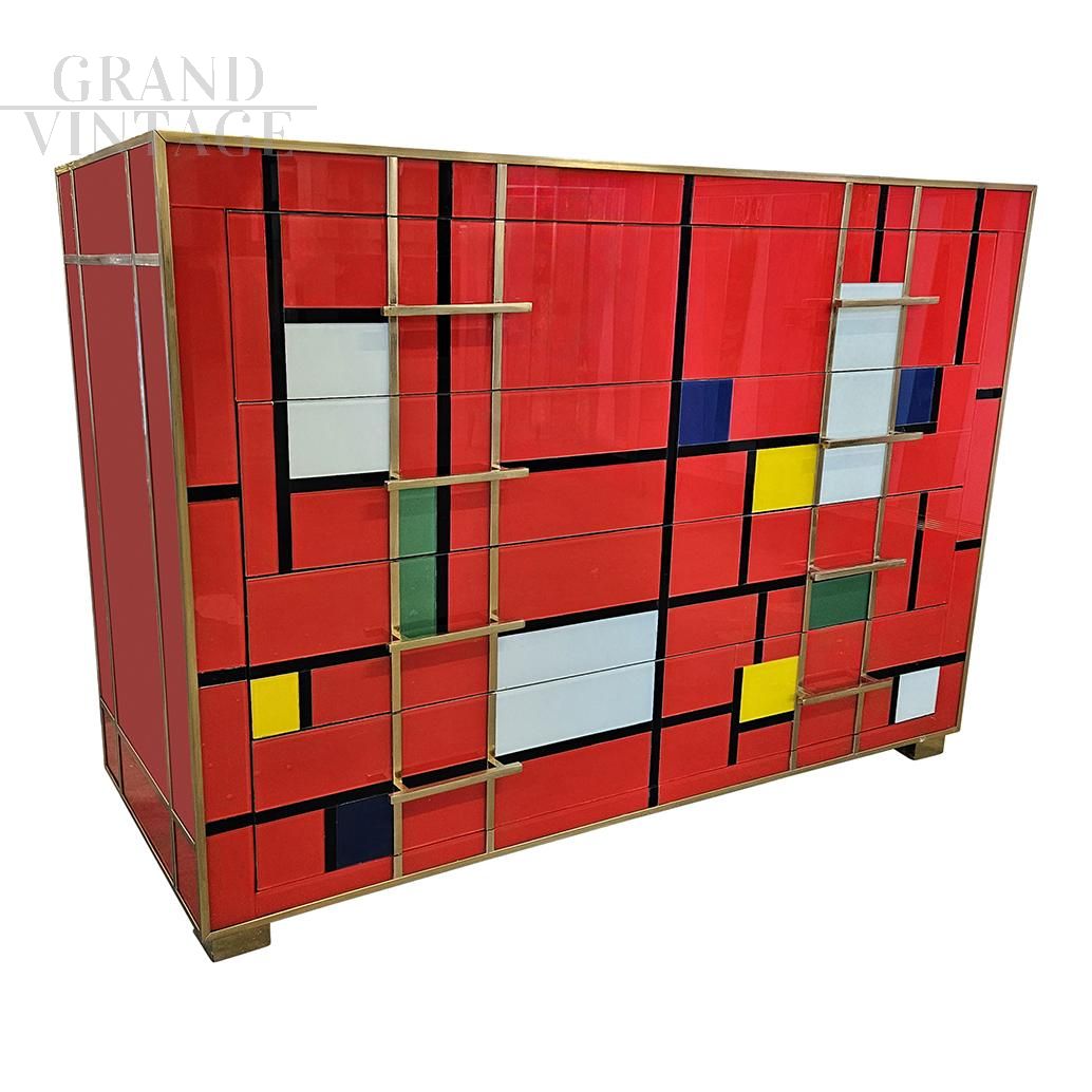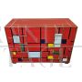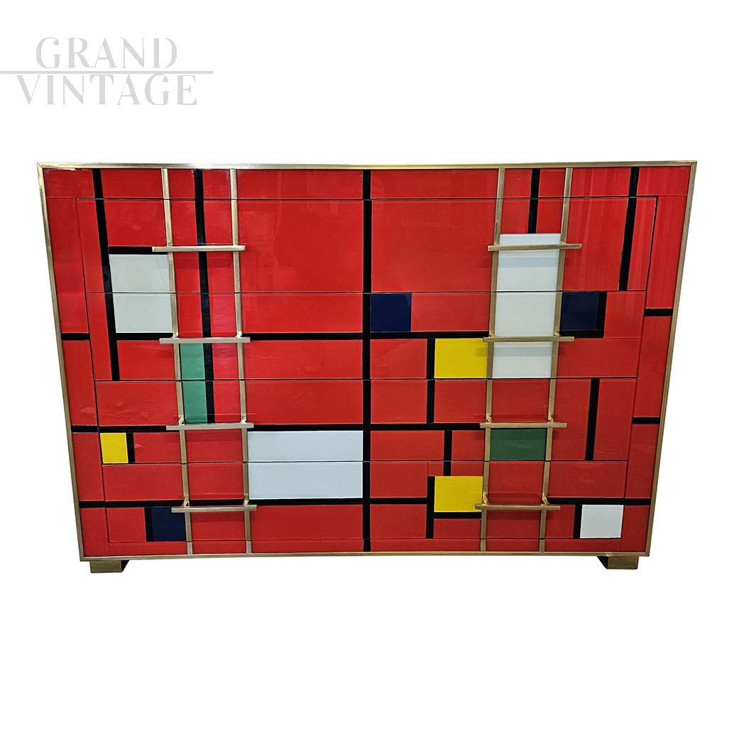 Dresser with four drawers entirely handmade with wooden structure covered in red and multicolored glass tiles; profiles, handles and feet in golden brass.