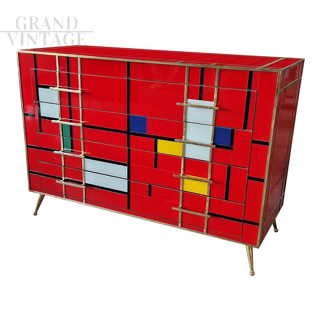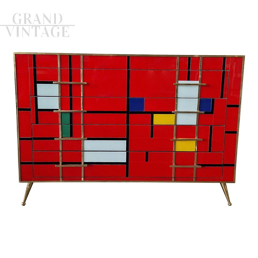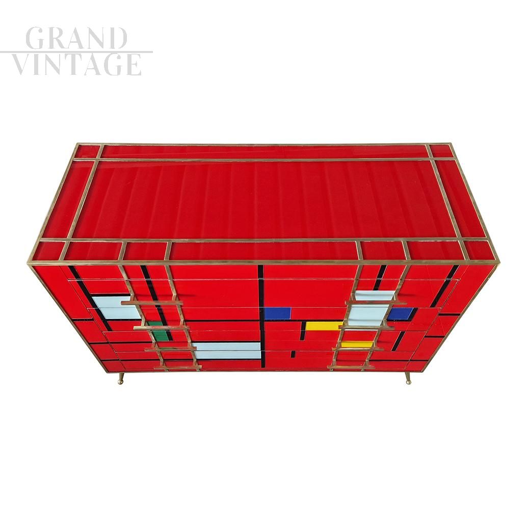 Dresser with four drawers, entirely handmade, with wooden structure covered in red glass tiles with multicolored inserts; profiles, handles and feet in golden brass.