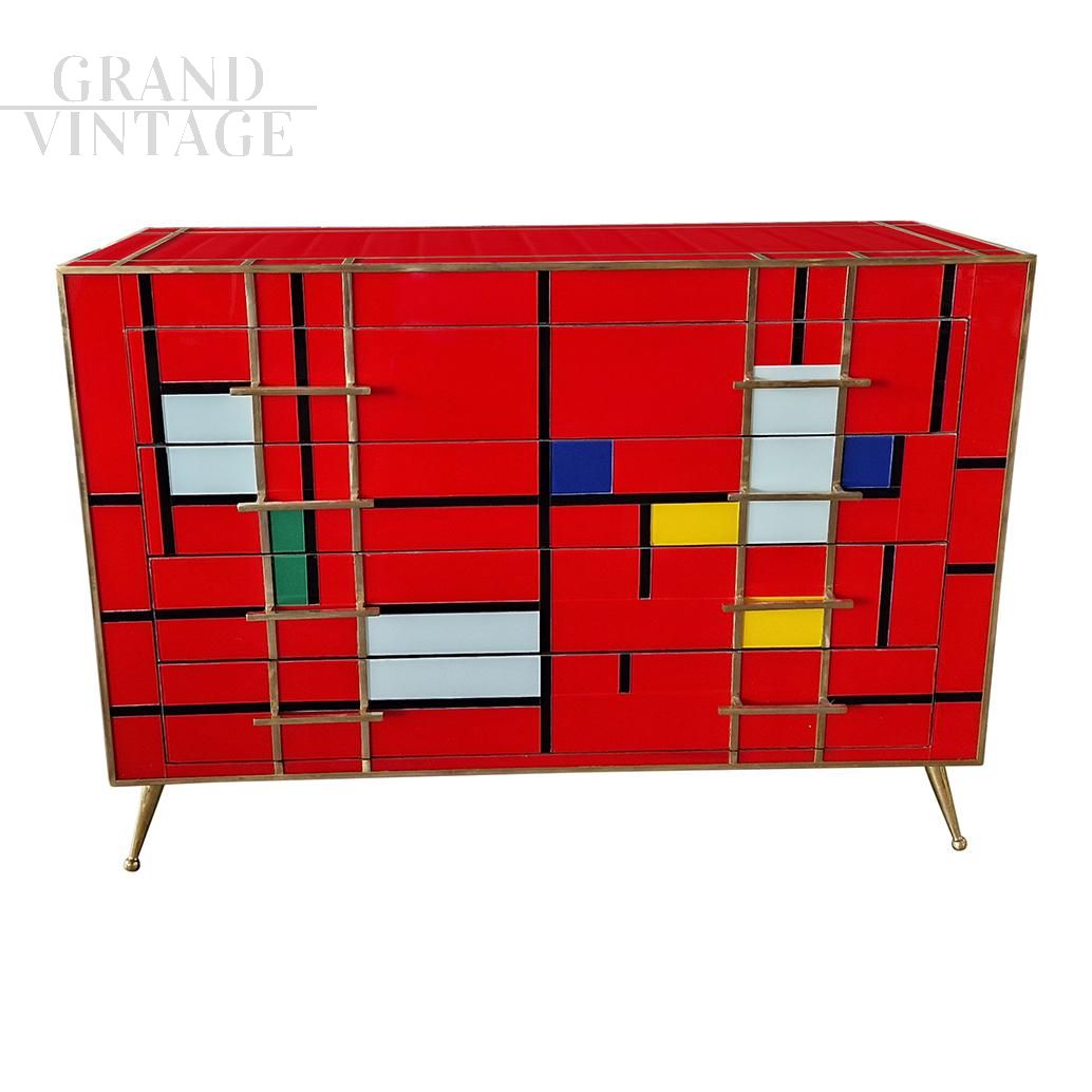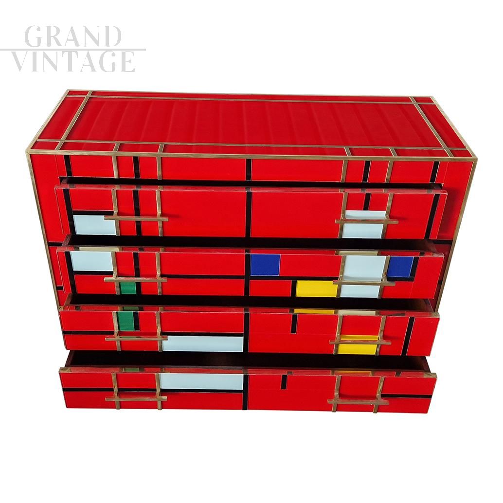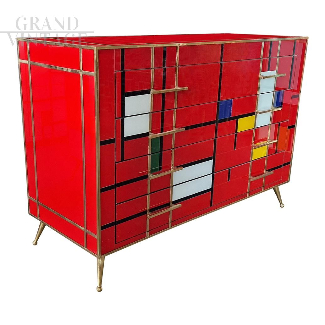 Dresser with four drawers, entirely handmade, with wooden structure covered in red glass tiles with multicolored inserts; profiles, handles and feet in golden brass.