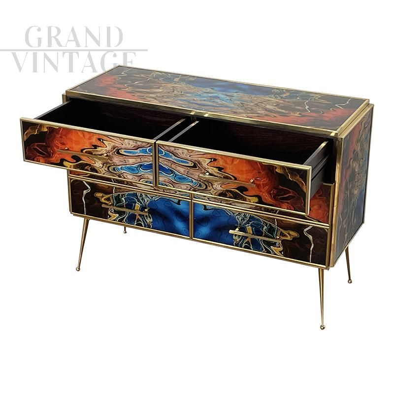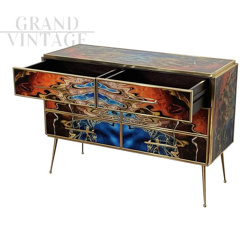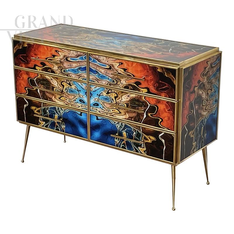 Dresser with six drawers entirely handmade, with wooden structure and surface finishes in Murano glass printed with a multicolored abstract pattern; profiles, handles and feet in golden brass.