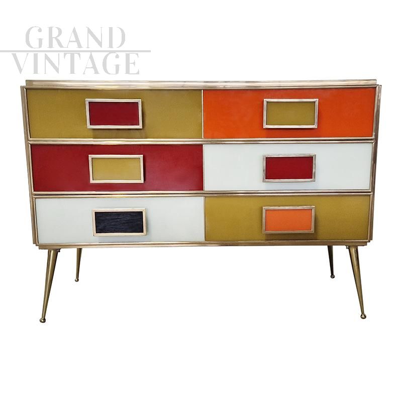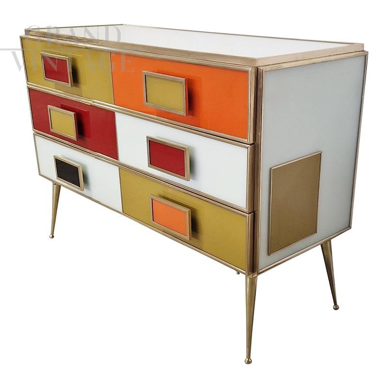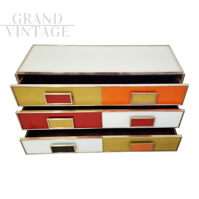 Six-drawer chest of drawers entirely handmade, with wooden structure covered in multicolored glass; profiles and feet in golden brass.