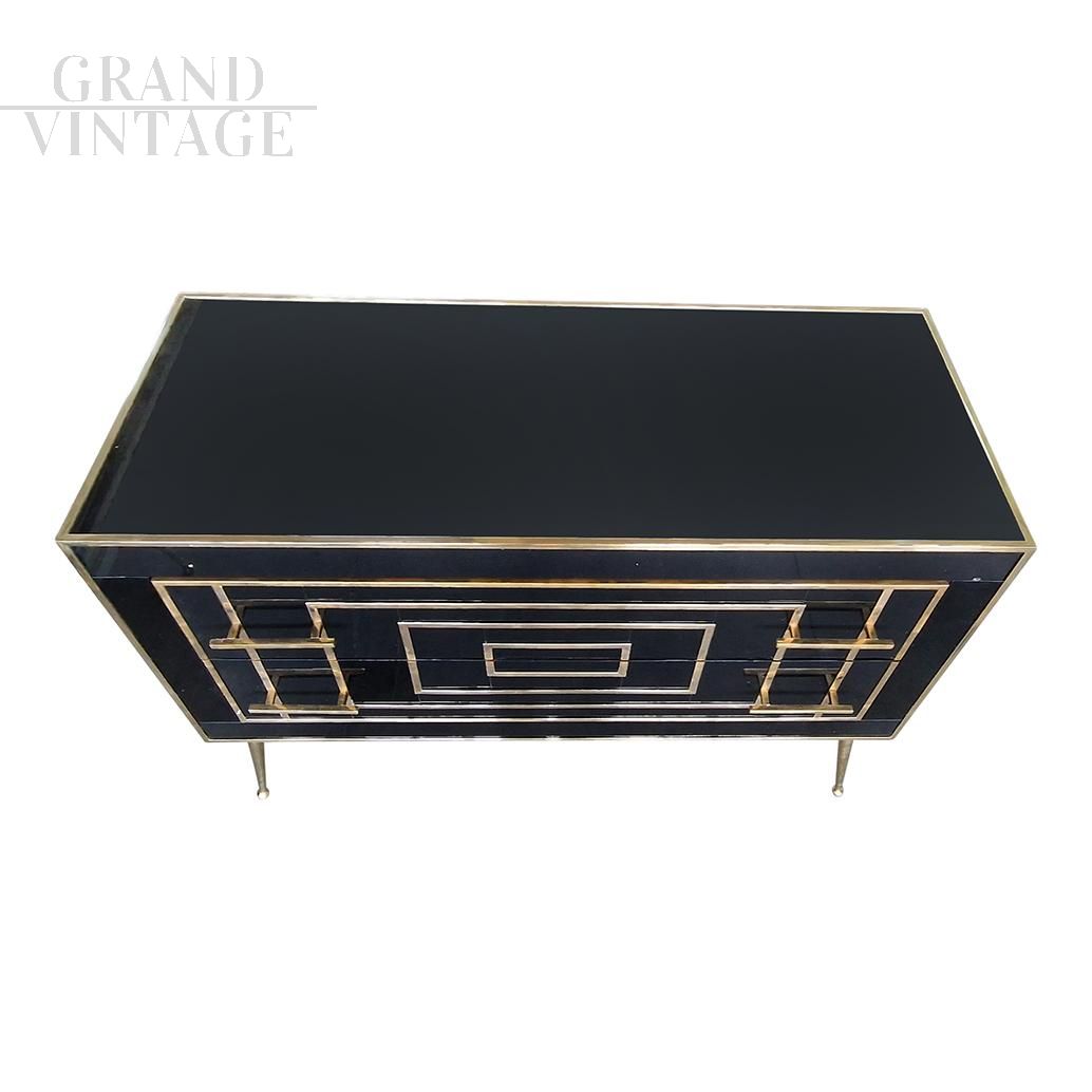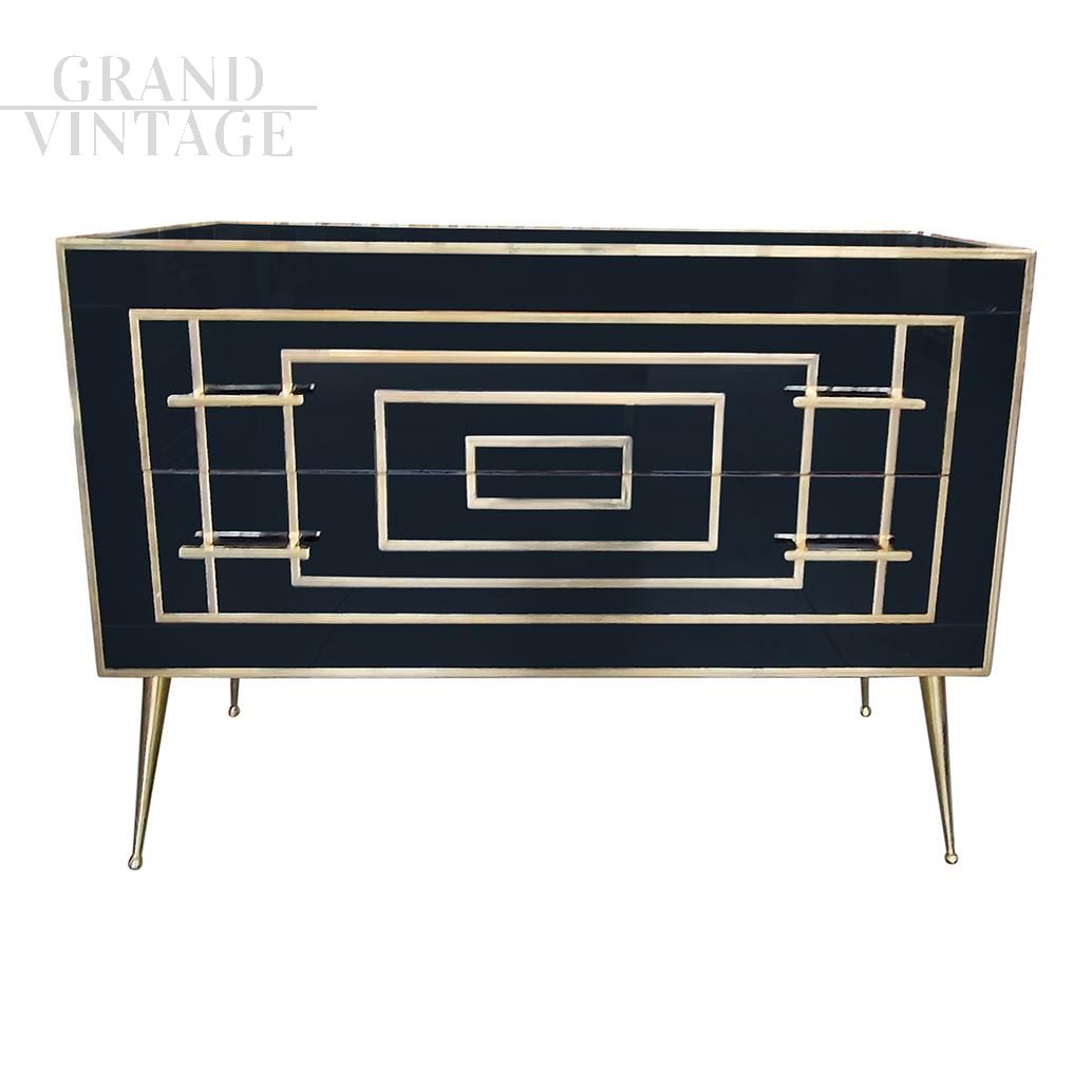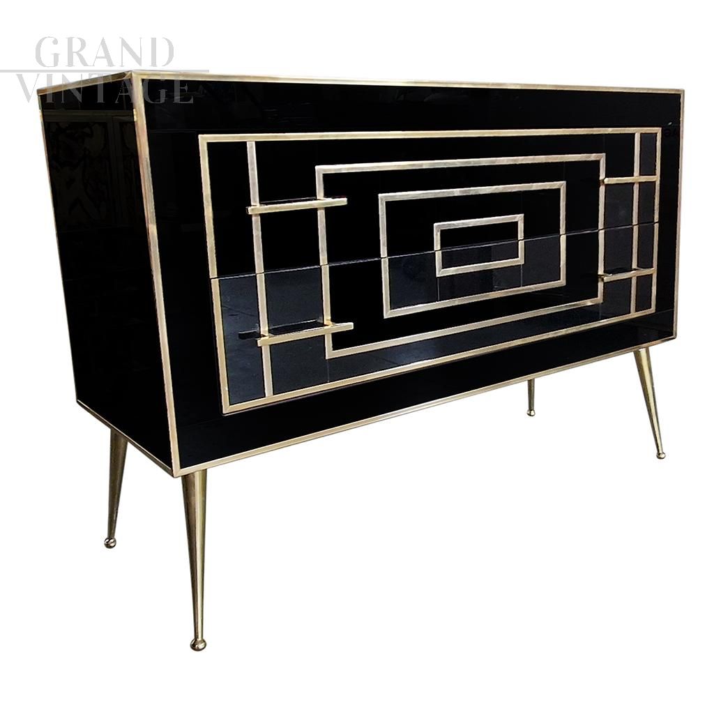 Dresser with two drawers entirely handmade, with wooden structure covered with black Murano glass tiles with golden brass geometries; handles and feet also in golden brass.