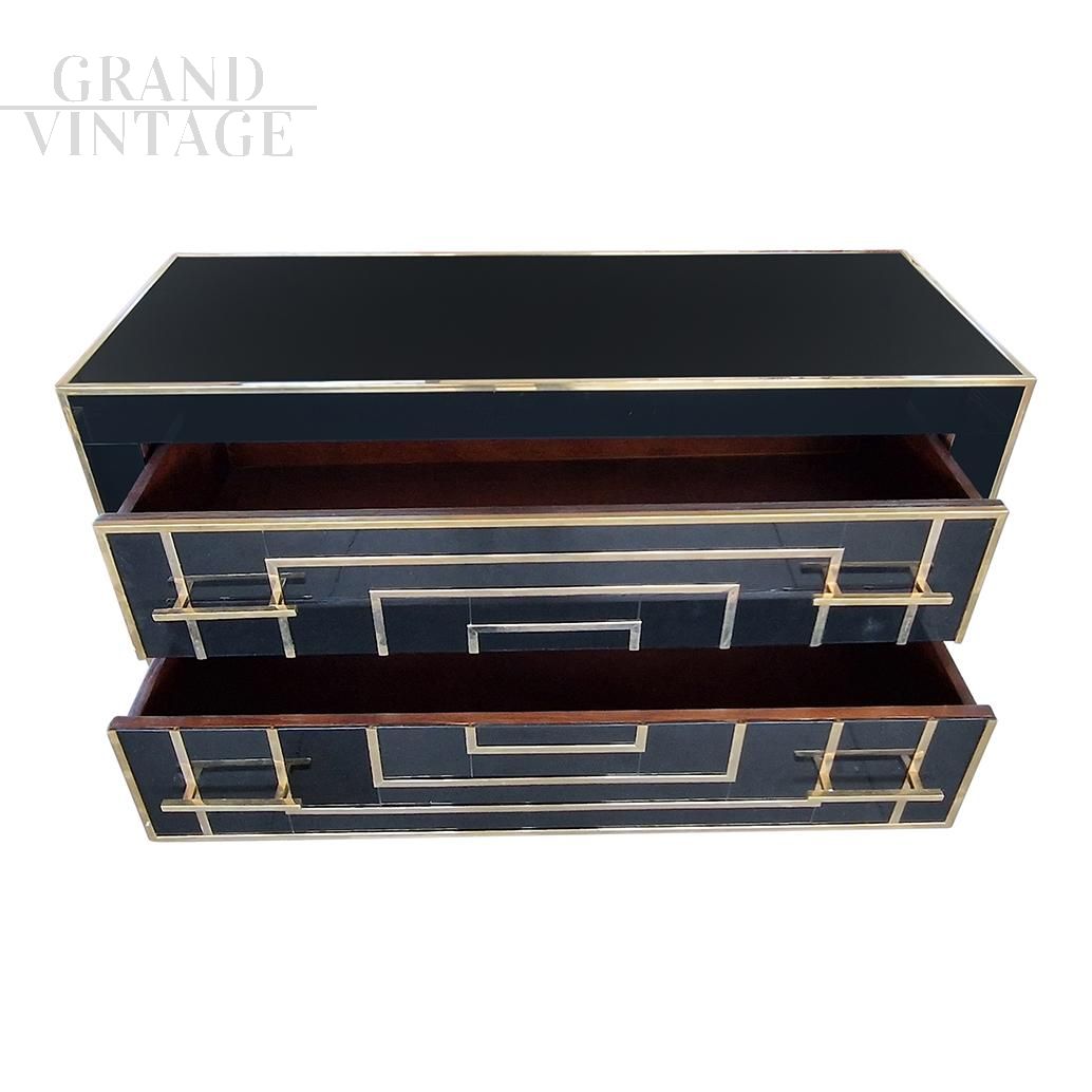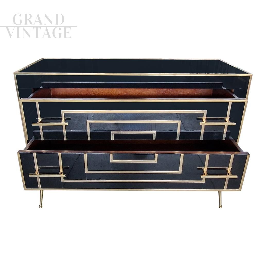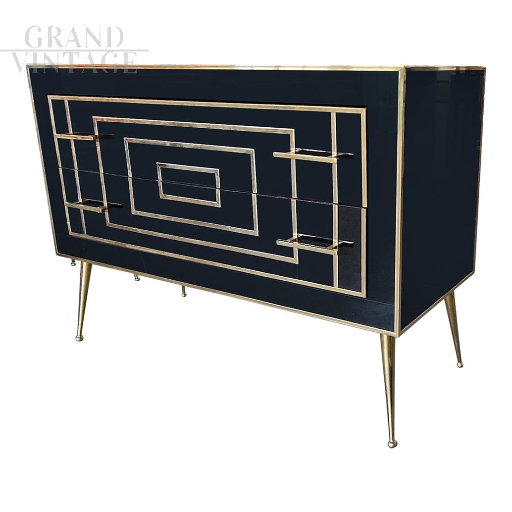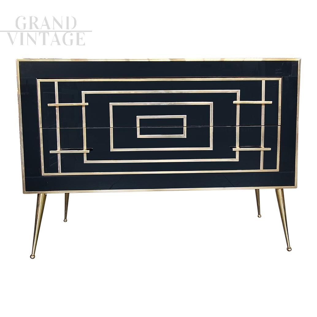 Dresser with two drawers entirely handmade, with wooden structure covered with black Murano glass tiles with golden brass geometries; handles and feet also in golden brass.