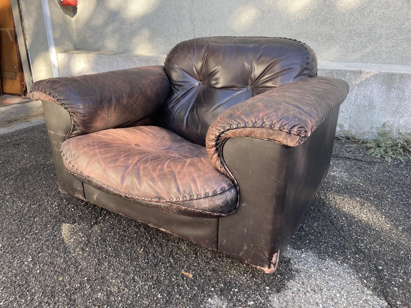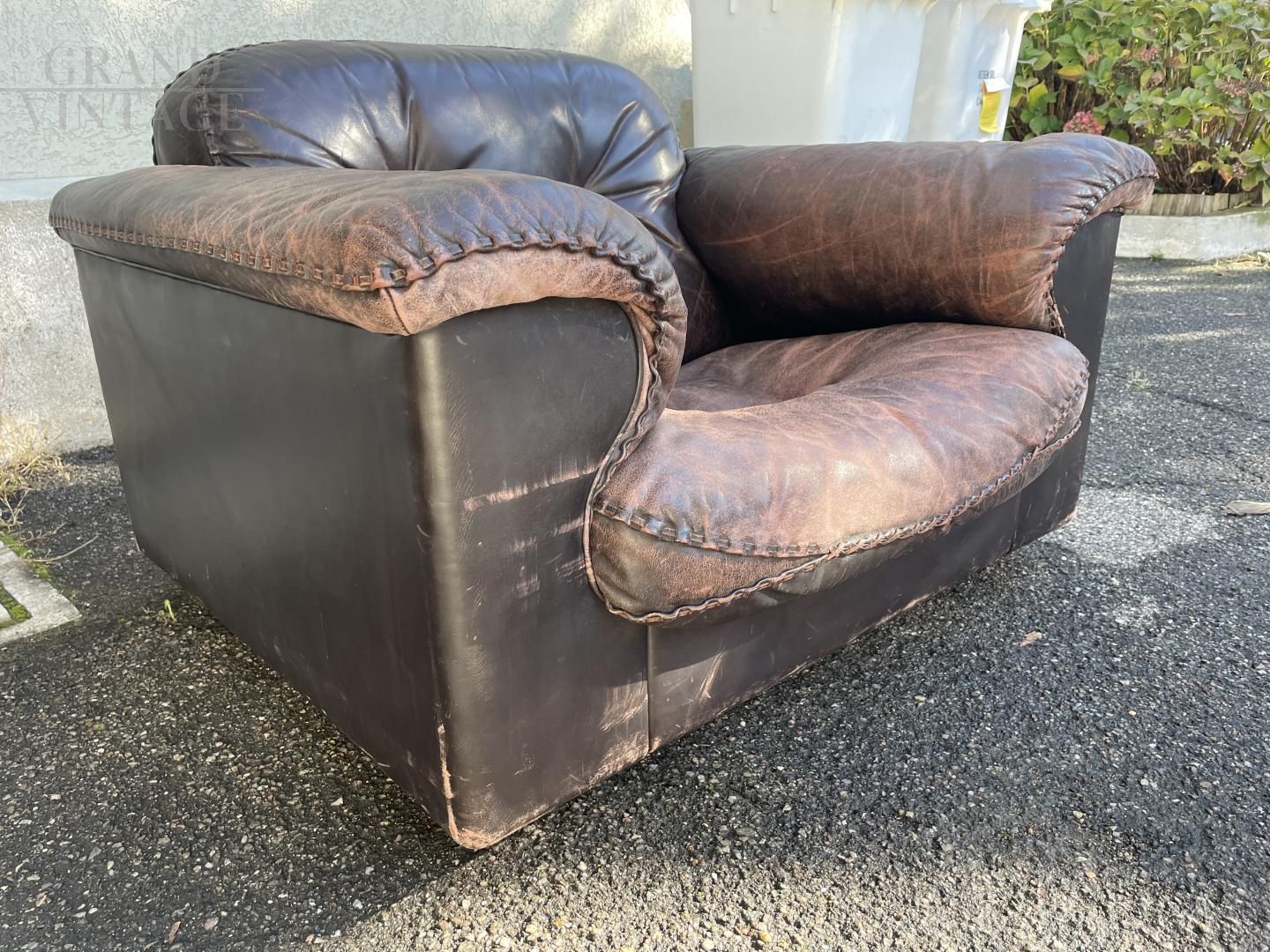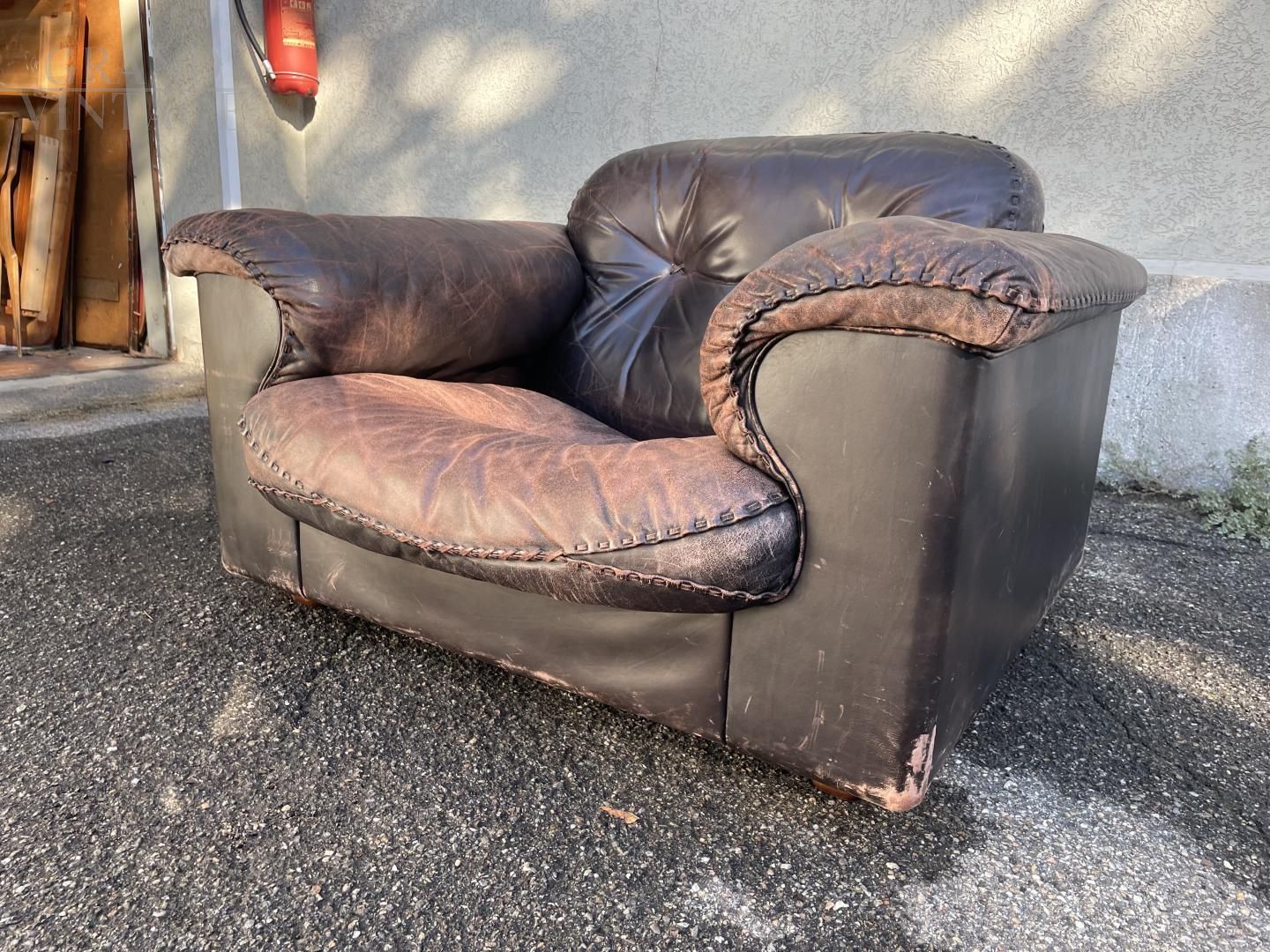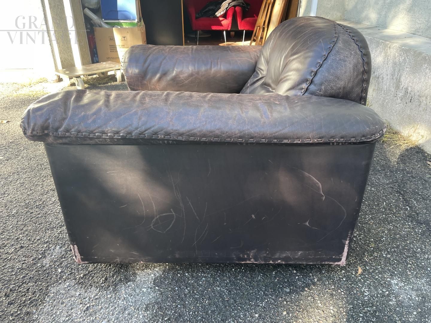 Ultra rare and very comfortable DS-101 design armchair, upholstered with high-quality tobacco-colored leather, from the world-famous Swiss furniture house De Sede. Featured in the James Bond film On Her Majesty's Secret Service. De Sede DS-101 parts are of unrivaled quality, displaying detail and workmanship of an unrivaled standard. This armchair has some superficial signs of wear which gives it a certain charm, the defects are easily eliminated with a simple polishing of the leather. All reclining mechanisms work perfectly, extracting the lower footrest reclines the backrest. The only work to be done, if desired, is to replace the elastic bands of the seat which have loosened over time.