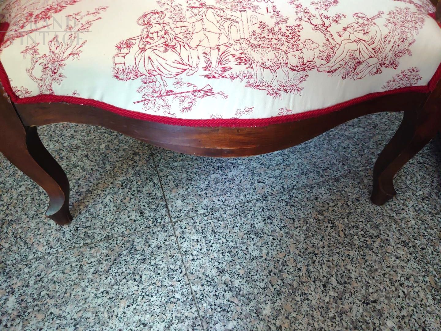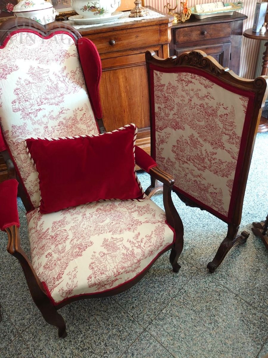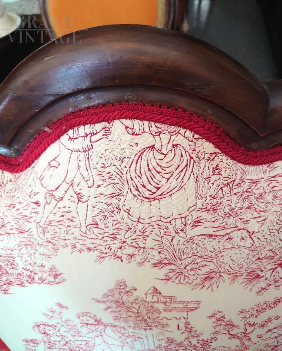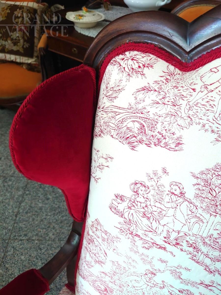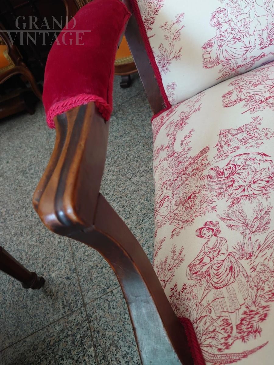 Early 19th century armchair upholstered in burgundy velvet and Toile de Jouy fabric with classic motifs of gallant scenes.