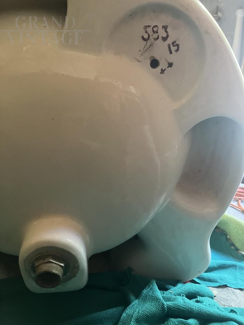 Art Nouveau washbasin from the early 1900s with two white ceramic basins, likely a Delafon or Porcher production model from the early 1900s. The shape is graceful, and it's rare to find recently manufactured models in this "nostalgia" style. The brand is not visible, but the serial number is visible on the back. It's in good condition with some small imperfections, but no cracks or major defects. The faucets are original vintage ones but unusable. One of the columns is damaged and will need to be replaced. The sink has been in a doctor's home in St. Gallen, Switzerland since the 1920s.
