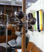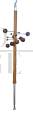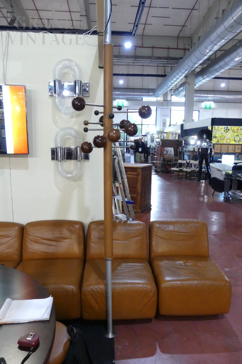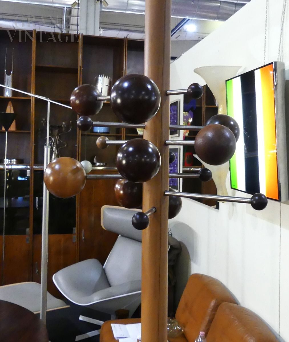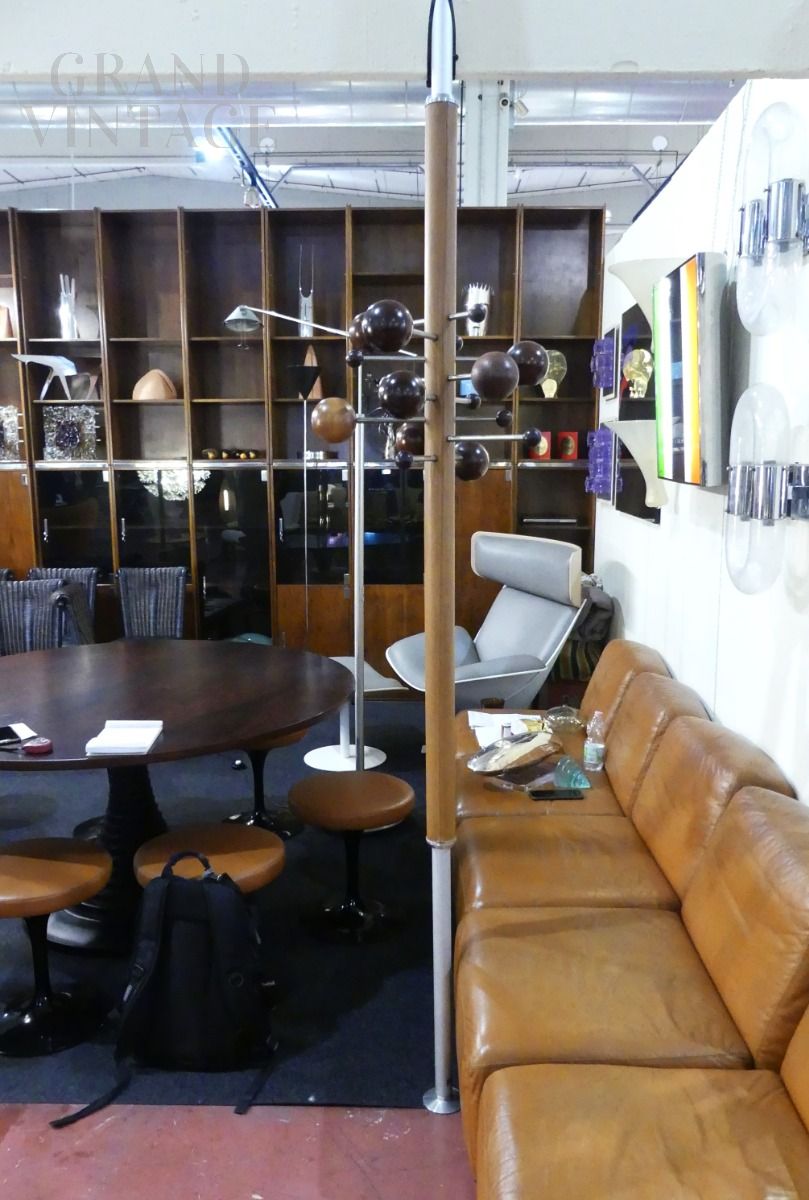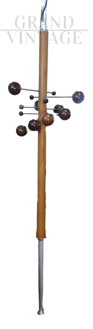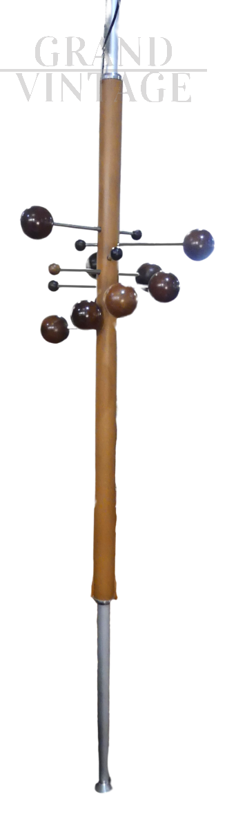 Beautiful coat stand designed by Osvaldo Borsani for Tecno with earth-sky structure that is fixed to the ceiling. Around the central metal rod covered in real brown leather there are spheres made of different woods for hanging coats, which represent the planets of the solar system and which can be positioned at different distances from the central rod.