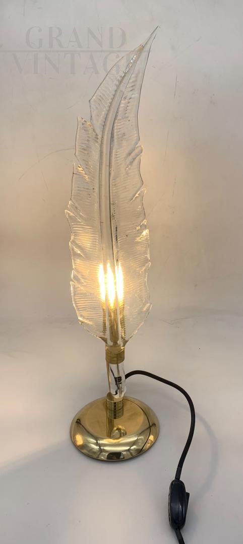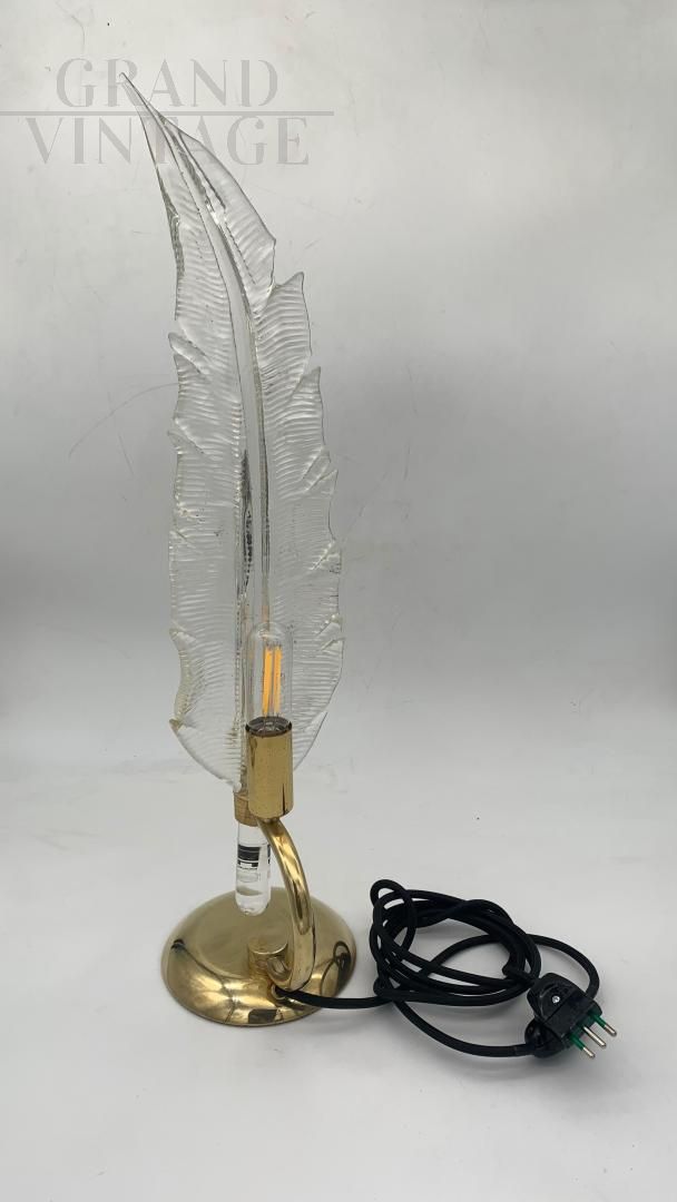 Decorative table lamp in an elegant and modern style, with a strong reference to Venetian design. Its distinctive element is the leaf shape, made of hand-worked glass, positioned on a polished and brass-plated iron base. Effetre Company Table lamp with blown glass diffuser in the shape of a stylised leaf. The leaf has an engraved texture that recalls the natural veins, made of transparent hand-worked glass. The base is in polished brass, which gives stability and a touch of classic elegance. The rod that connects the leaf to the base is made of glass, recalling the transparency of the diffuser. Complete with electric cable with three-pole Italian plug with lamp holder and 14.