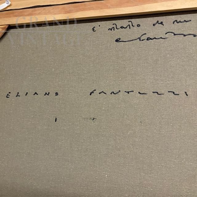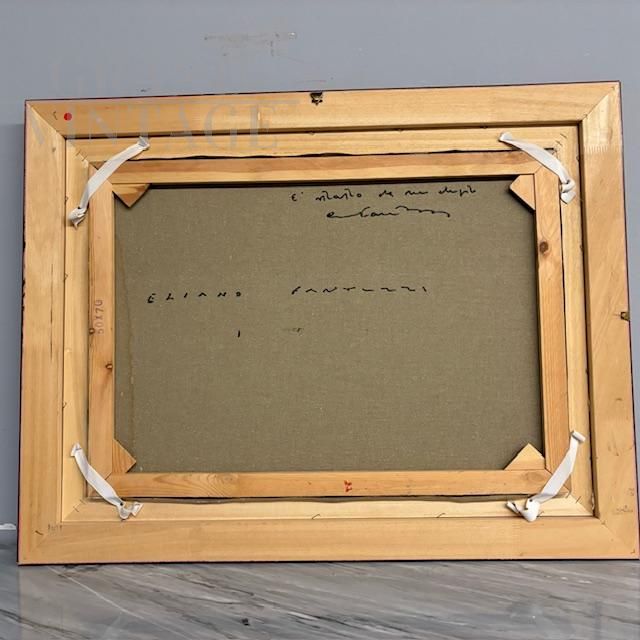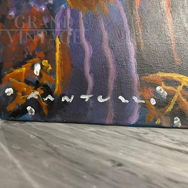 Oil painting on canvas signed Eliano Fantuzzi (1909 – 1987) depicting a night scene with characters at the port, modern Italian art from the 1900s. The painting is signed on the bottom left and authenticated by the artist on the back, it is in excellent condition and of excellent quality with vivid and very beautiful colors. Complete with gilded wooden frame.