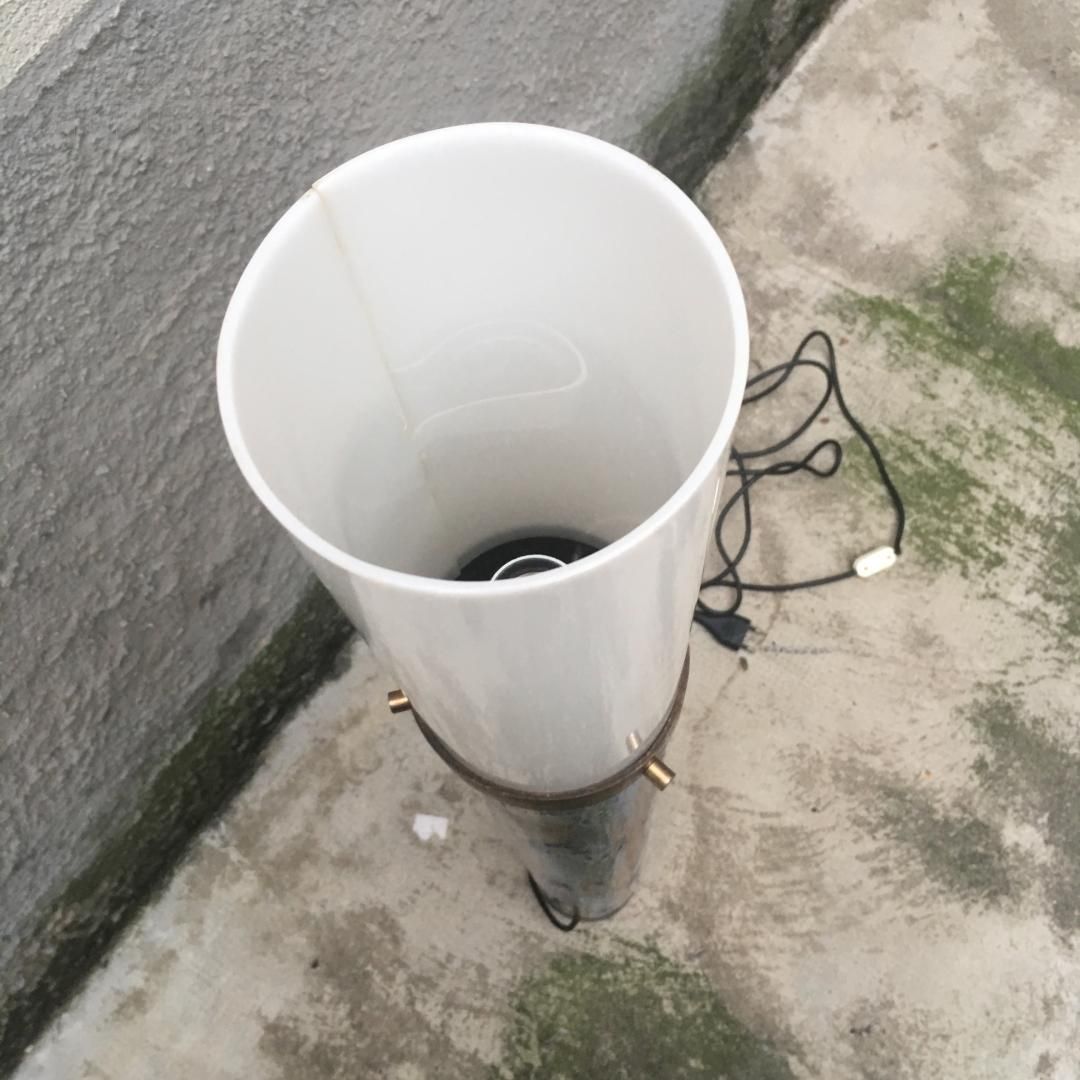 Floor lamp designed by Angelo Brotto, made by Esperia in enamelled copper, brass and curved plexiglas reflector.