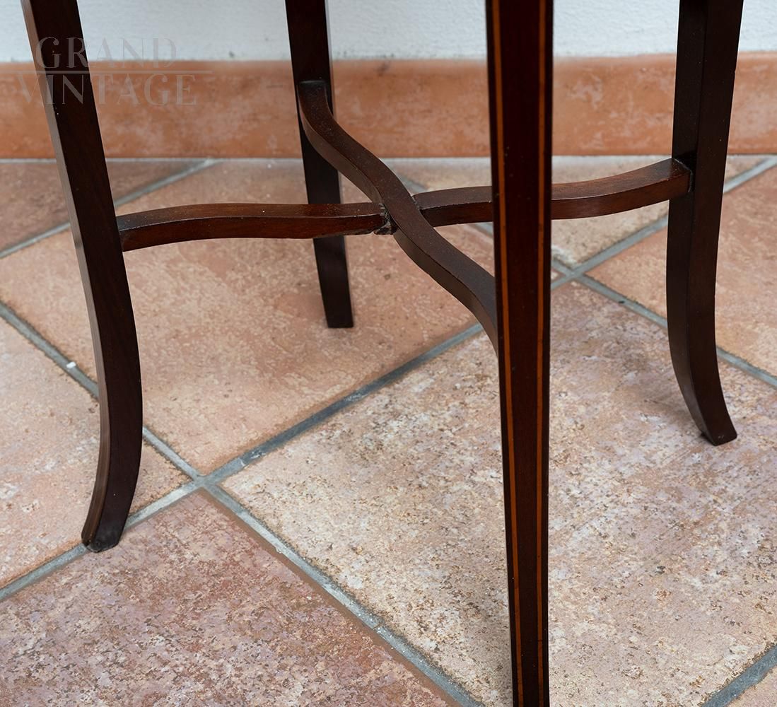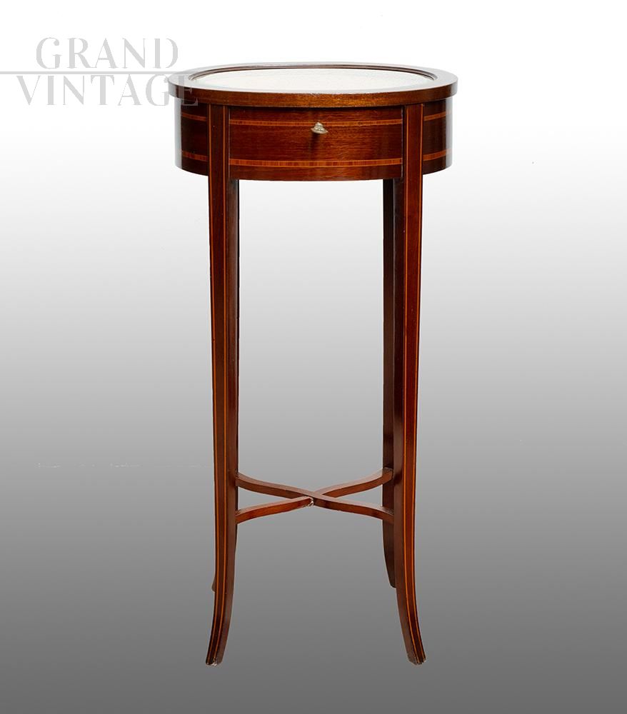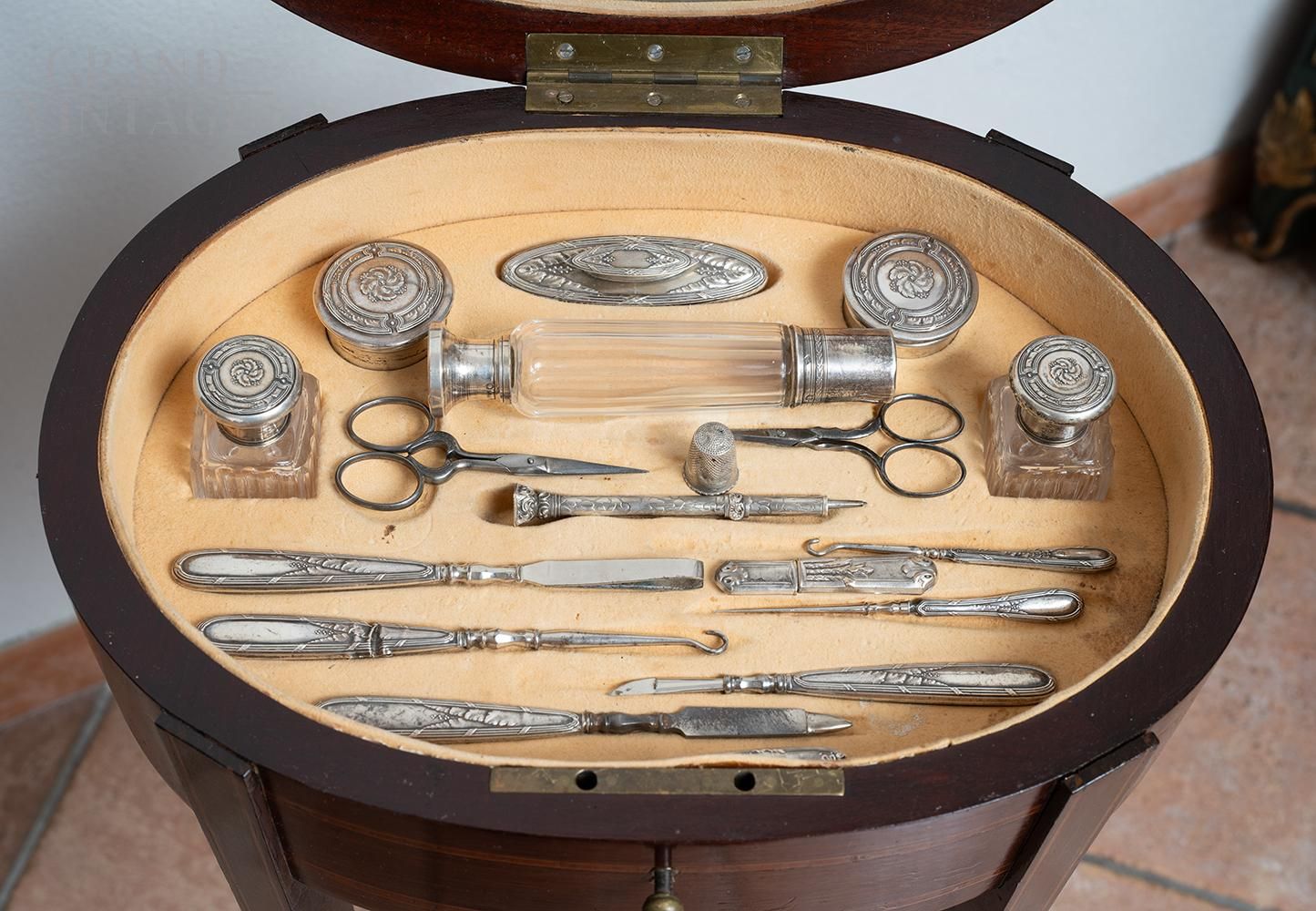 English Art Nouveau side table in mahogany with maple inlay inserts and a glass showcase top containing a collection of antique sewing tools in finely crafted silver. The reclining top contains a silver sewing set inside and is visible through the glass part. The band under the top is embellished by the presence of a maple inlay with a geometric motif. The four saber feet are connected via a mahogany top.