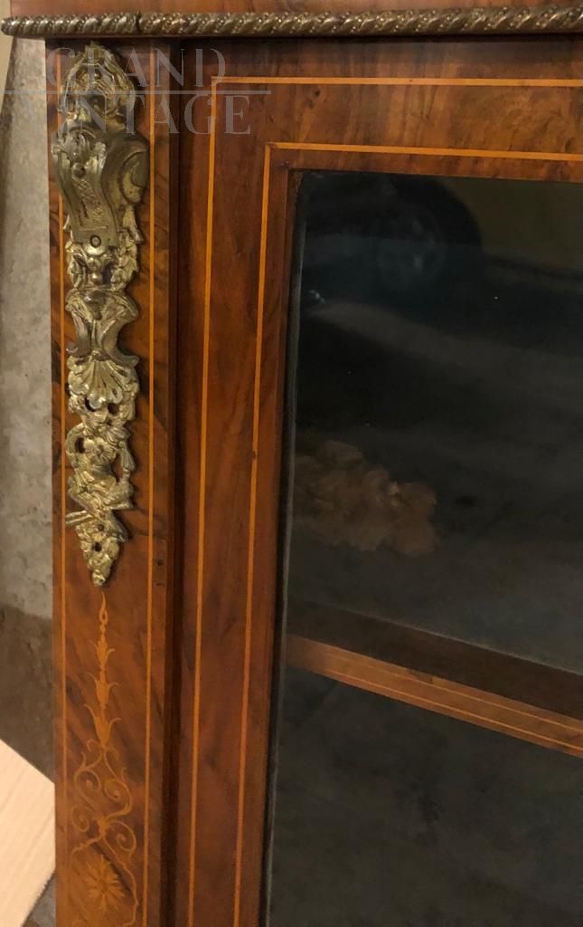 19th century English showcase in walnut briar, with floral marquetterie inlay and application of gilded bronzes, complete with certificate of authenticity.