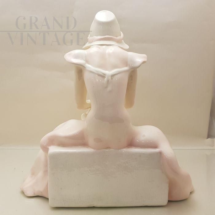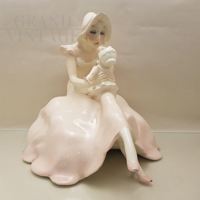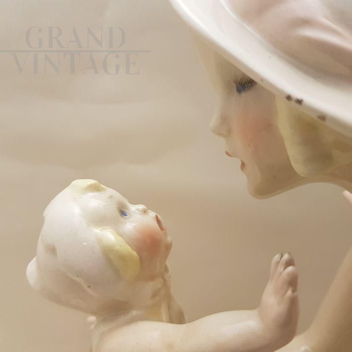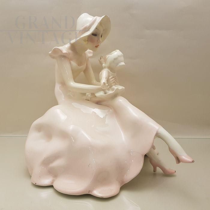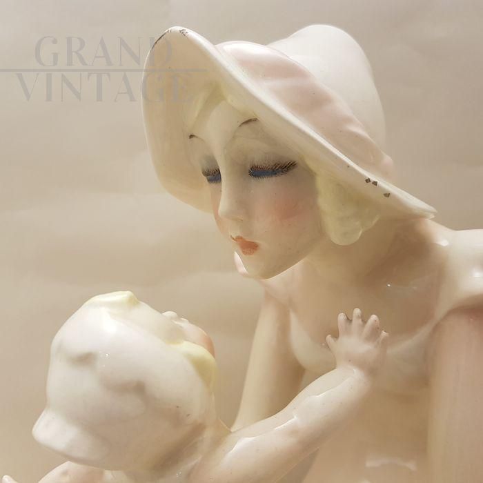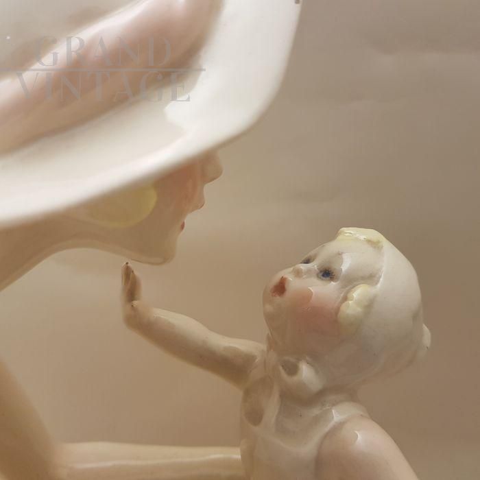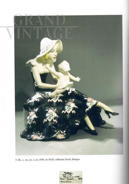 Delicate Essevi ceramic sculpture by Sandro Vacchetti, depicting a mother with her child in shades of pink, with signature and title Ma-a-mà! Pa-a-pà!" on the base. The sculpture appears, albeit with different colours, in the book "Sandro Vacchetti e la Essevi - Ceramiche del Novecento italiano" edited by Maria Grazia Gargiulo and published by Papero Edizioni.
