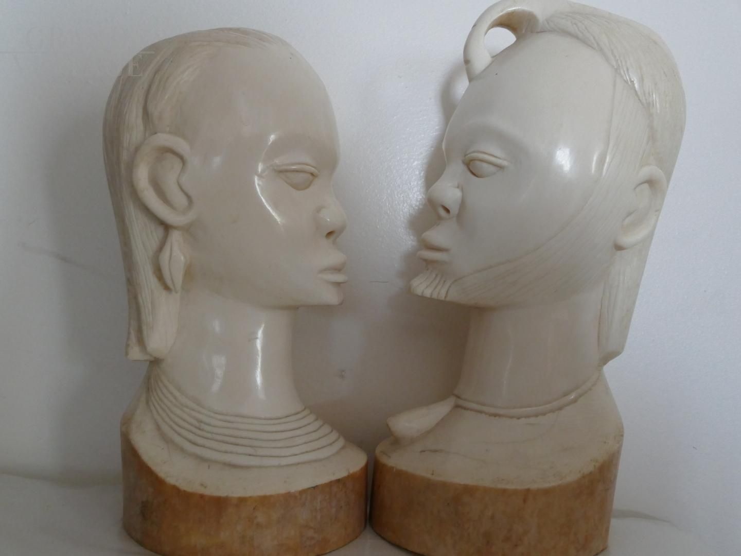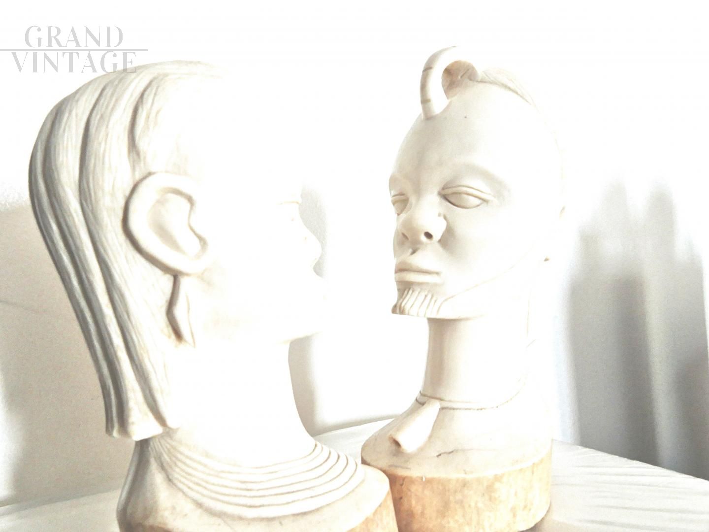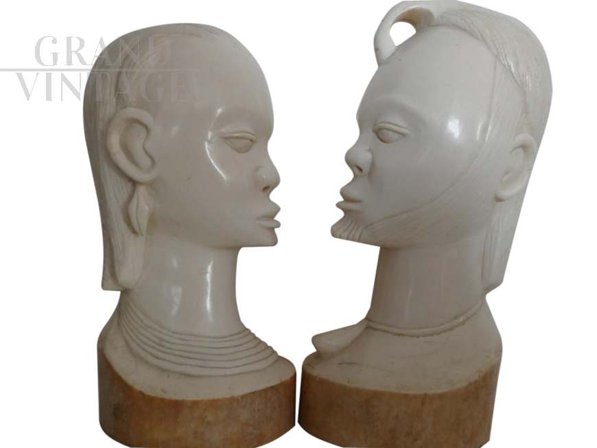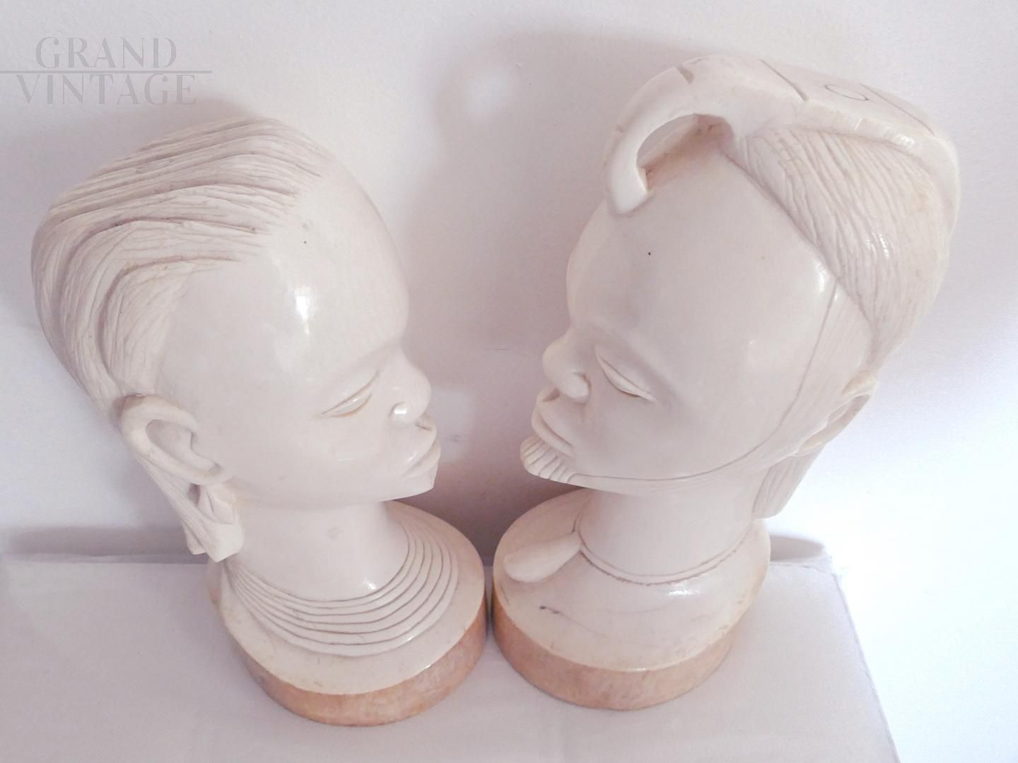 Pair of ethnic raw ivory sculptures, 20 cm (female) and 21 cm (male), representing the eternal love. Made by an artist from Cameroon in the late 1950s.