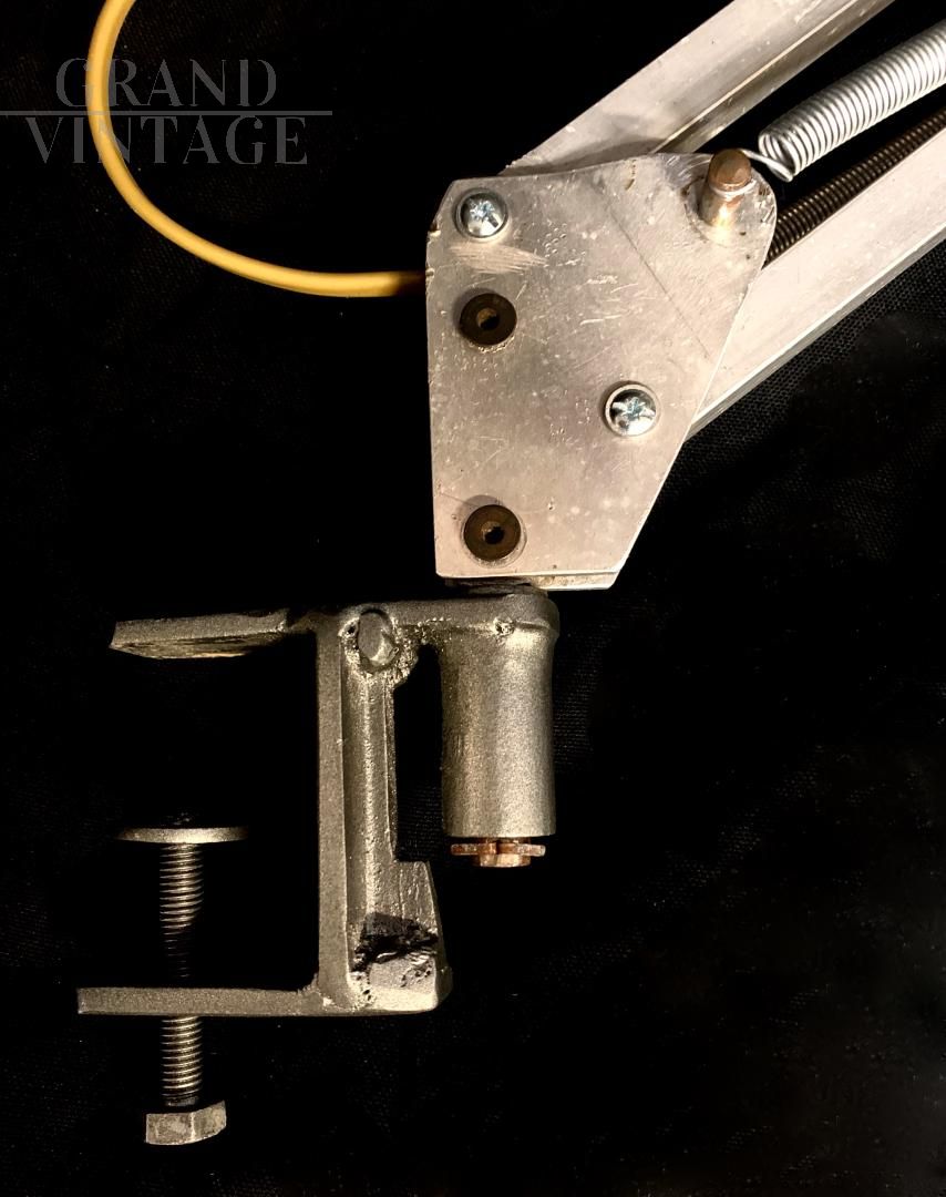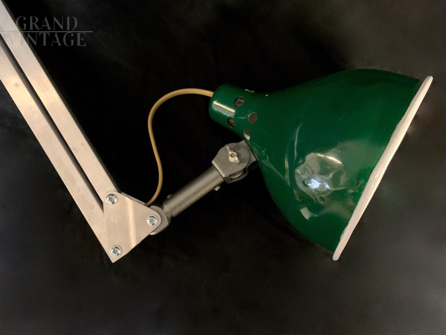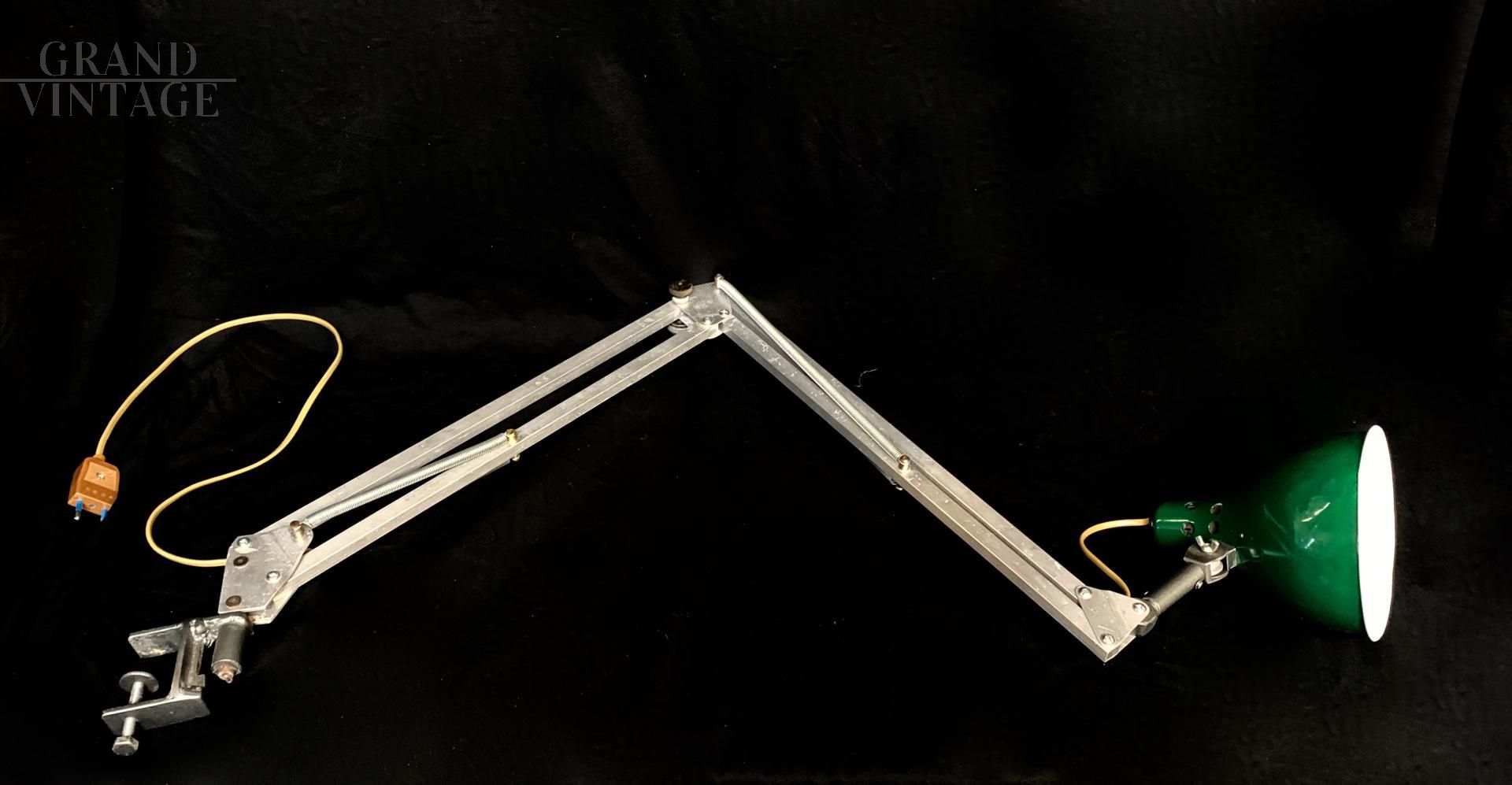 Desk lamp with clamp, 1950s vintage, with adjustable and extendable structure in white lacquered metal and lampshade in dark green lacquered sheet. The lamp is large, and is in excellent general condition, with the electrical system redone and working, it has some natural signs of aging on the lacquered parts but it is still beautiful. Ready to use.