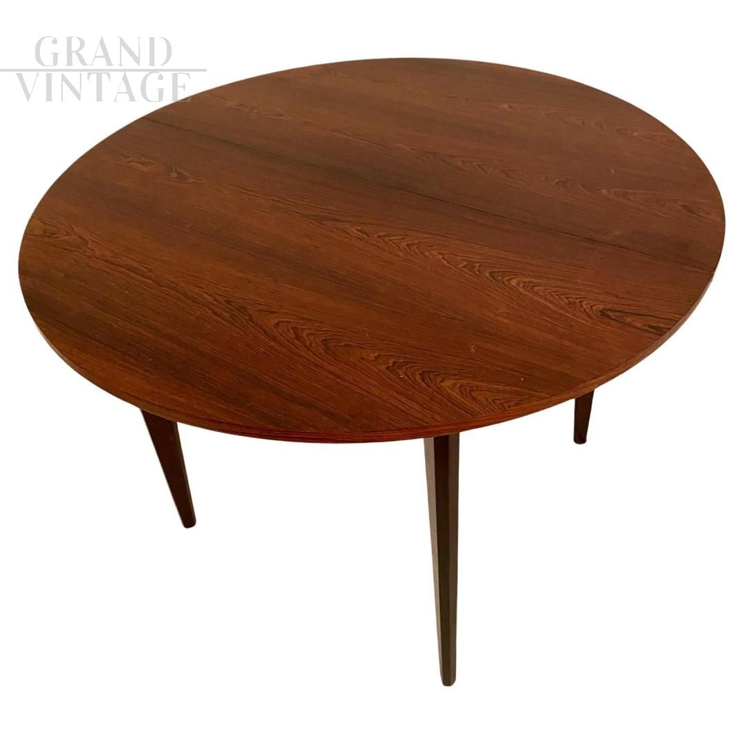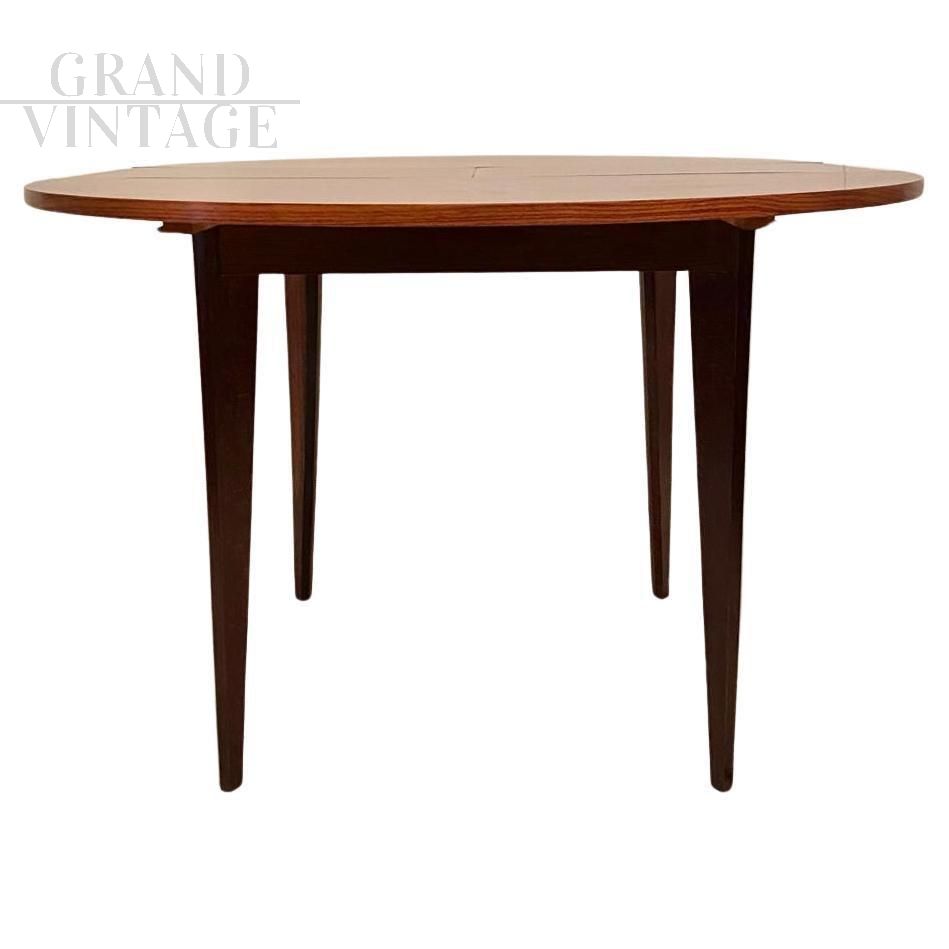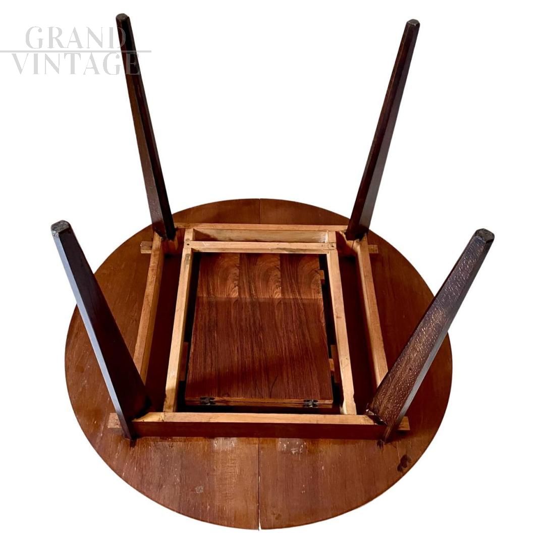 Round extendable dining table attributed to the iconic Italian company Vittorio Dassi, produced in the 1960s. The table represents an excellent example of high quality Italian modern design, with a beautiful mahogany veneered top where the wood grain creates a refined effect which rests on an elegant solid wood structure. The object has been completely restored: The structure has been reinforced and repaired. Extending mechanism works perfectly. The veneer is in perfect condition. Very good general condition, with few signs of aging.