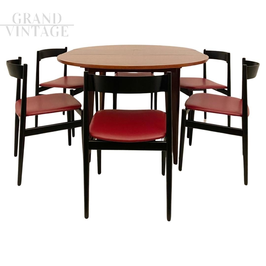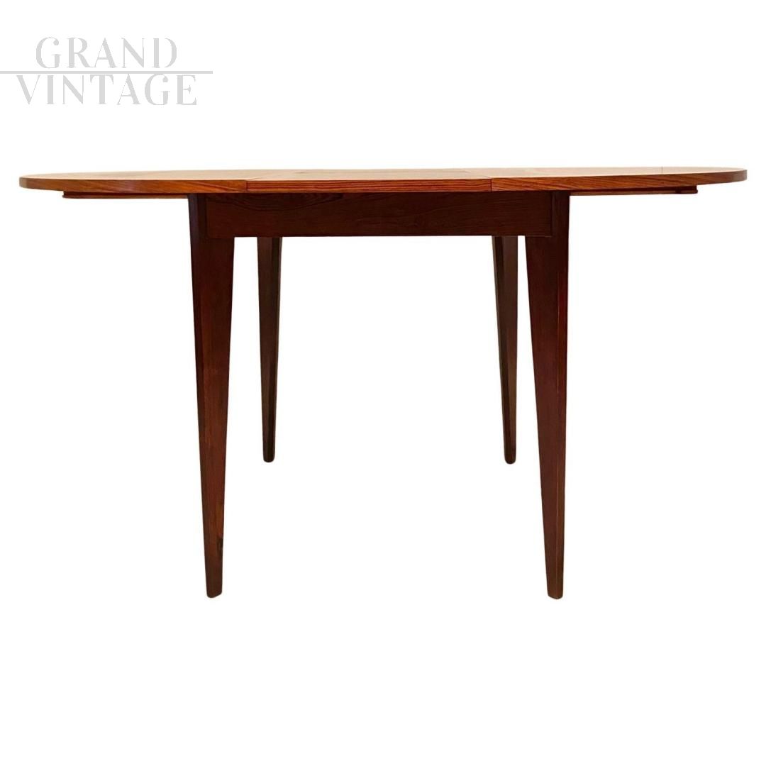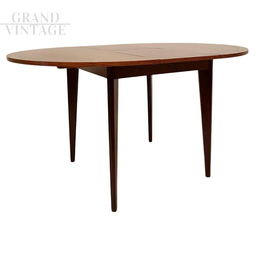 Round extendable dining table attributed to the iconic Italian company Vittorio Dassi, produced in the 1960s. The table represents an excellent example of high quality Italian modern design, with a beautiful mahogany veneered top where the wood grain creates a refined effect which rests on an elegant solid wood structure. The object has been completely restored: The structure has been reinforced and repaired. Extending mechanism works perfectly. The veneer is in perfect condition. Very good general condition, with few signs of aging.