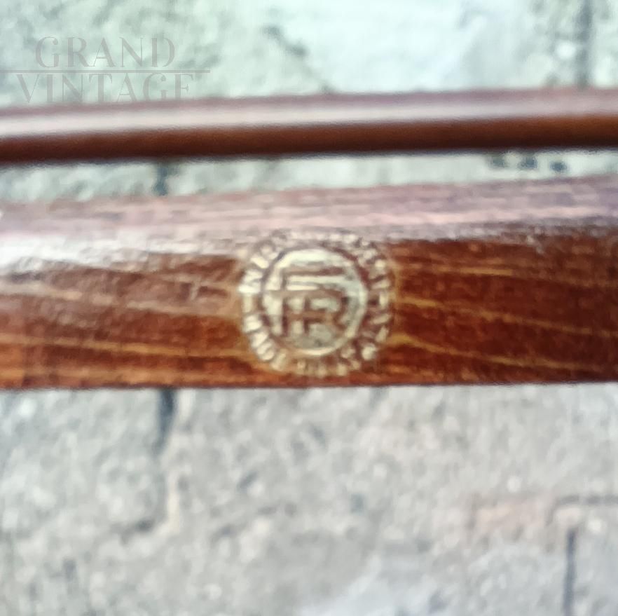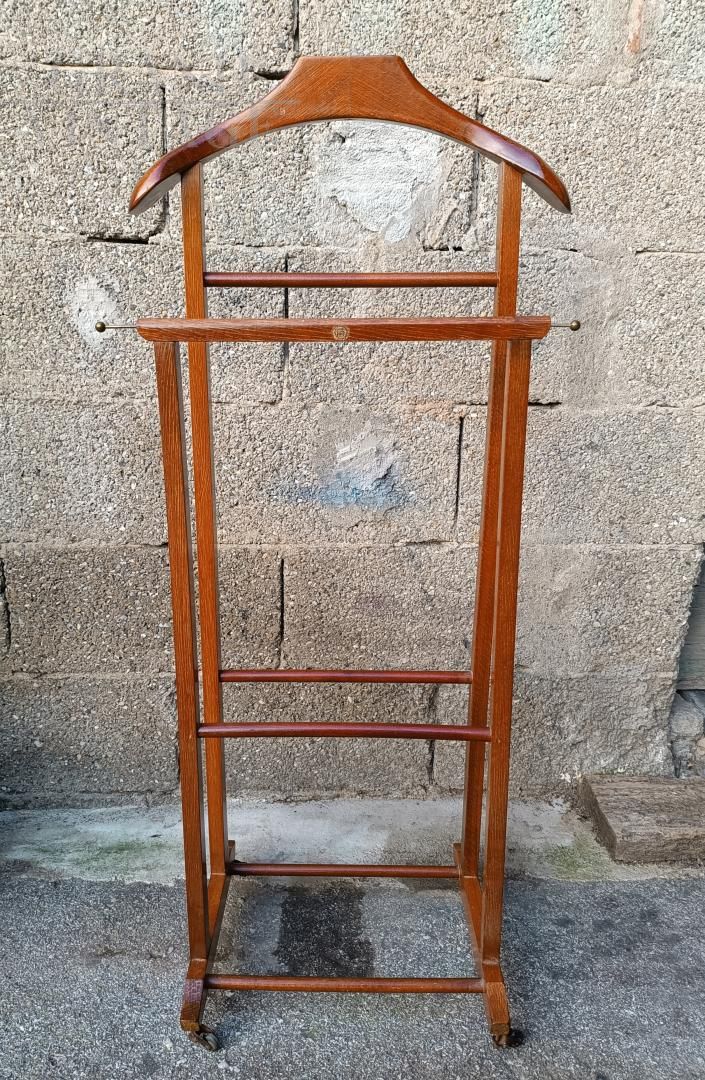 Valet stand by Fratelli Reguitti in beech wood, chestnut finish, with double vertical axis to be able to rest jacket and trousers in 2 separate stands, with retractable brass wings for ties etc. With 4 rubber wheels, to be able to move it easily. Completely disassembled thanks to 4 sturdy screws placed in the lower part, on 2 brass supports it is also possible to rest shoes. 1950s in good condition, but with some signs of aging. Manufacturer's mark present.