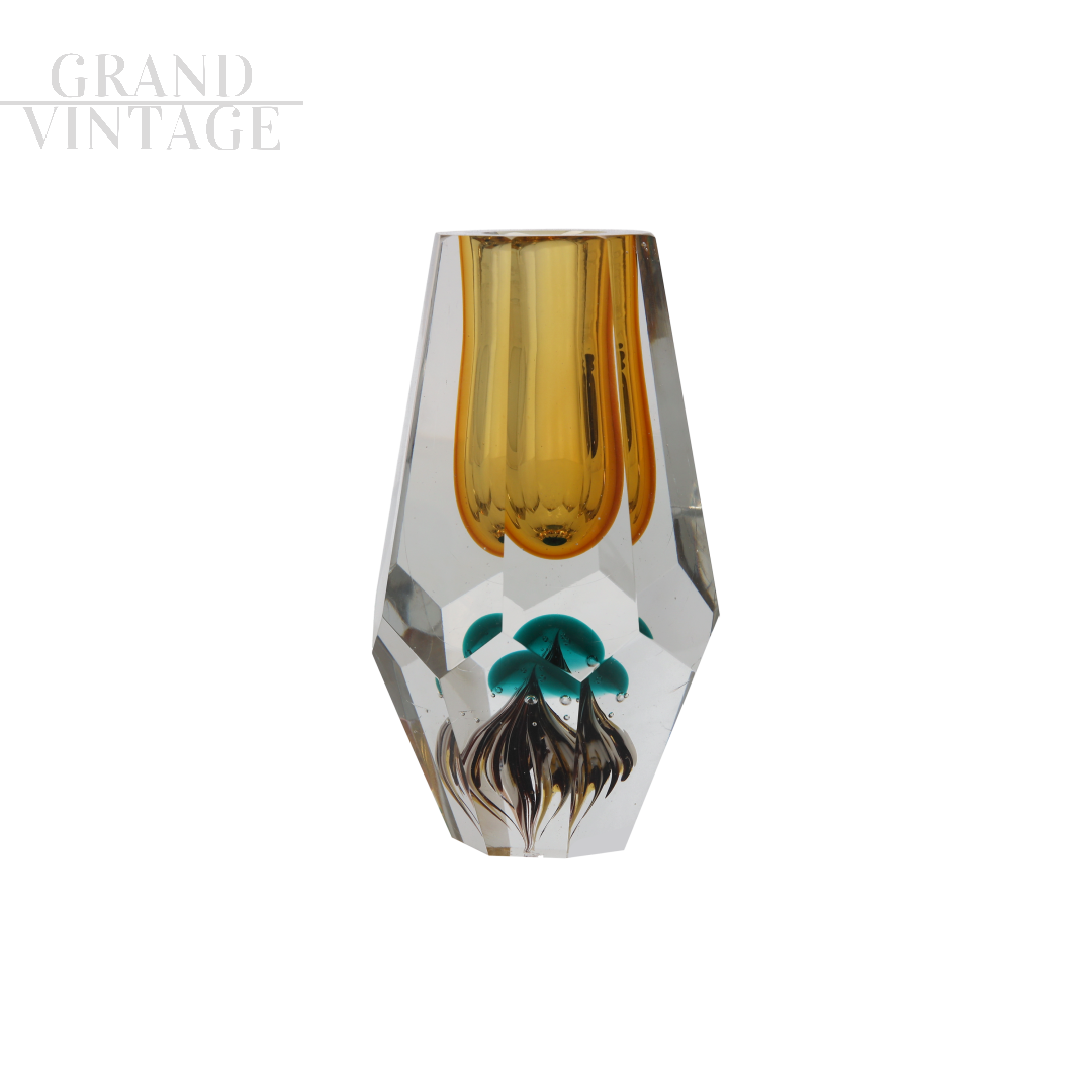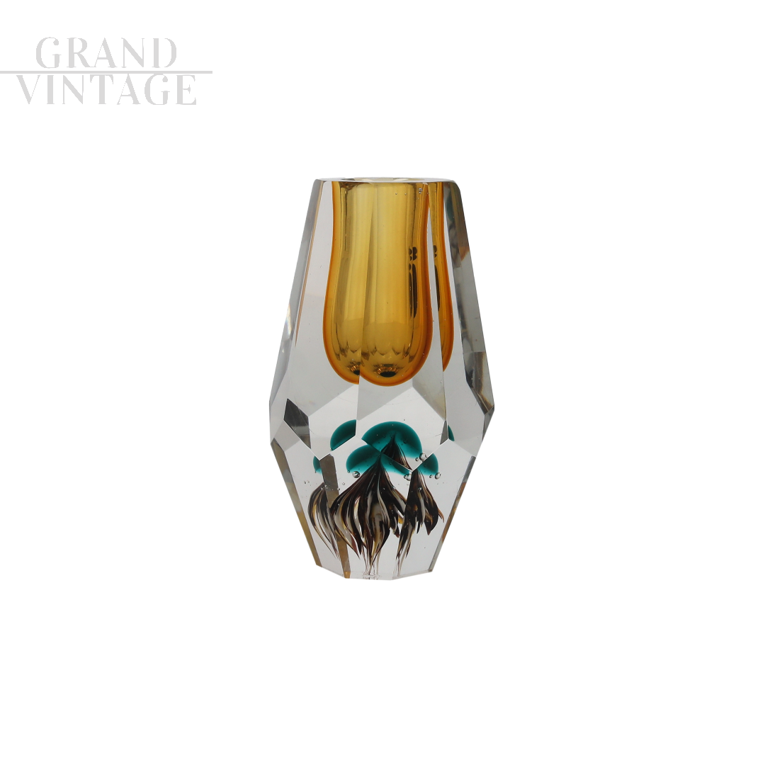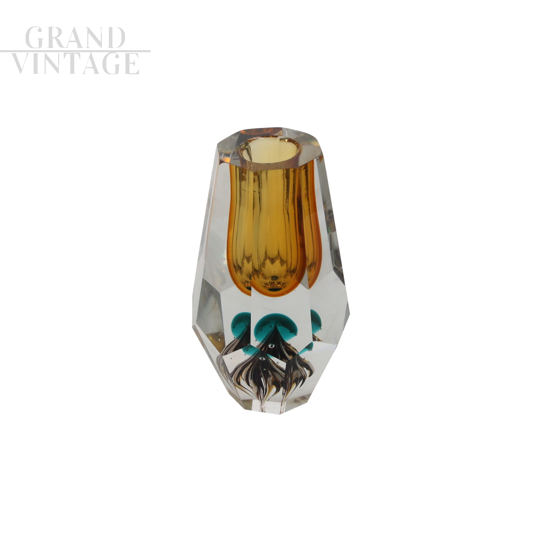 A stunning amber-colored Murano glass vase with a distinctive faceted shape and a jellyfish inside. The amber-toned upper portion creates a refined color contrast that highlights the three-dimensionality of the figure.
