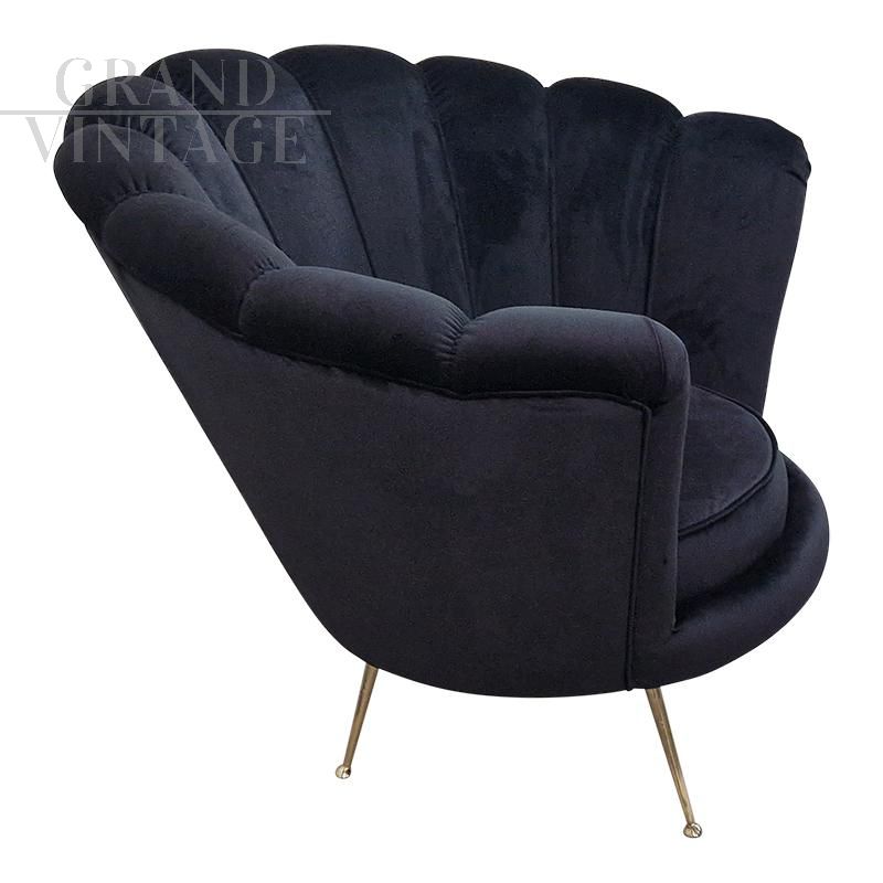 Fan-shaped design armchair in black fabric and brass