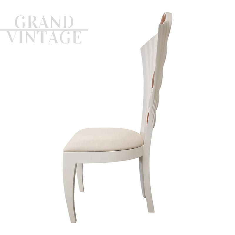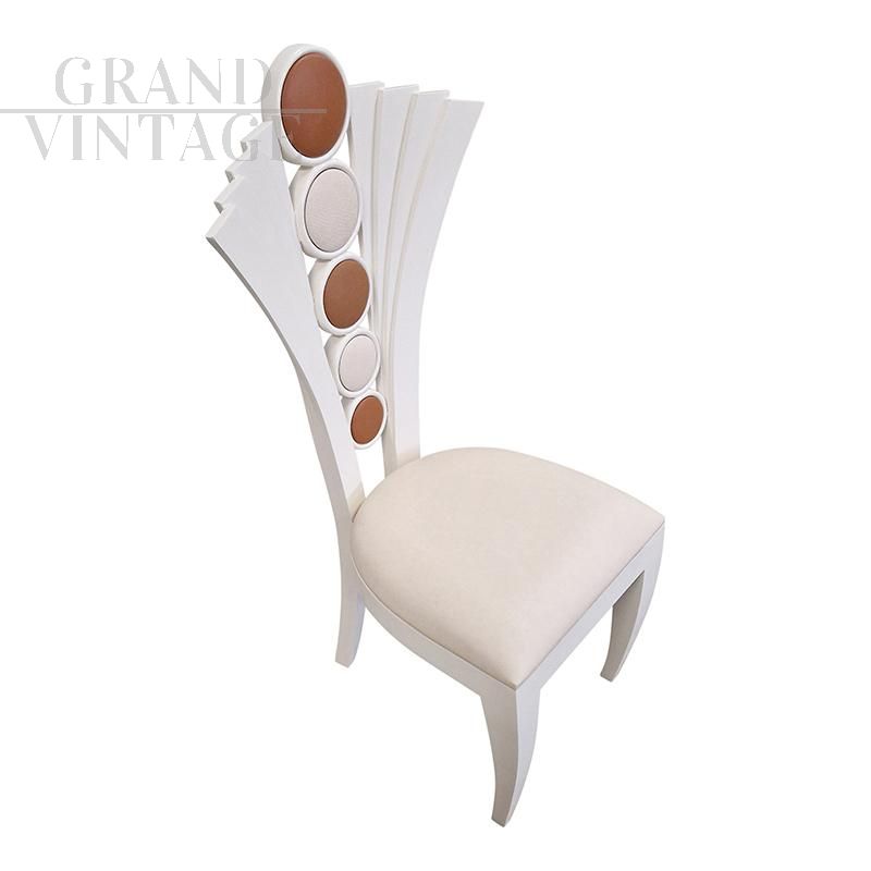 Designer chairs in ivory-coloured eco-leather with high fan-shaped backrest with colored round details and padded seat. Recently produced, several pieces available.