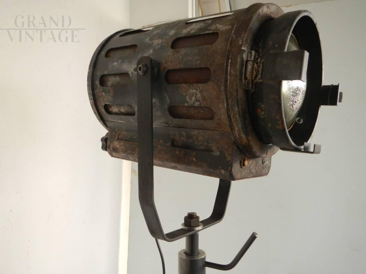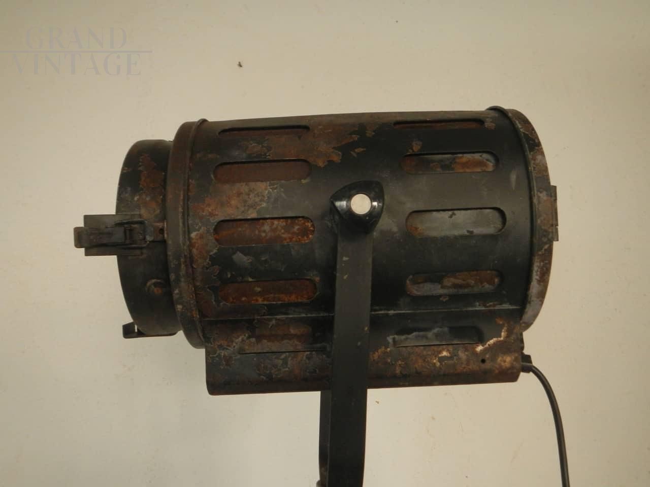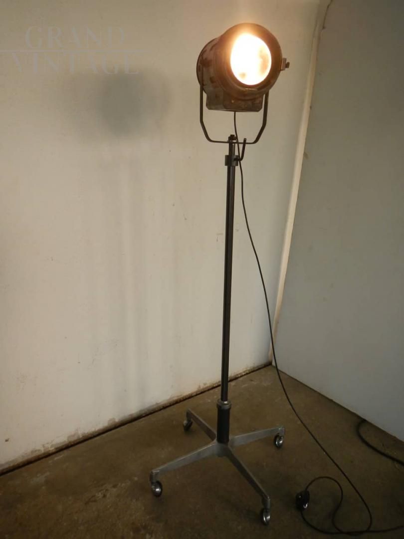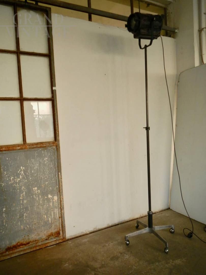 Stage sporlight from the 60s, working with E27 fitting, with adjustable support in height from 155 cm to 240 cm, with aluminum base equipped with wheels.