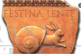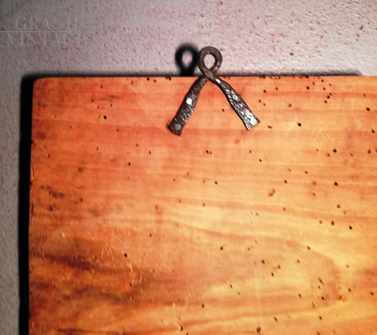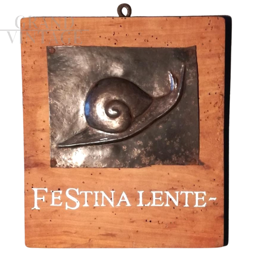 "Hostaria" sign with the writing Festina Lente, which translates as "make haste slowly", made at the beginning of the 20th century in heavy metal with a snail figure in relief mounted on a solid wood panel. There are many signs of woodworm, however an anti-woodworm treatment has been carried out. The white writing is more recent.