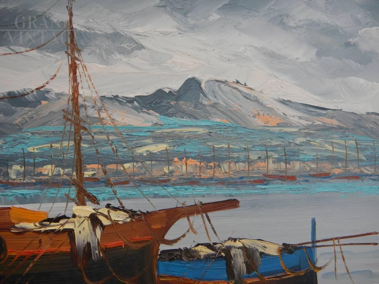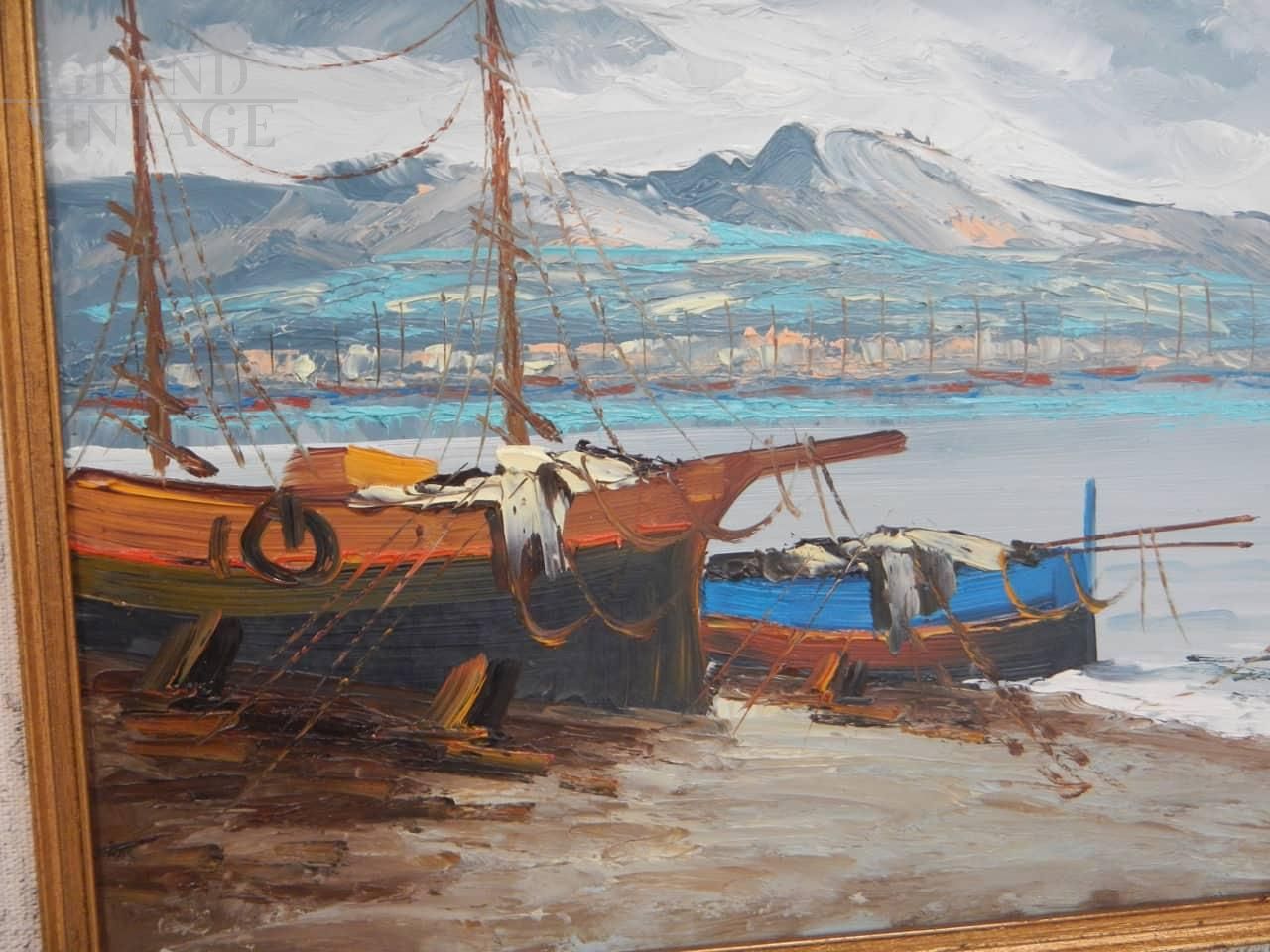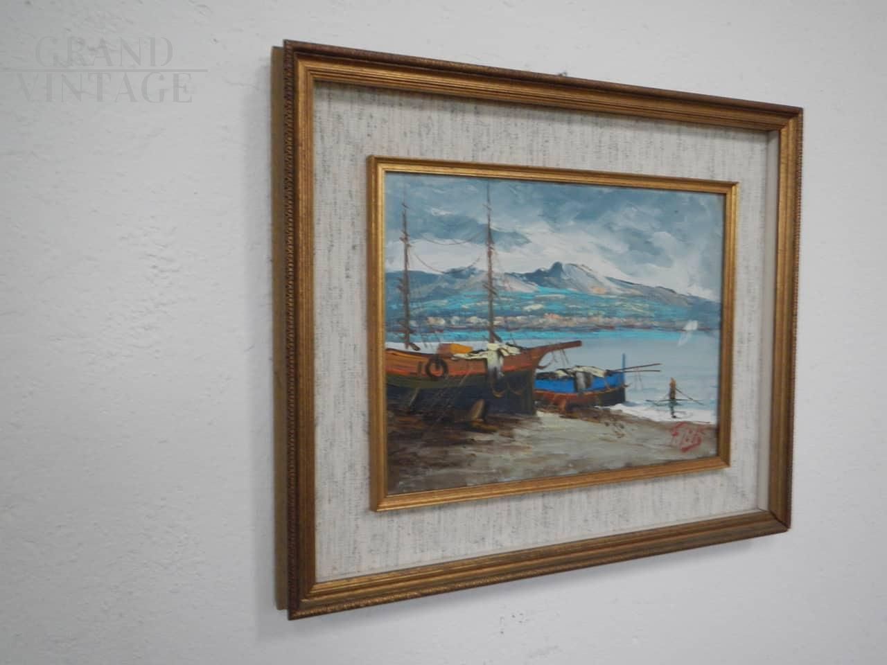 Beautiful painting of an Italian seaside panorama with boats on the beach, oil on canvas signed Filito with master authentication, complete with double frame.