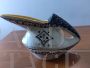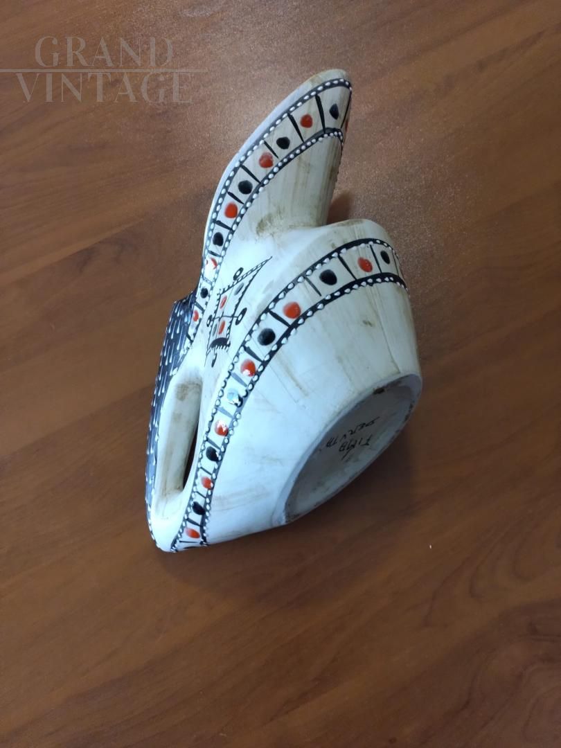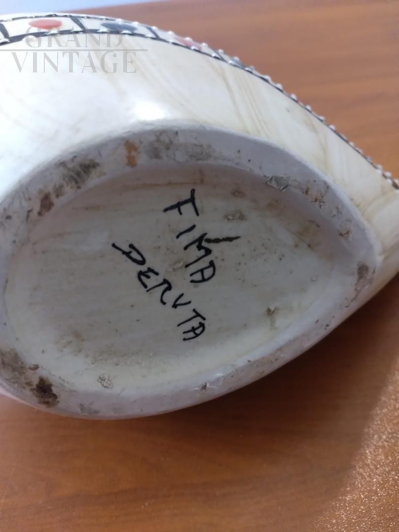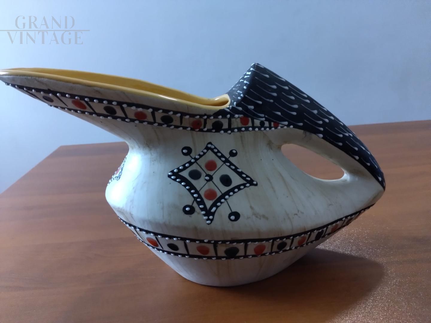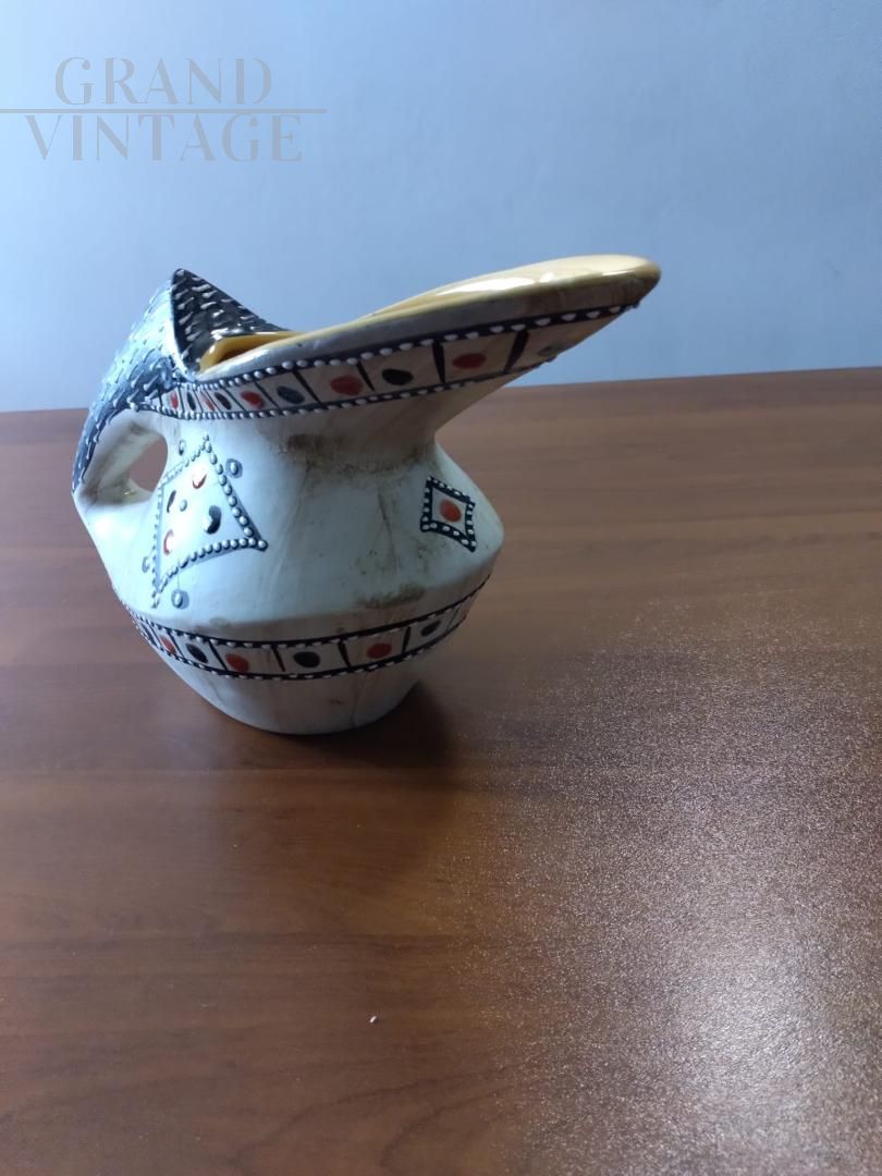 Jug pourer vase in Fima Deruta majolica ceramic, Italy 1956, hand decorated with stylized figures and glossy enamels in relief.