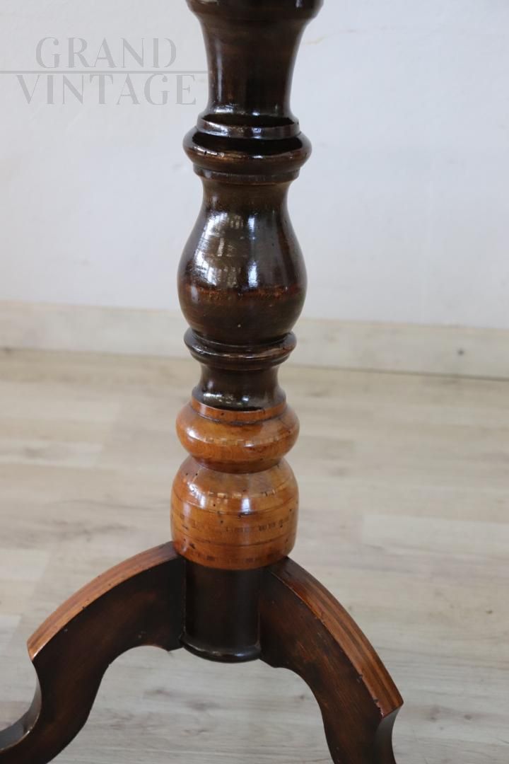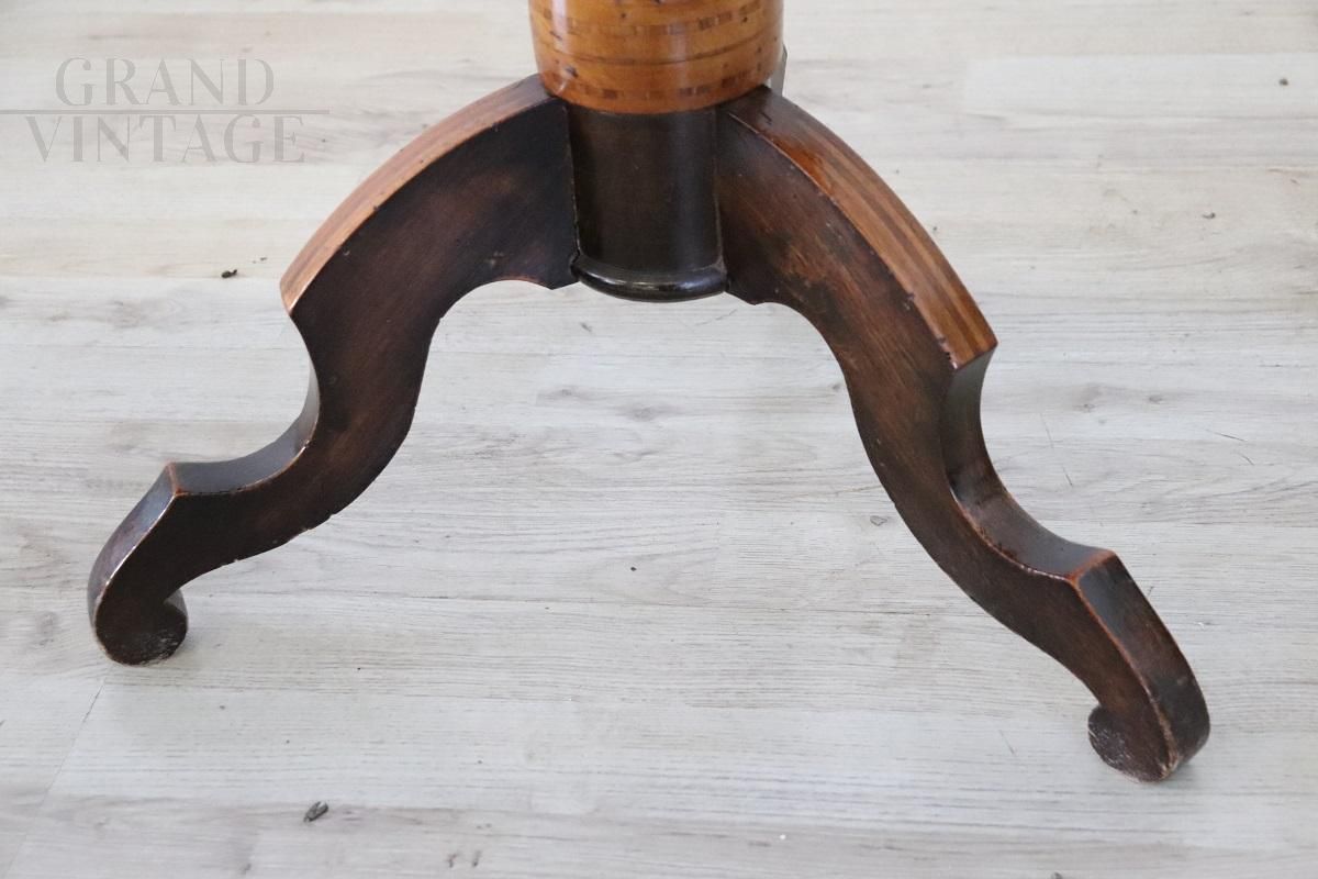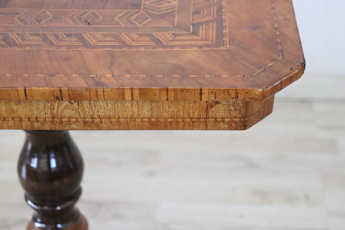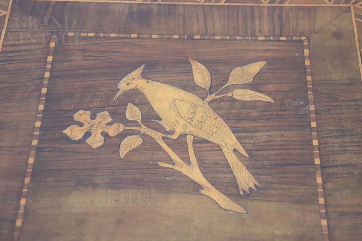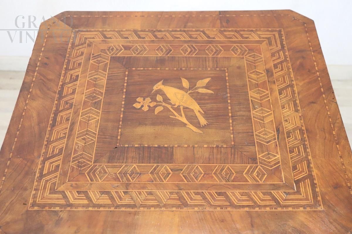Fine inlaid walnut side table from the mid-19th century, with a square top supported by an elegant turned central stem supported by three feet. The table is characterized by a refined inlay decoration made with small pieces of precious woods of different essences. The decoration of the top is grandiose with geometric elements and a little bird in the center. Typical side table from the famous Rolo factory (Reggio Emilia) made famous for its precious inlay works. A small but precious antique table that can be used in every room of the house. Used, in perfect condition, excellent price negotiable.
