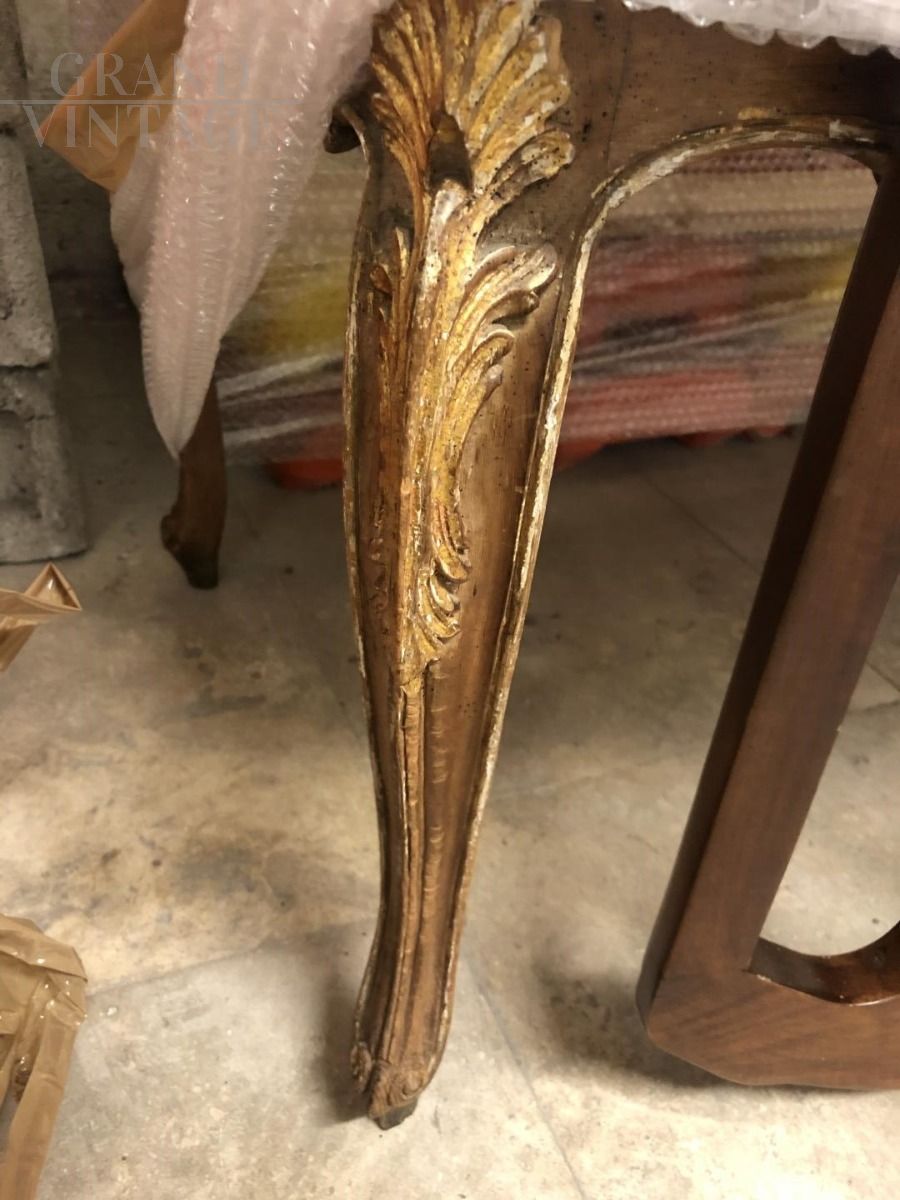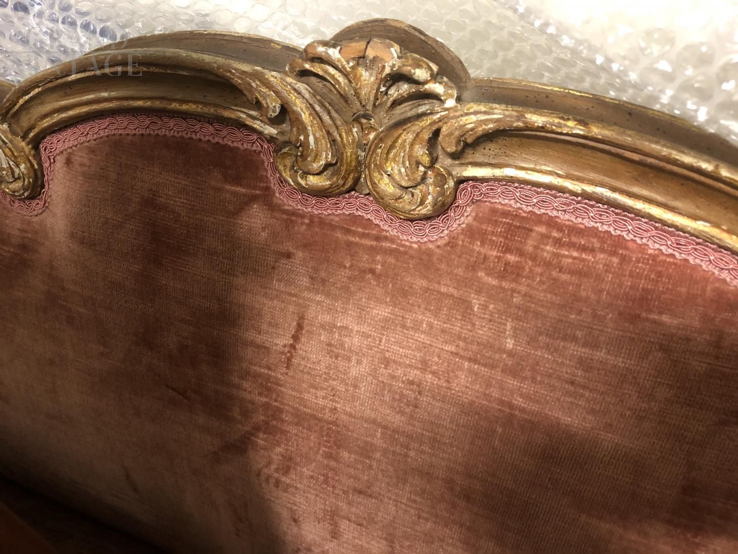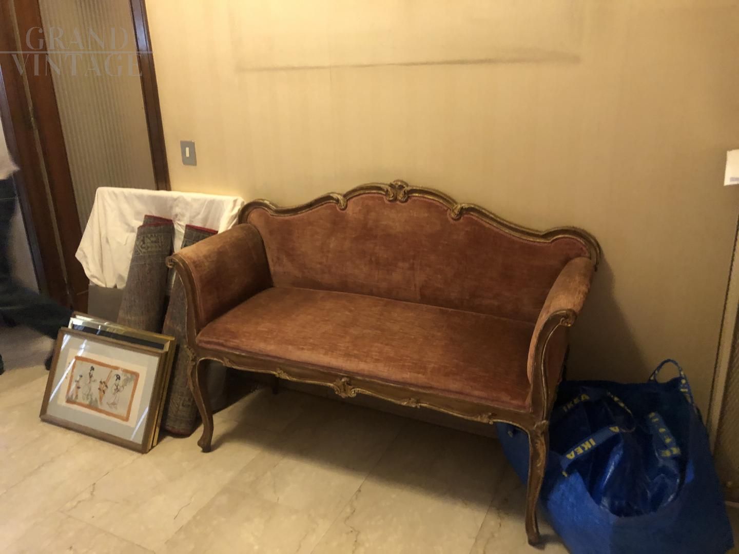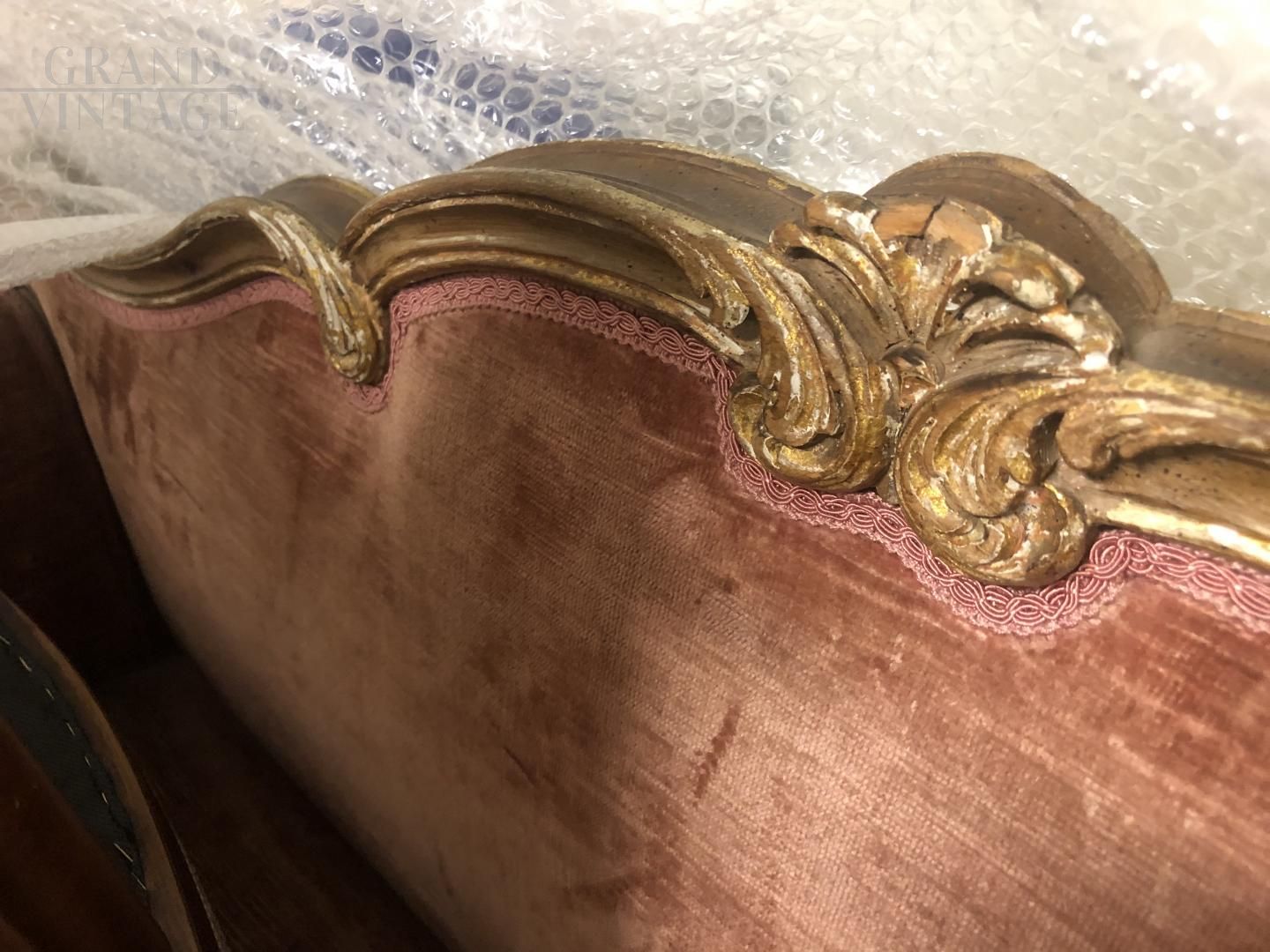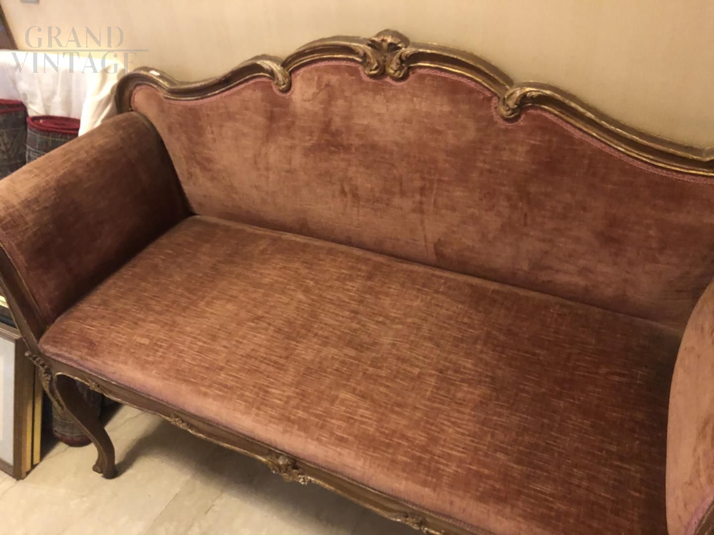 Small size sofa in finely carved wood, upholstered in antique pink velvet.