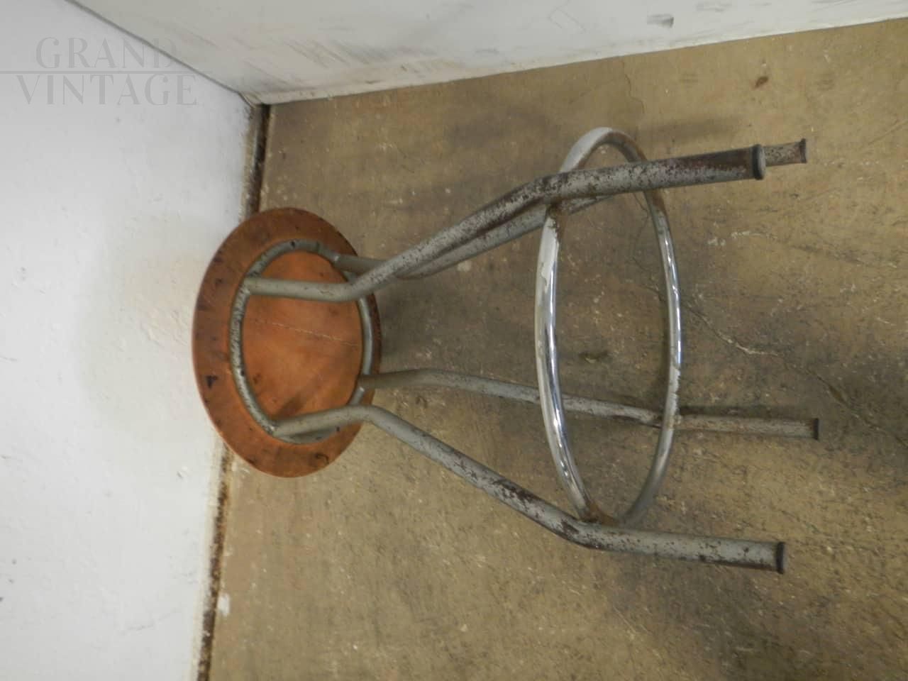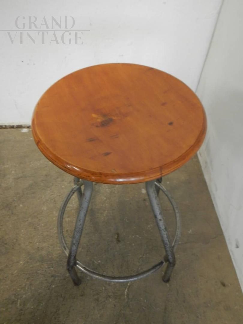 Industrial vintage fixed low stool with 4-legged iron structure with footrest and seat in beech wood. Clean and working, in good condition with natural signs of use.