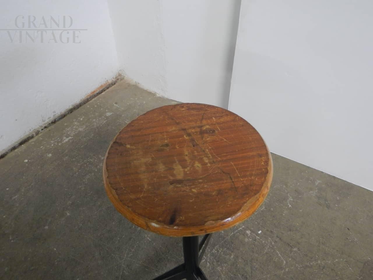 Vintage industrial stool with three legs, a fixed black iron frame, and a round beech wood seat. The stool does not swivel or adjust as the mechanism is not working. The fixed height is 59 cm. The seat shows natural signs of wear.