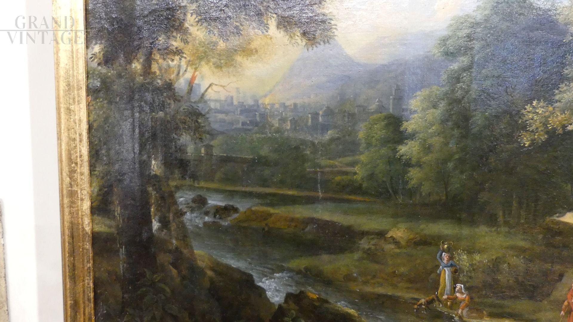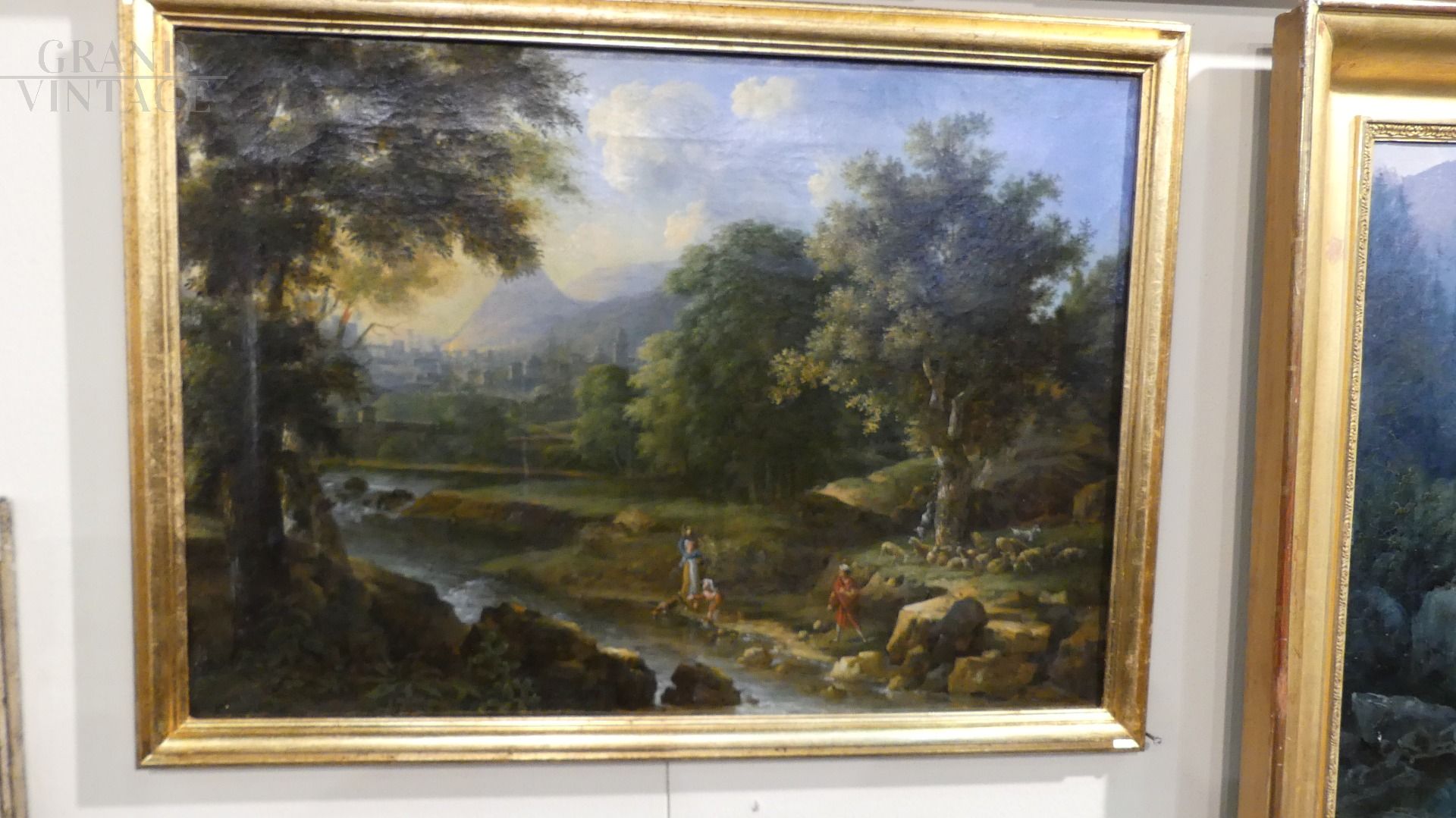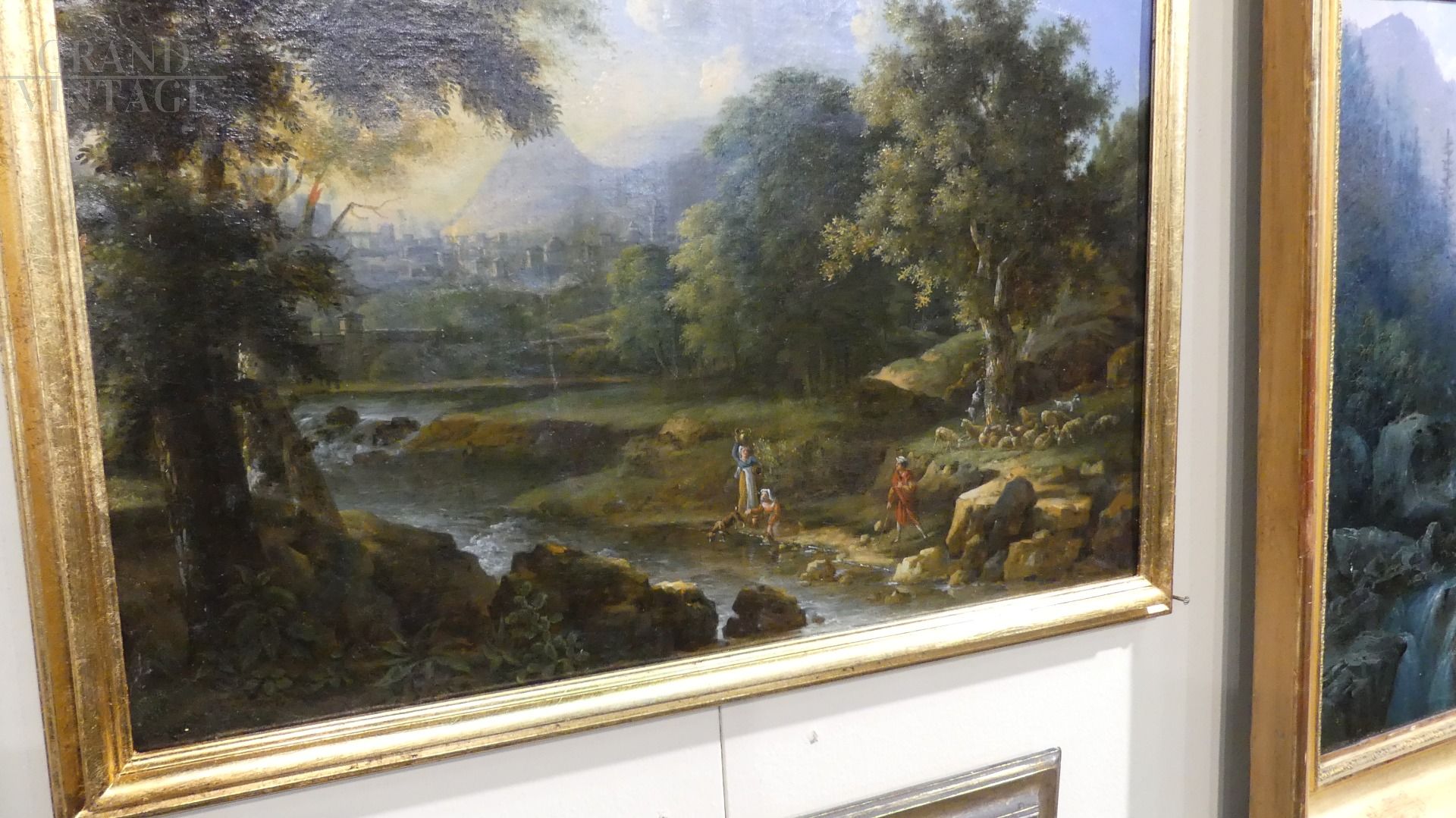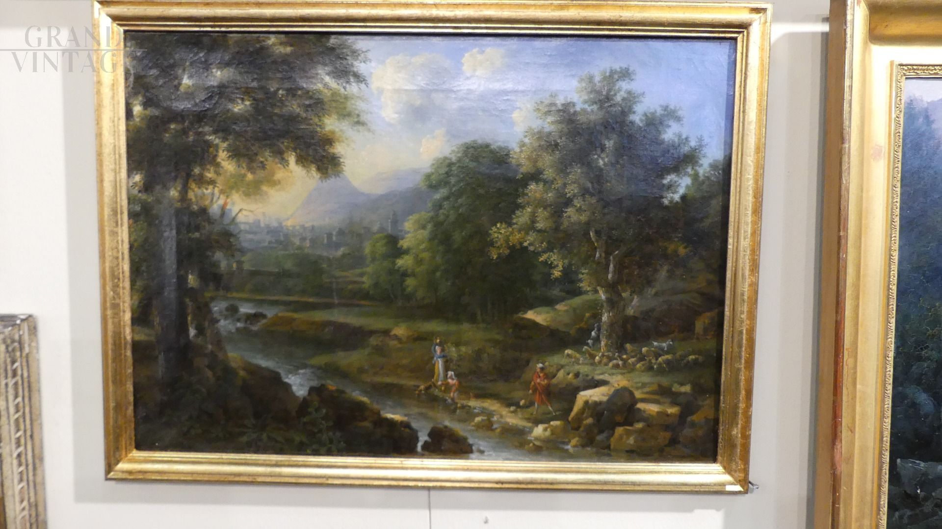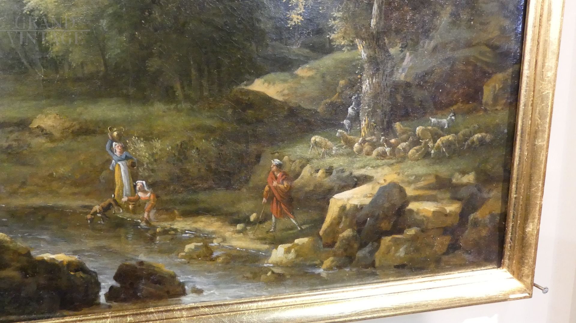 Late 18th century Flemish style painting with mountain landscape with characters and flock at the river, oil on canvas.