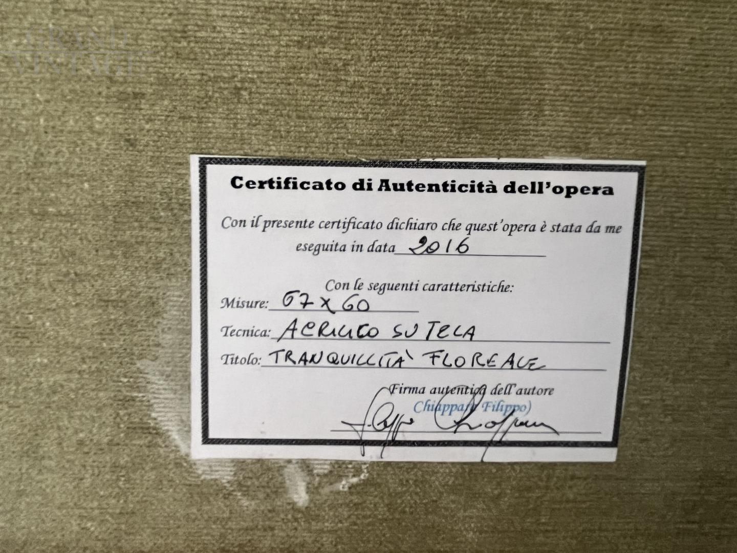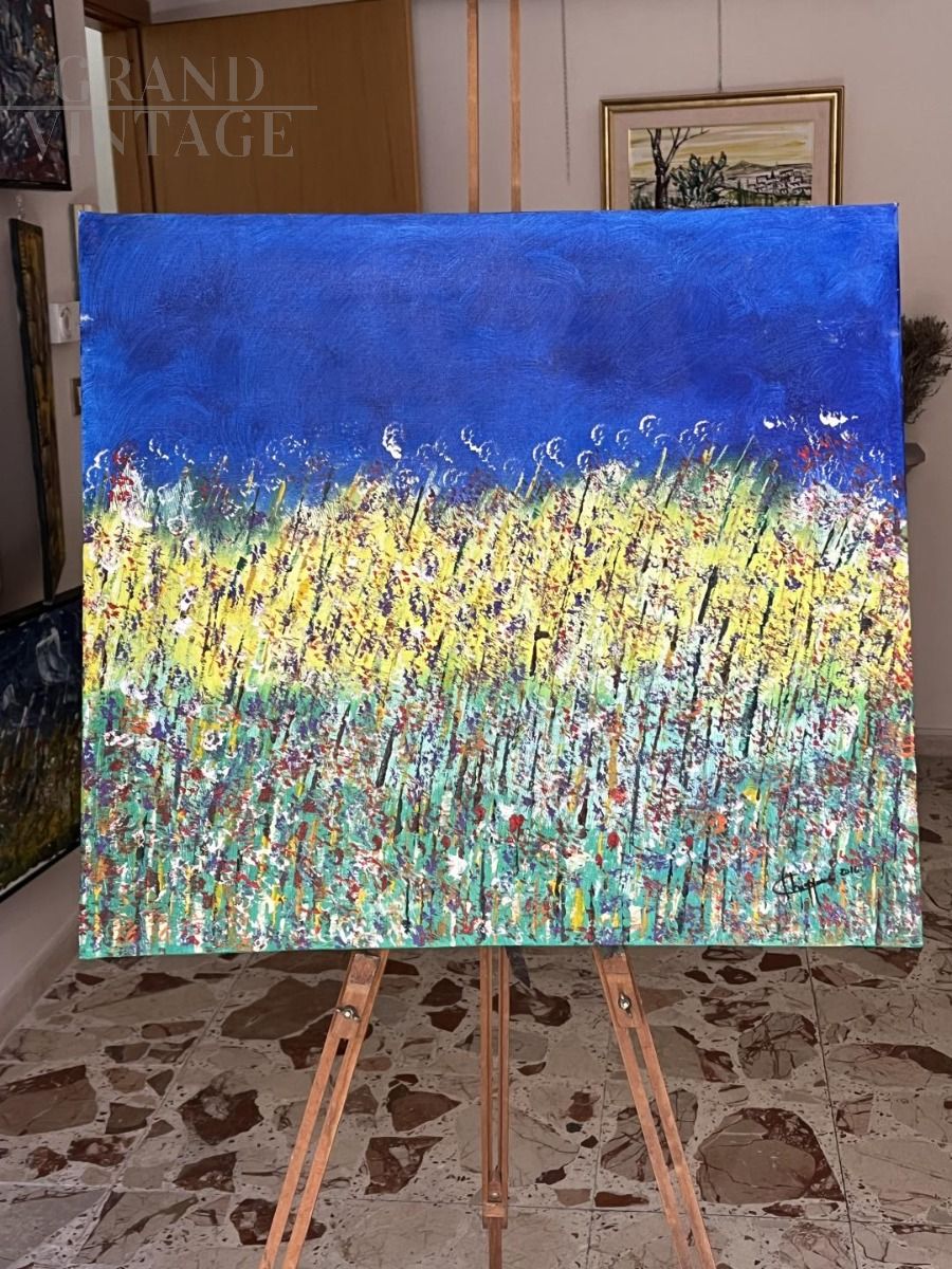 "Floral Tranquility" is a painting created in acrylic on canvas by the Italian pantastract painter Filippo Chiappara (1962). A valuable work with bright colors capable, thanks to the artist's talent, of projecting the observer into a field of flowers, enriched with various species of flowers with intense and warm colors. The painting was exhibited in 2016 in Orvieto and Cagliari at the "Punti di Vista Tour" exhibition and is equipped with a certificate of authenticity signed by the artist himself. Measurements of the work: 67x60 cm Work signed by the artist on both the front and the back. Ideal for decorating any environment.