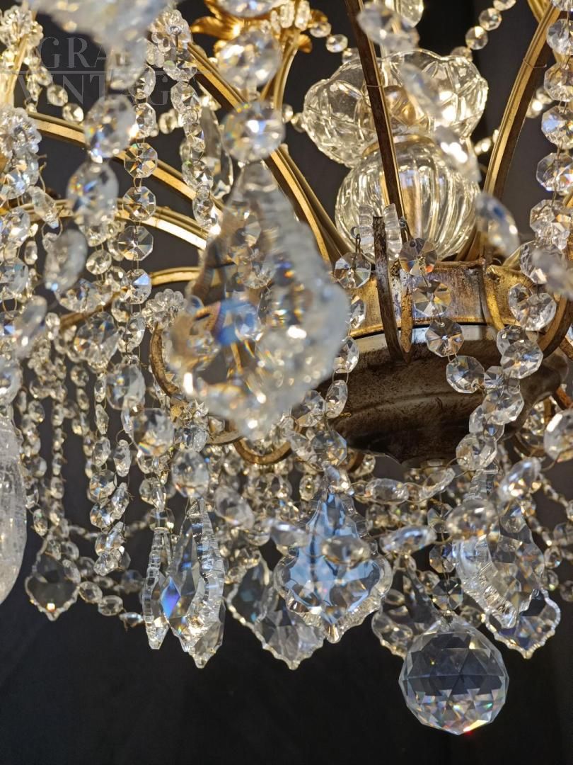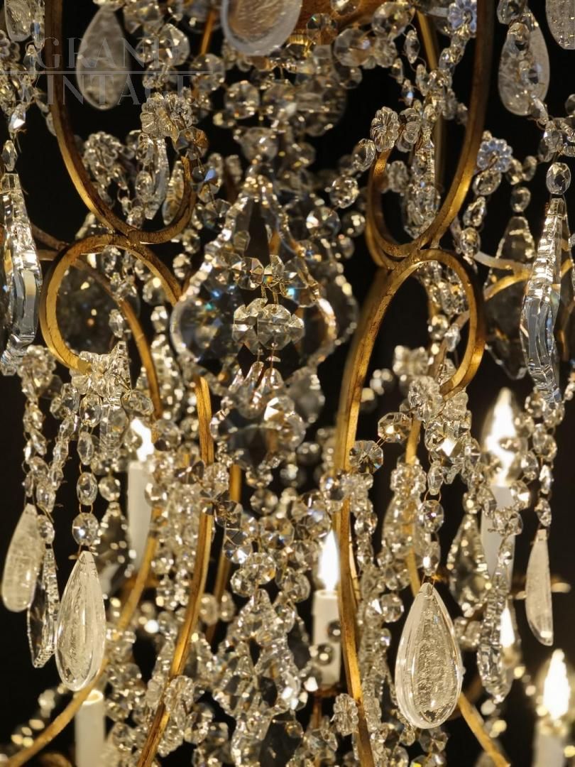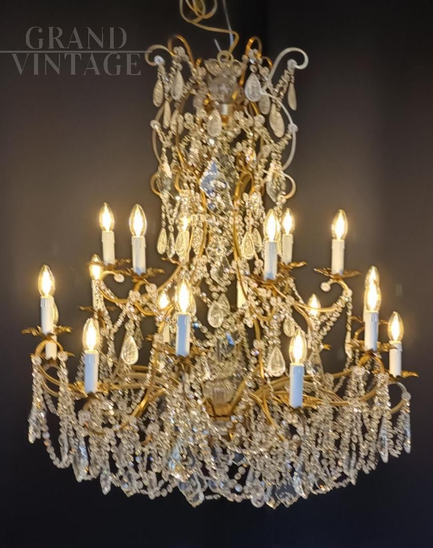 Florentine style crystal chandelier with 18 lights, ready to be installed, finely finished, handmade with handmade crystal bindings with brass wire. Antique gold finish.