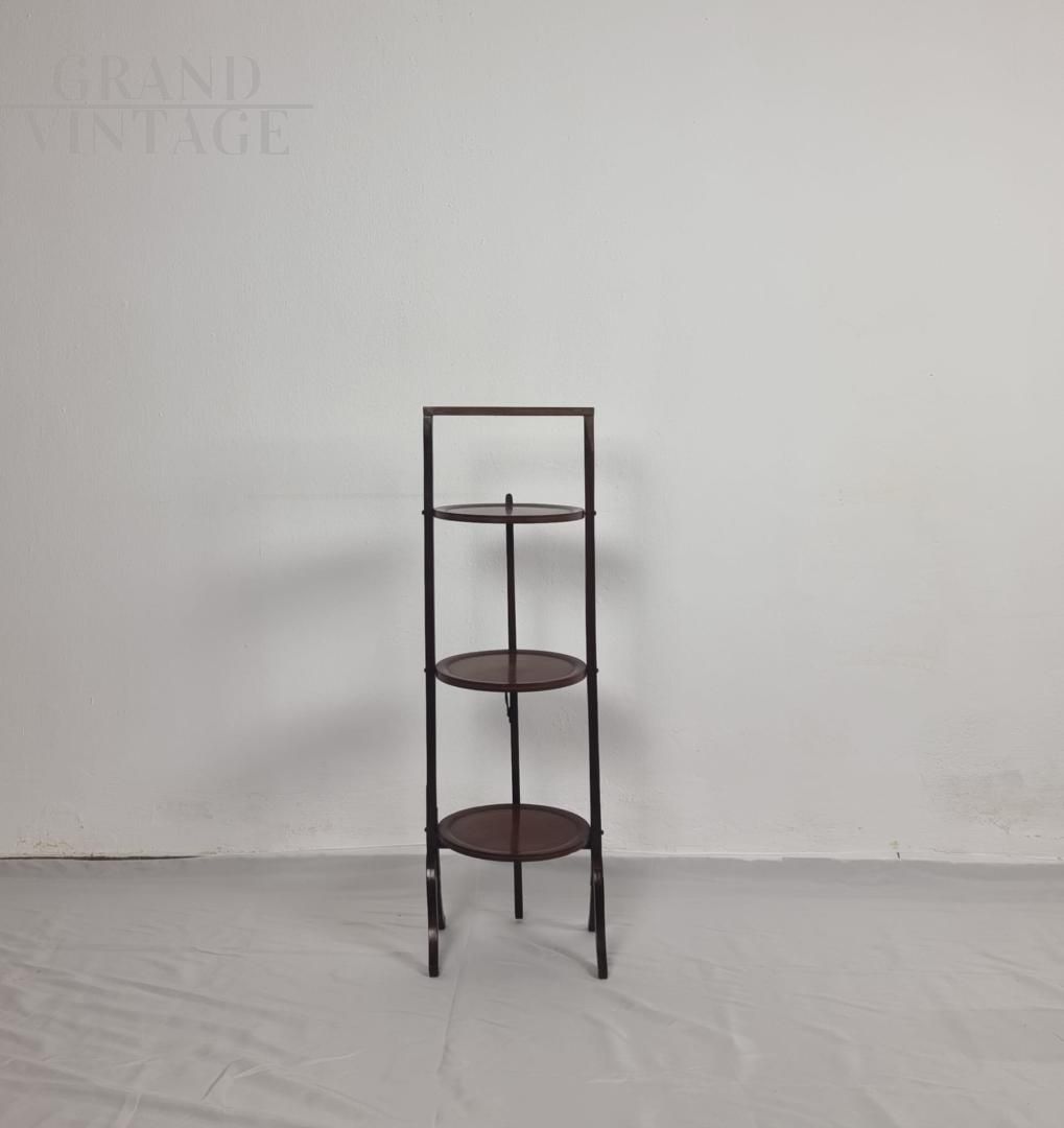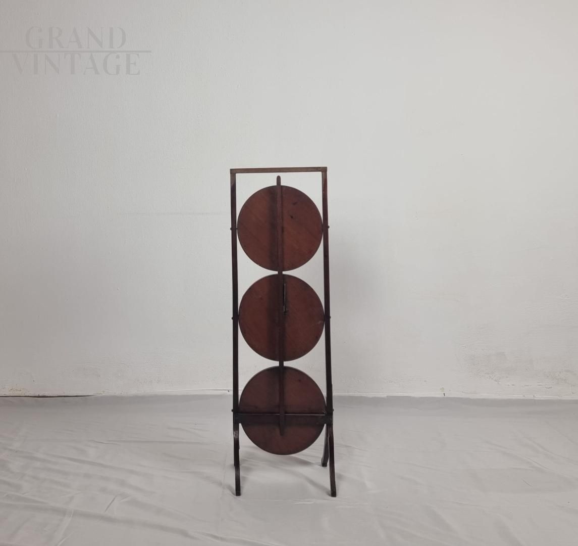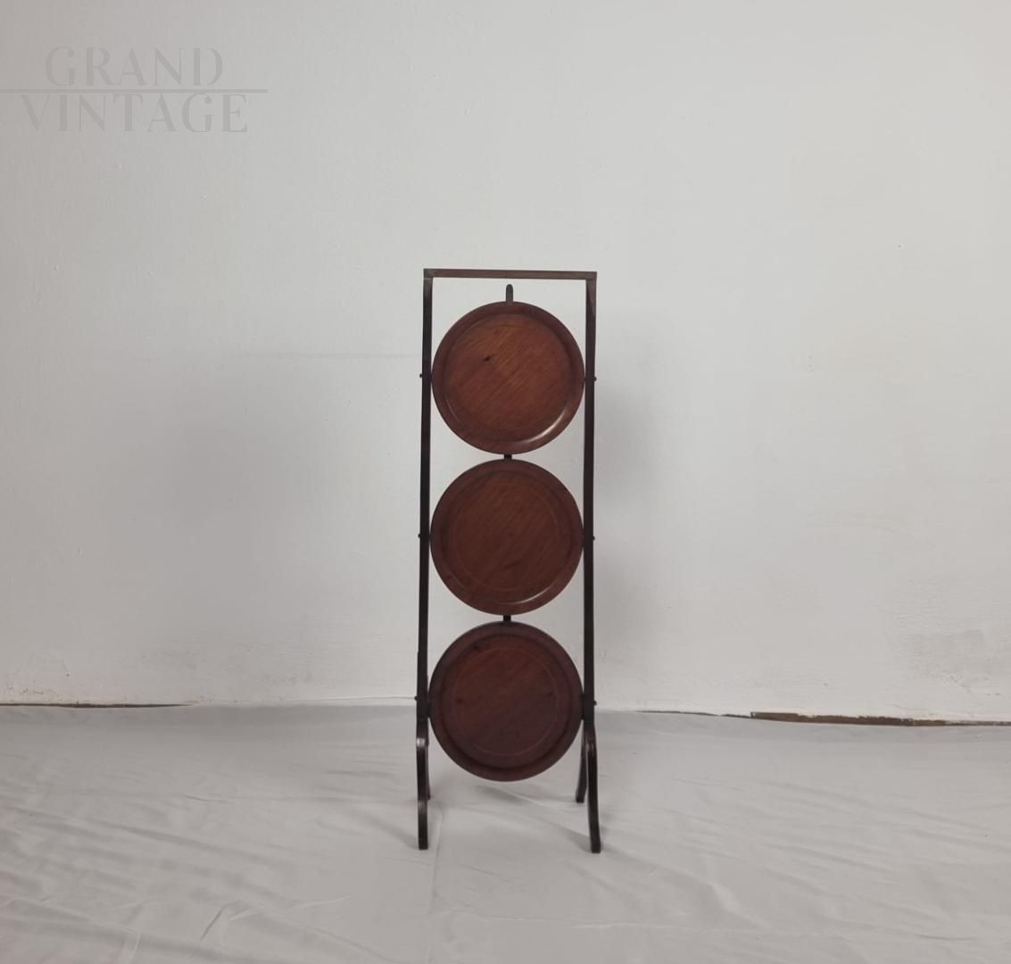 Antique mahogany foldable valet stand serving table for cakes, 1930s, with three folding shelves.