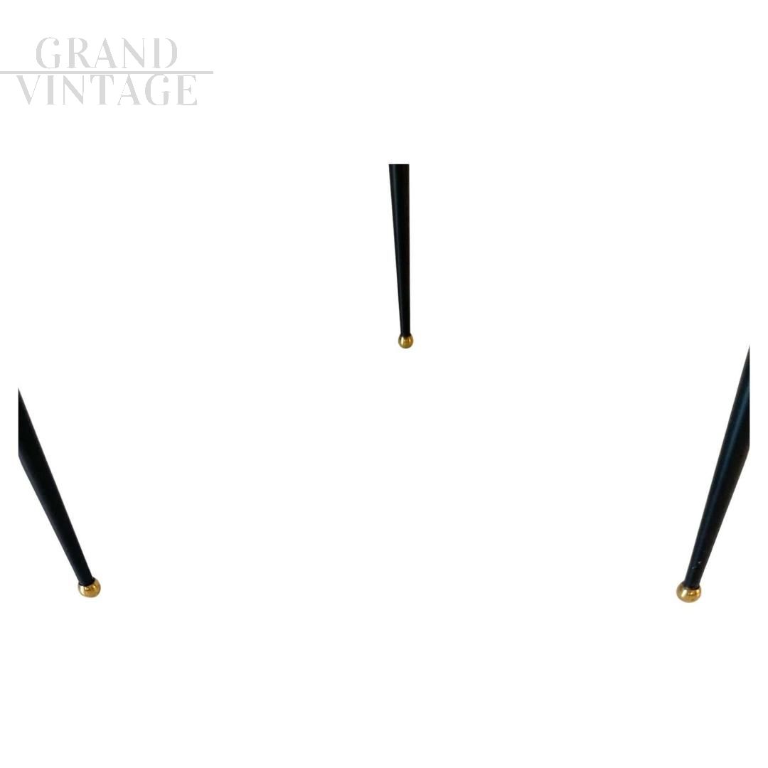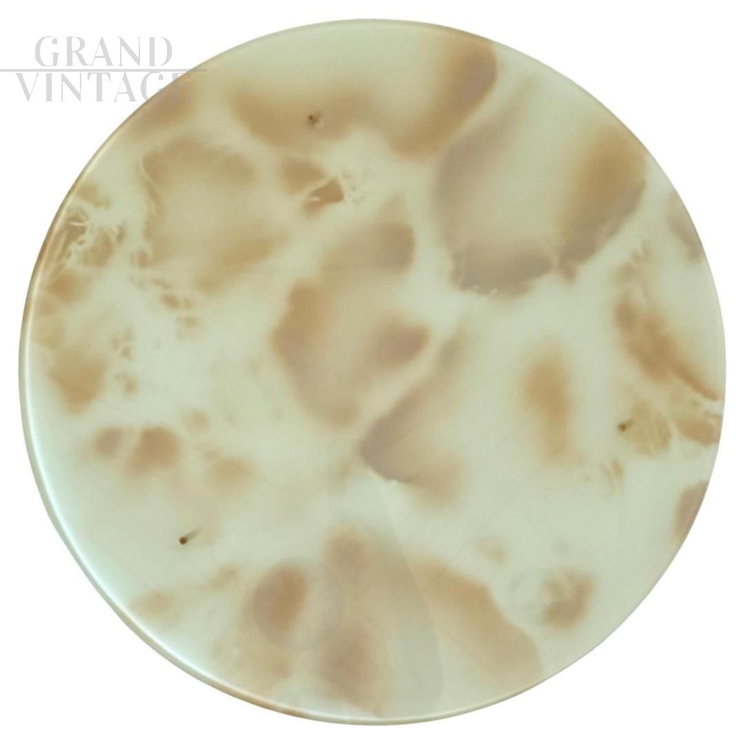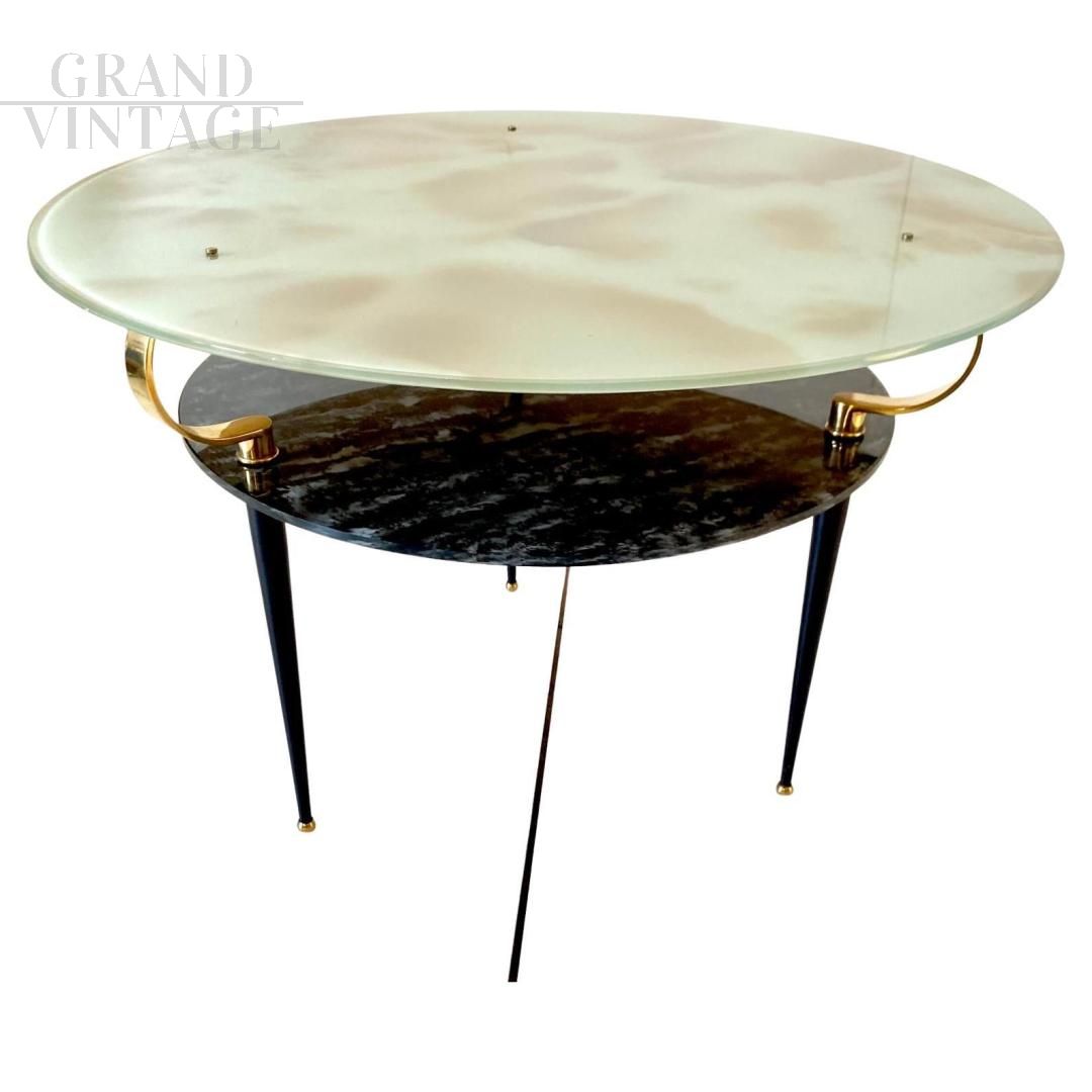 Refined vintage round coffee table in Fontana Arte style with double glass top with marble effect and brass and iron structure, Italy 1950s. Rare double glass top with marble-like motif with refined brass arm between the two tops. Restored by our team: the legs have been painted to the original color, the brass has been polished. No cracks or damage on the glass parts. In very good condition with only small natural signs of aging.