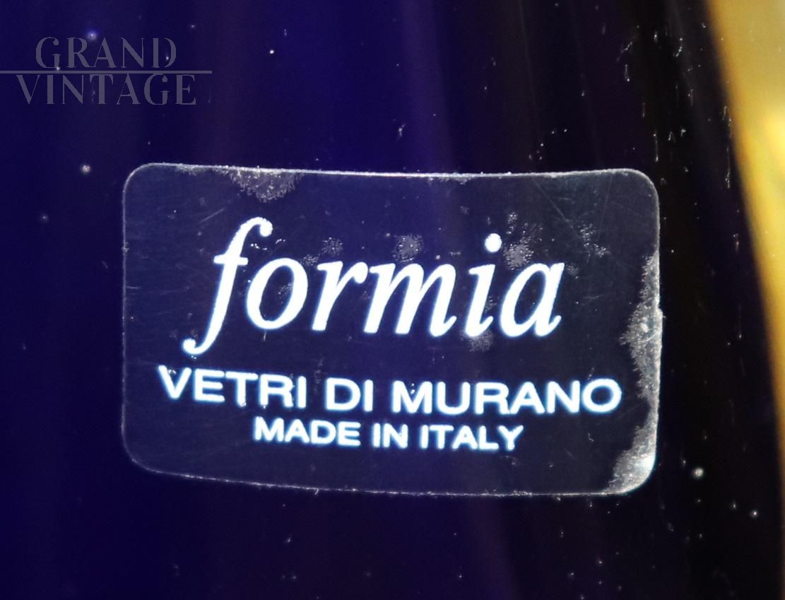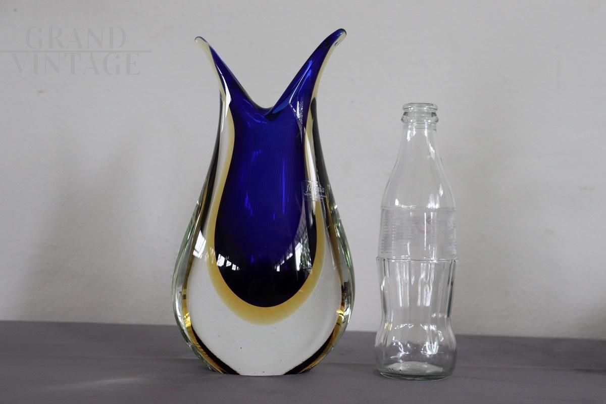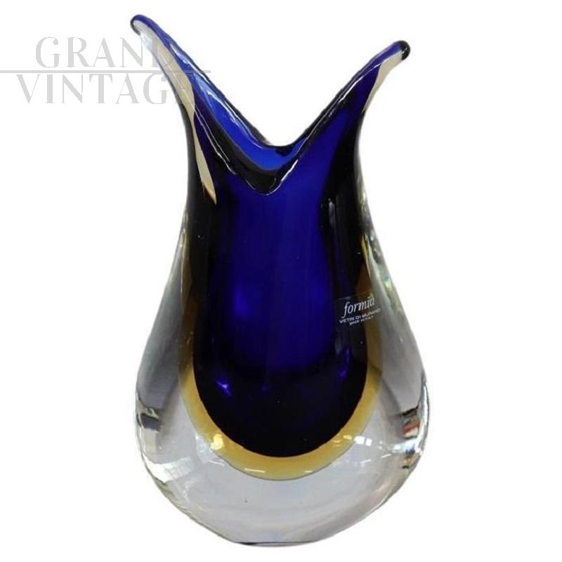 Formia vase in Murano artistic glass made with the submerged glass technique in shades of blue and yellow, Italian design from the 1970s. A beautiful vase with intense colours, blue has a unique quality and intensity. The presence of the original vintage label is a true rarity. Made by Formia, a historic Murano glassmaker that created important vases with an iconic design. This vase is made of thick glass, is extremely decorative and is made using the submerged glass technique. The processing technique called submerged glass will become an excellent technique performed by superimposing different layers of glass with different consistencies and colors. The multicolor effect is impressive! This precious vase is a true work of art. Price negotiable.