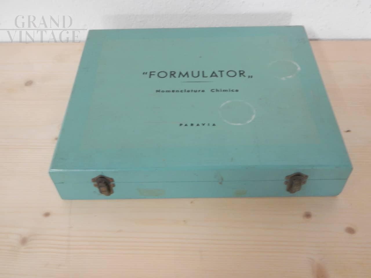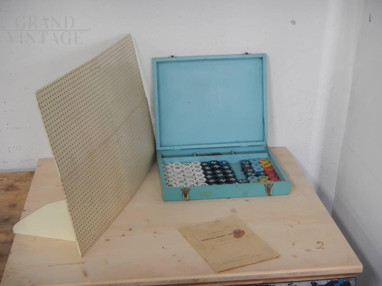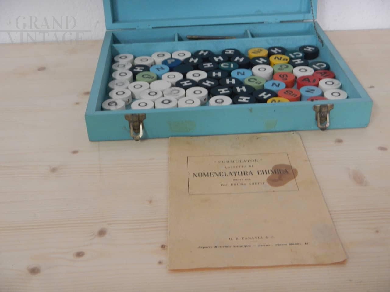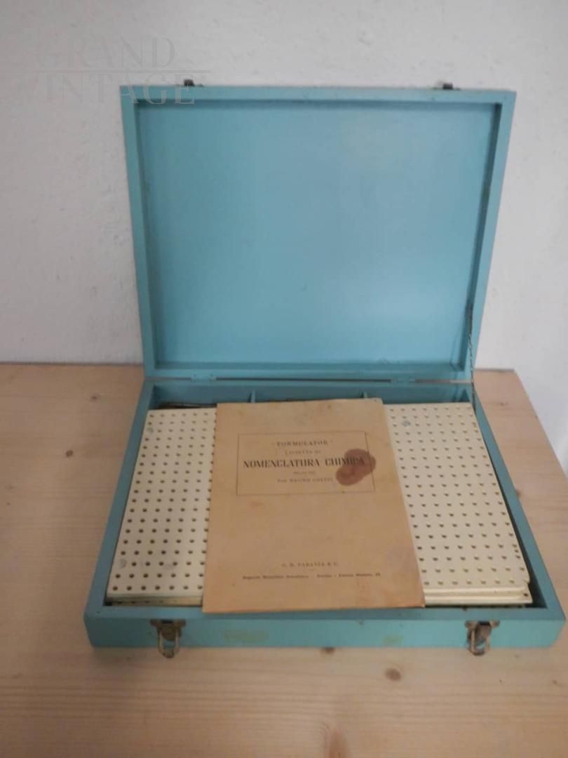 Briefcase with game for teaching chemical nomenclature and bonding designed by prof. Ghetti, ed. Paravia Torino, in colored fir wood with closure. Complete with discs, support pins, rods and support tablet. With information leaflet on use. In good condition.