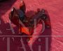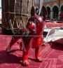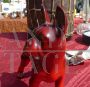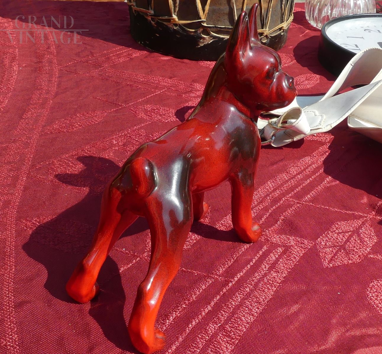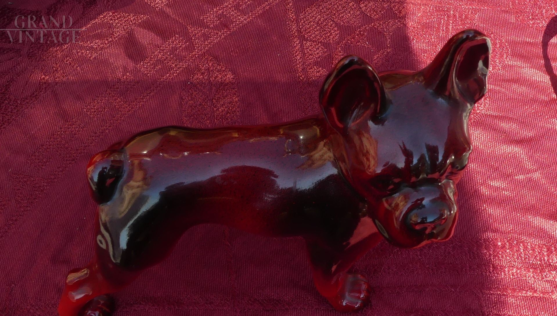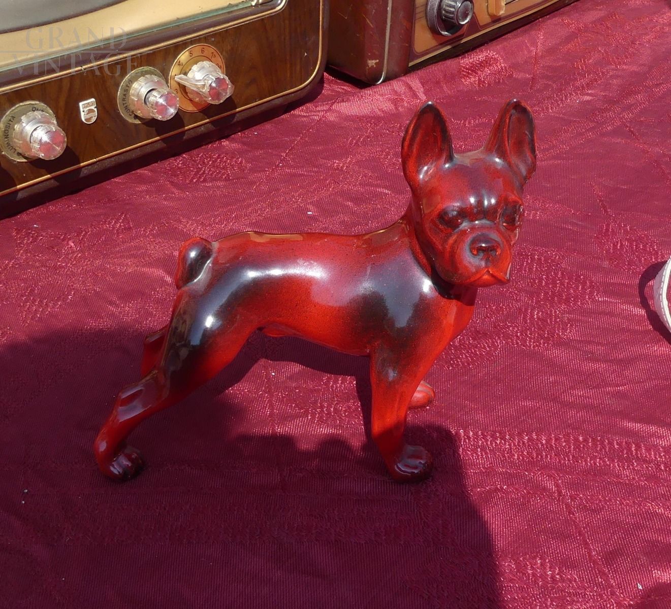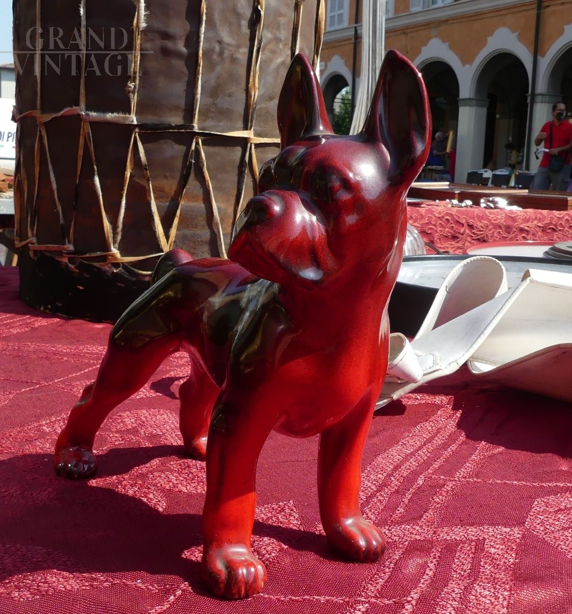 Burgundy red ceramic figurine depicting a French bull dog, made by Fornasetti in the 70s.