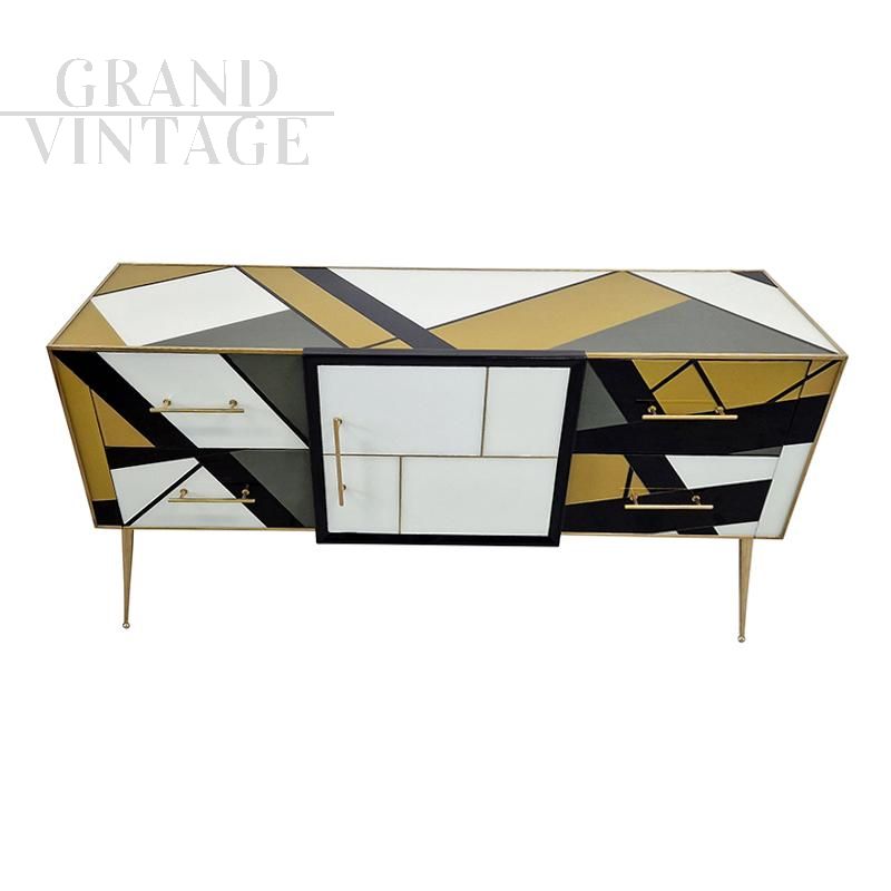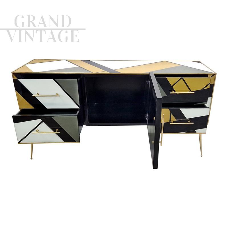 Design wooden sideboard with geometric Murano glass covering in 4 colours: ocher yellow, white, black and grey, composed of four drawers (two on the right and two on the left) and a central door, entirely handmade. Black lacquered central door frame; profiles, handles and feet in golden brass.